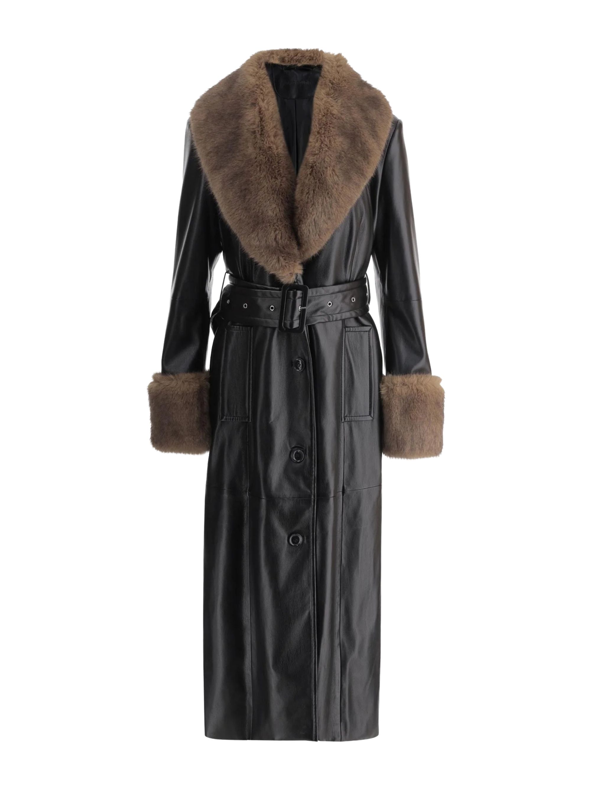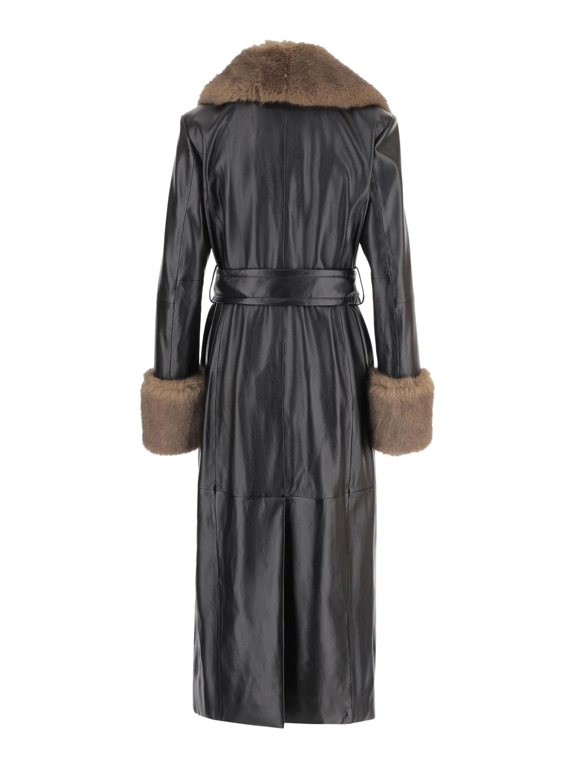 Estella coat by STAND STUDIO in black faux leather, featuring a front fastening with a belt at the waist, a wide collar and fur-trimmed cuffs.