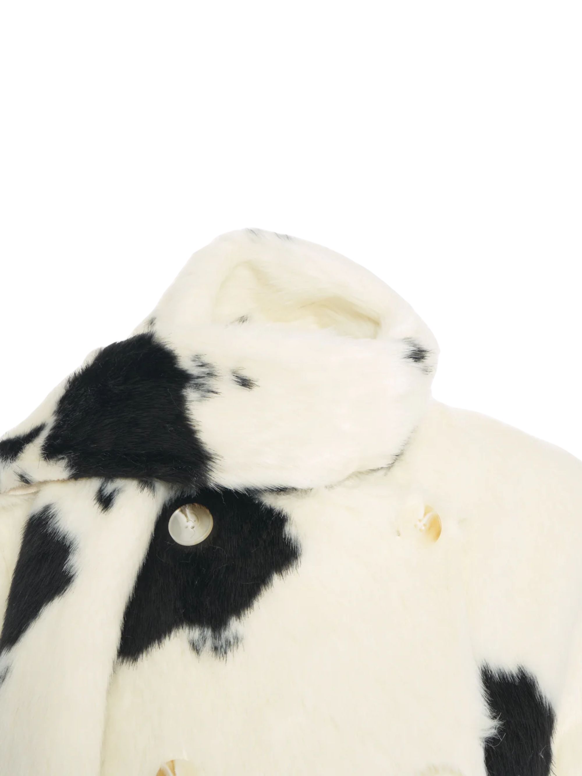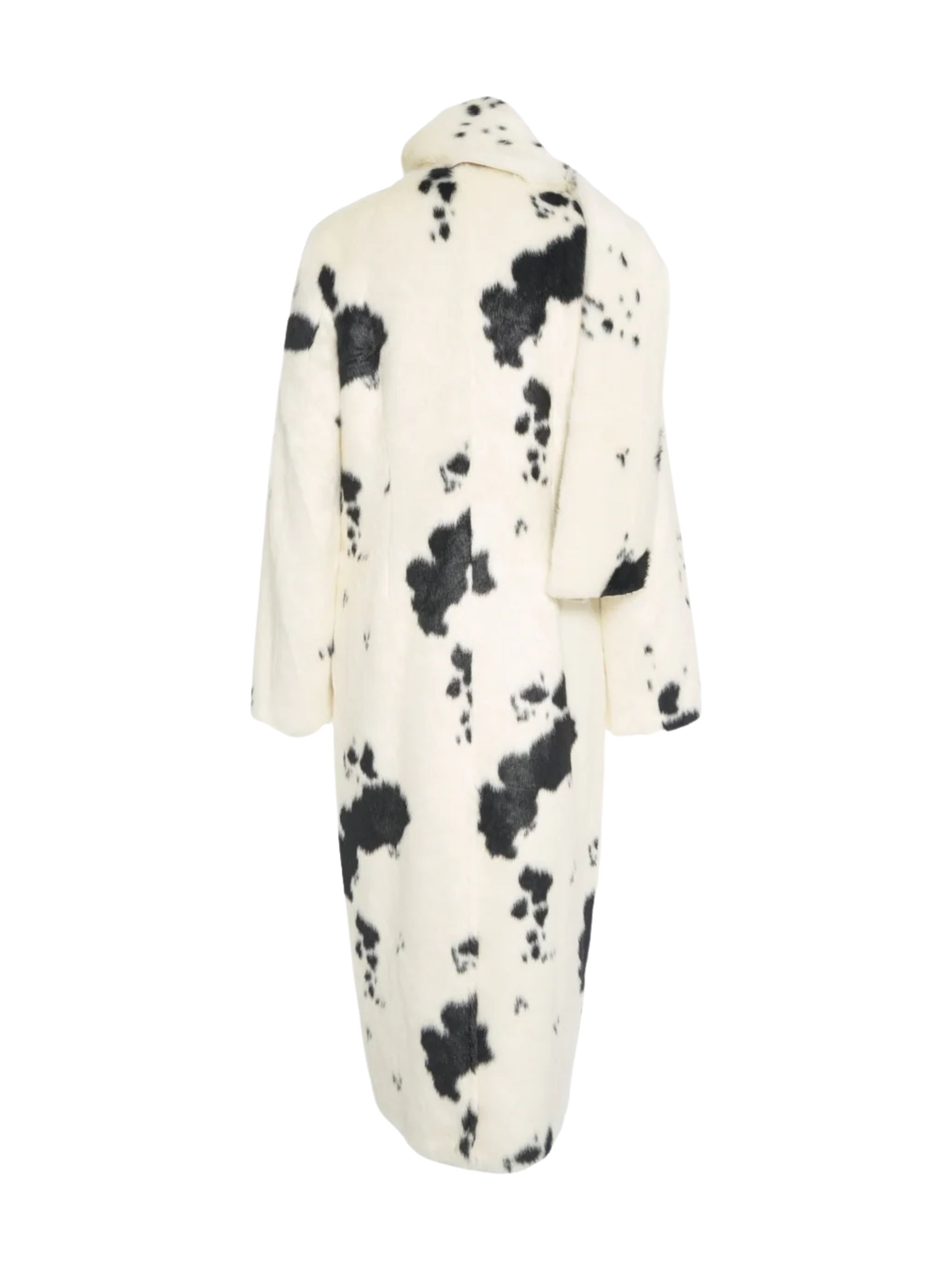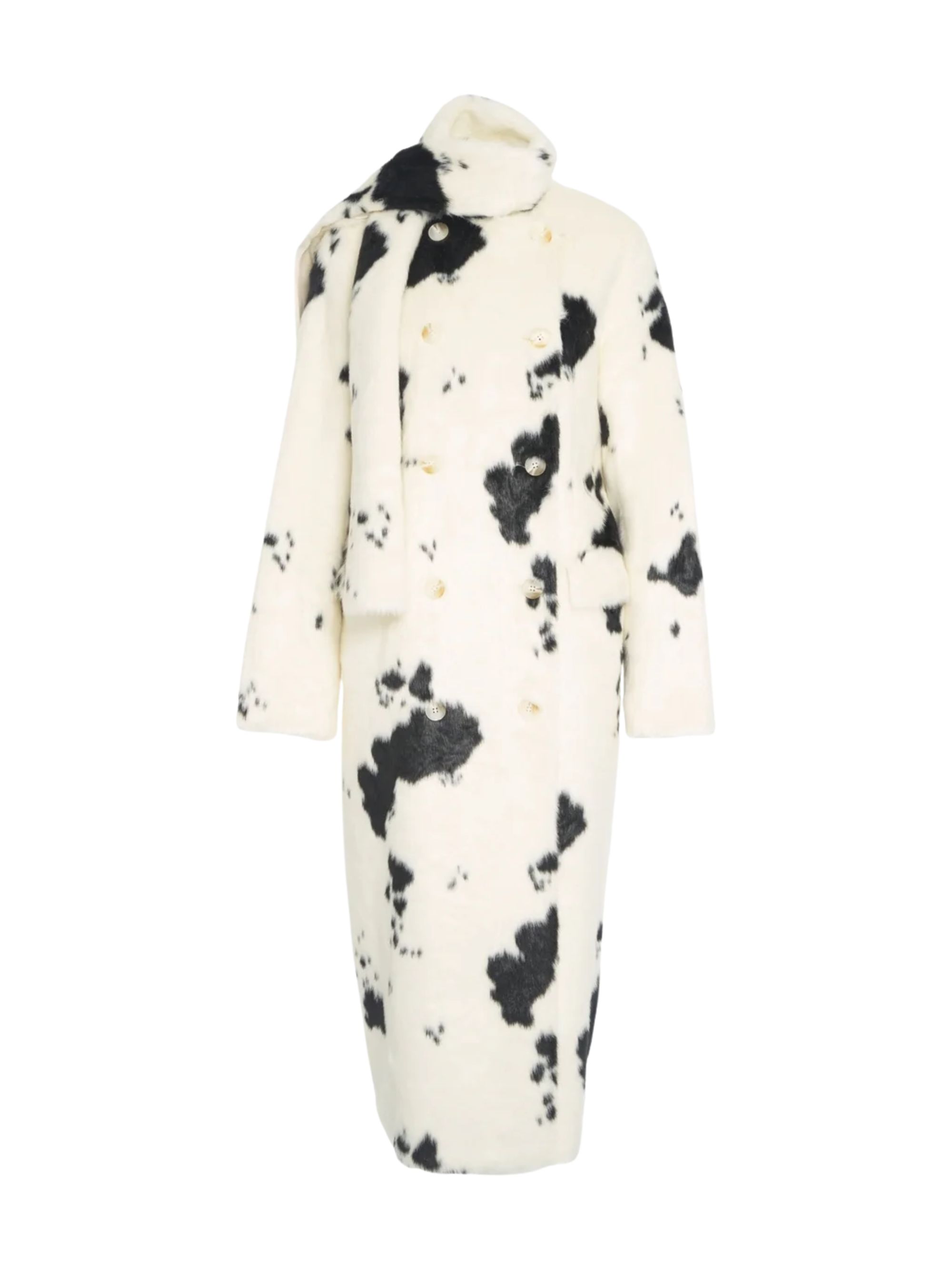 STAND STUDIO Palmer coat in black and white faux fur with a cowhide pattern, featuring a double-breasted button fastening, a detachable scarf and flap pockets.