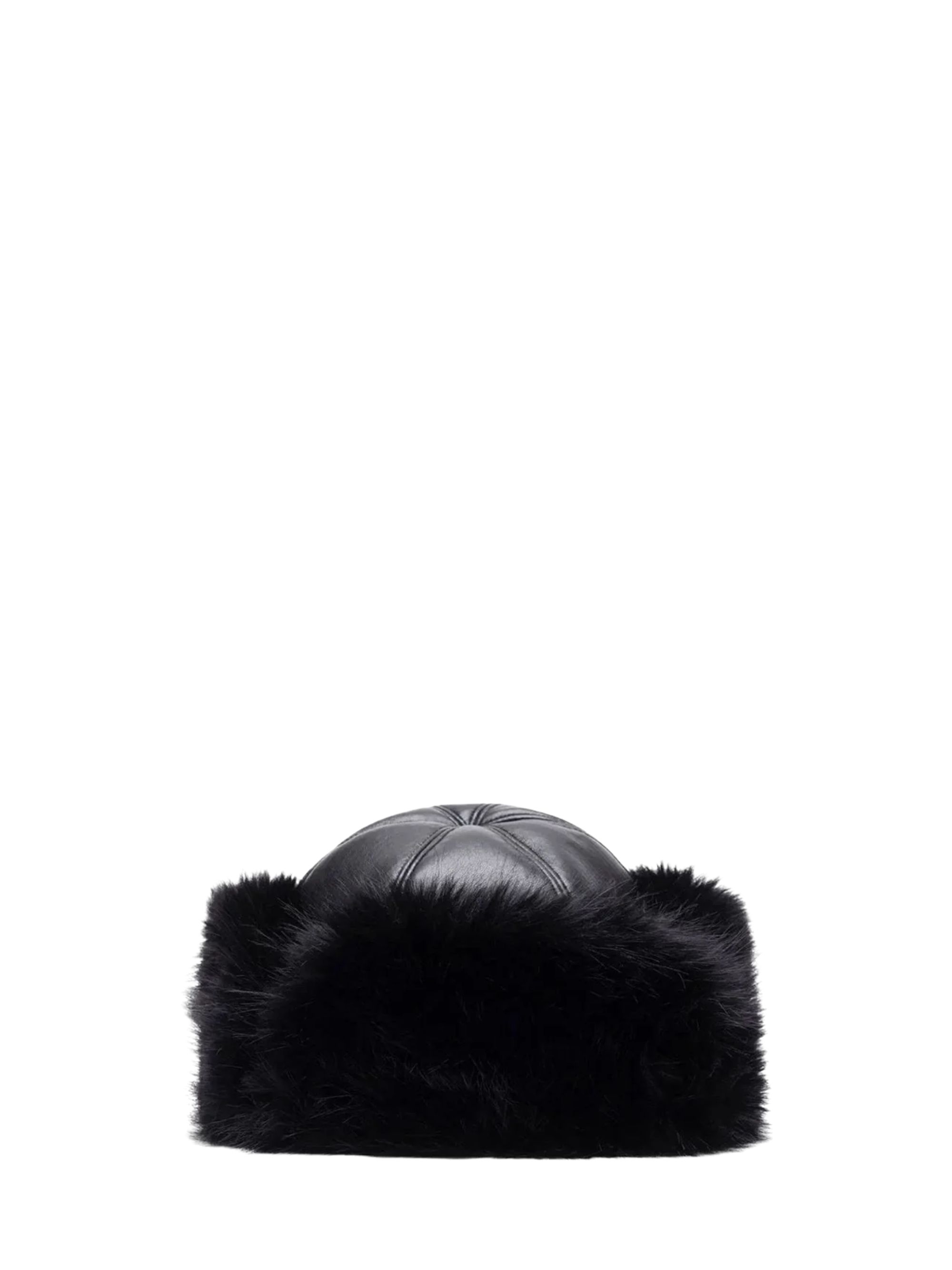 STAND STUDIO black sable hat in leather and faux fur, featuring a round crown and quilted details.