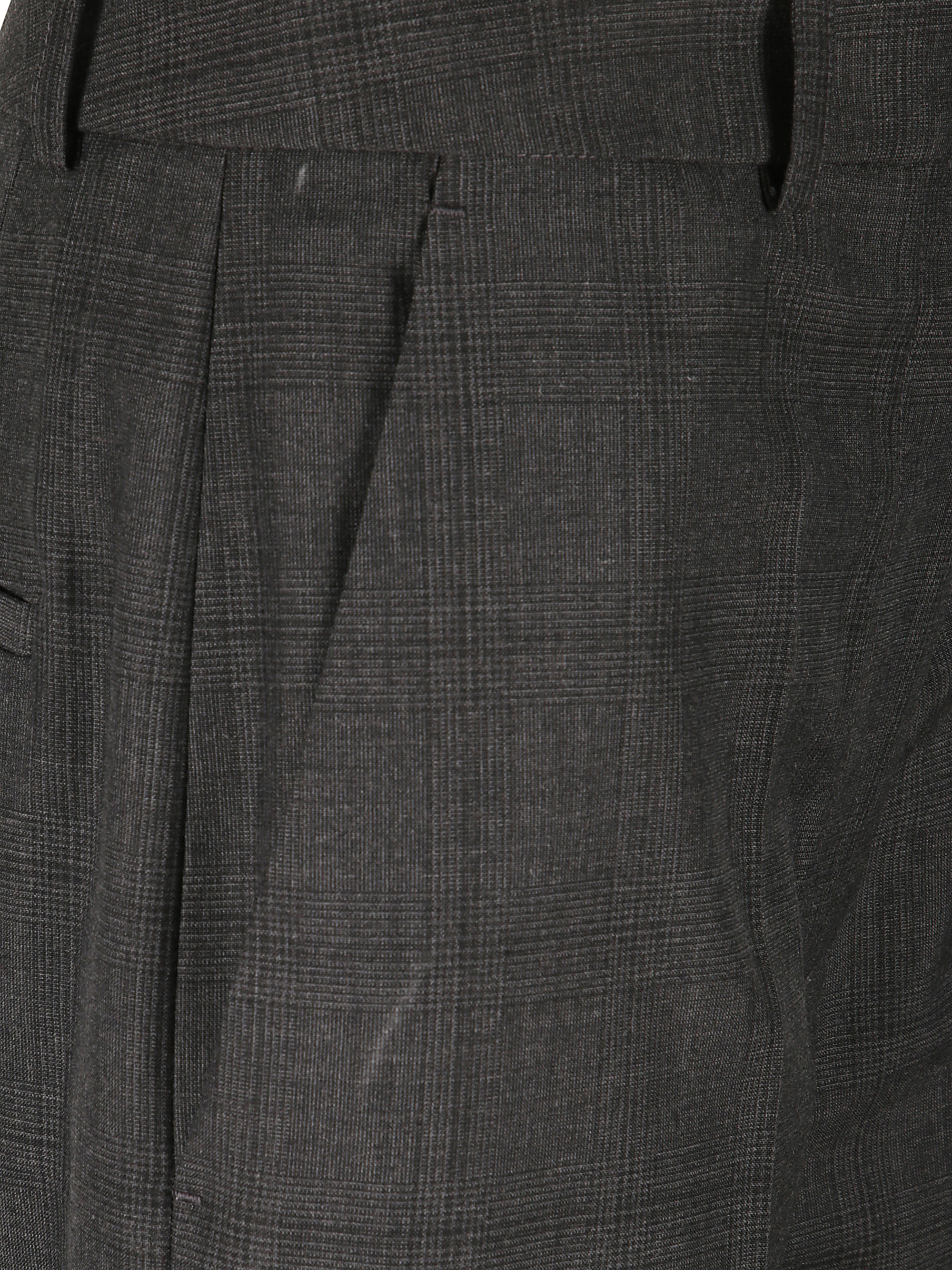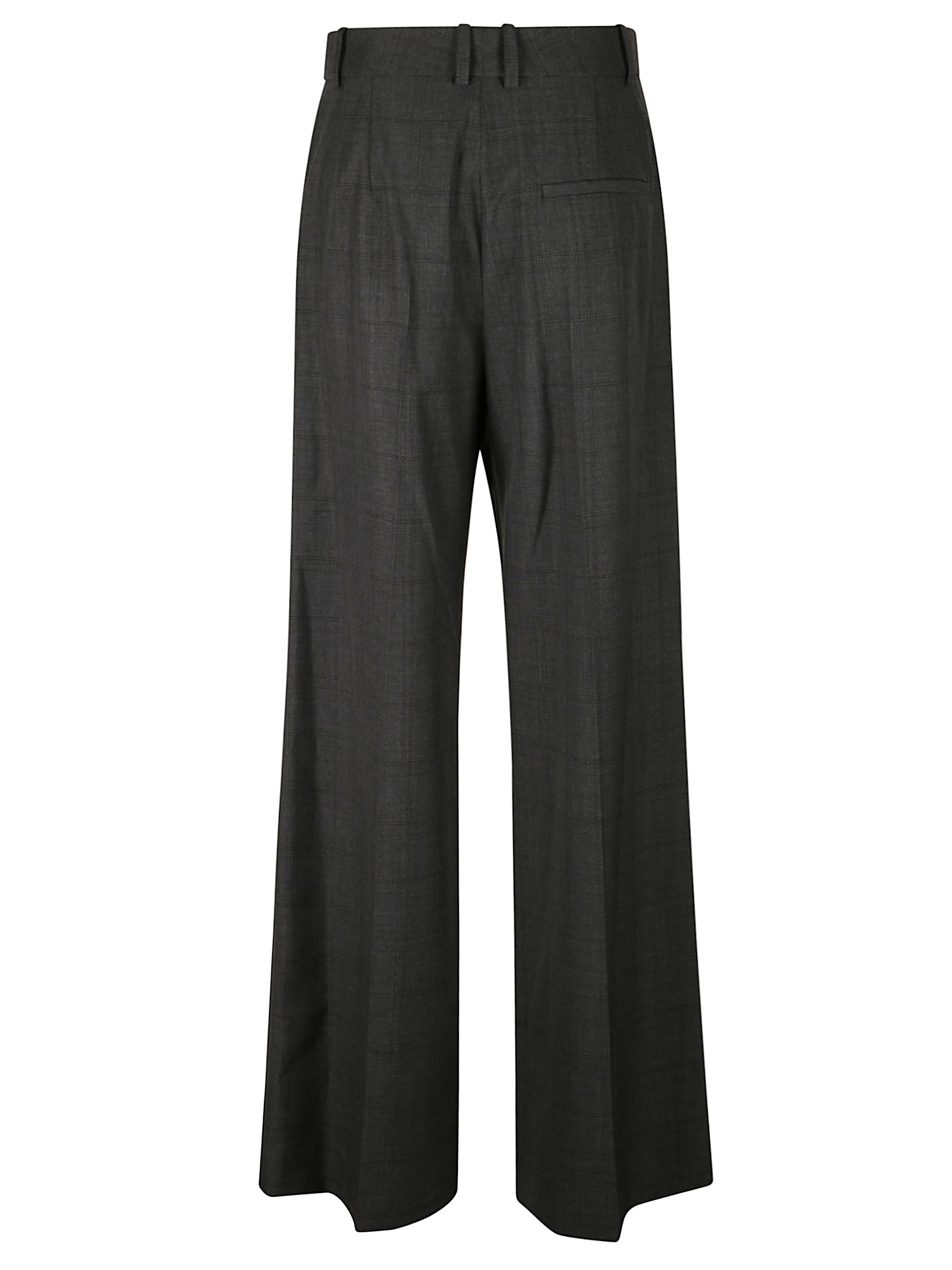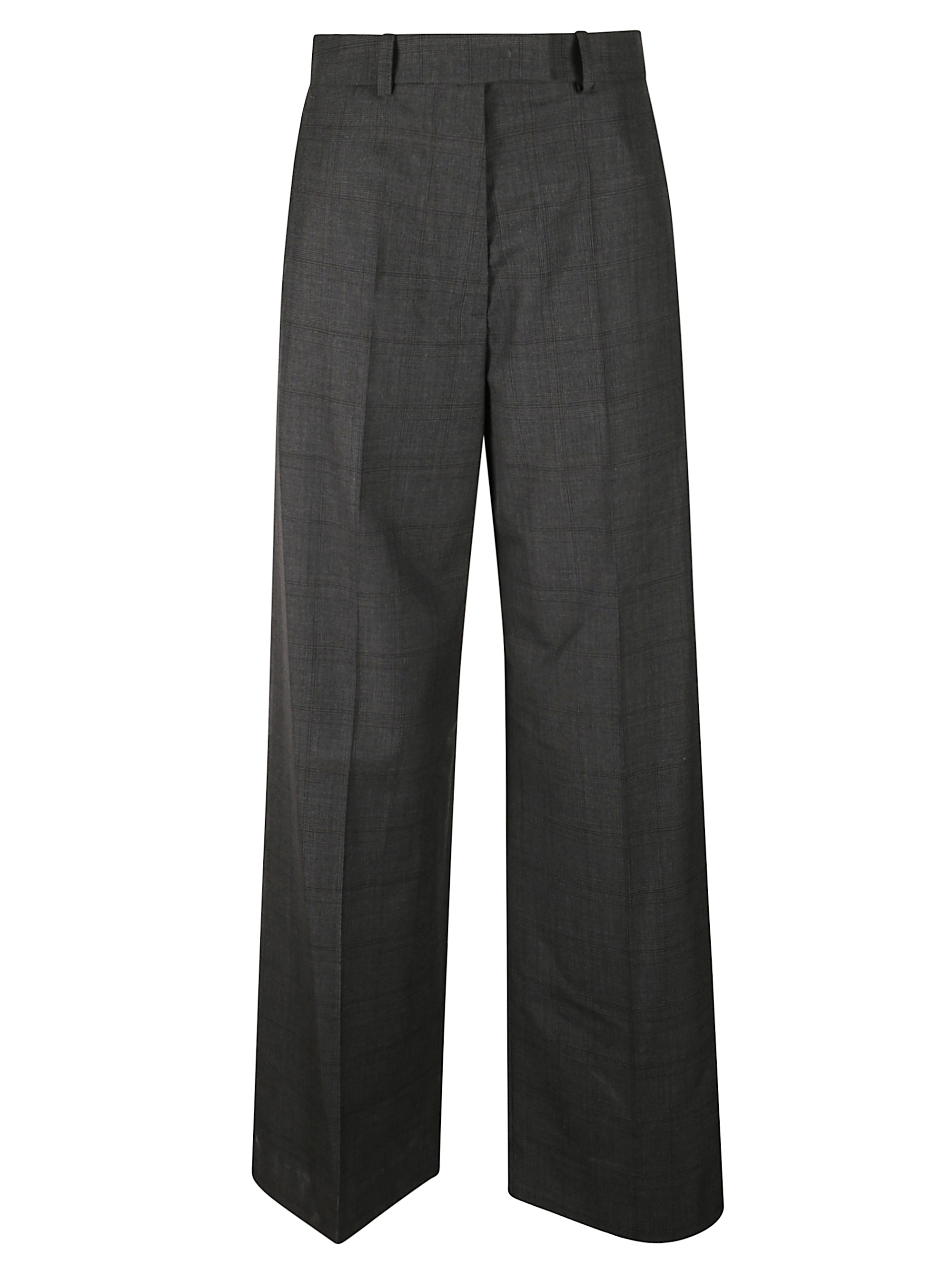 Brickell checked trousers from THE FRANKIE SHOP in grey in a lightweight wool blend fabric, featuring a wide leg, belt loops, slanted hip pockets, a back welt pocket and a hook and bar fastening.