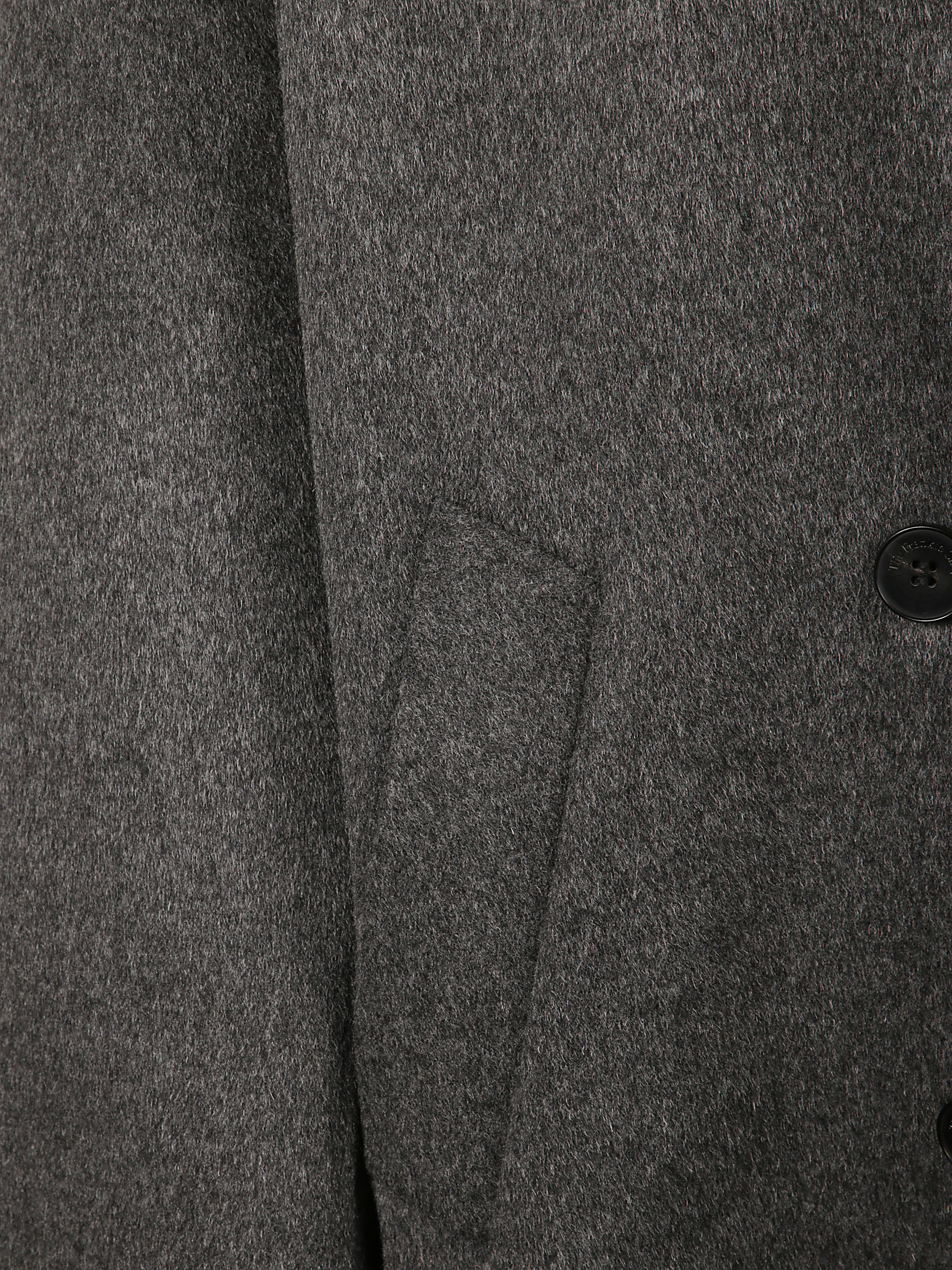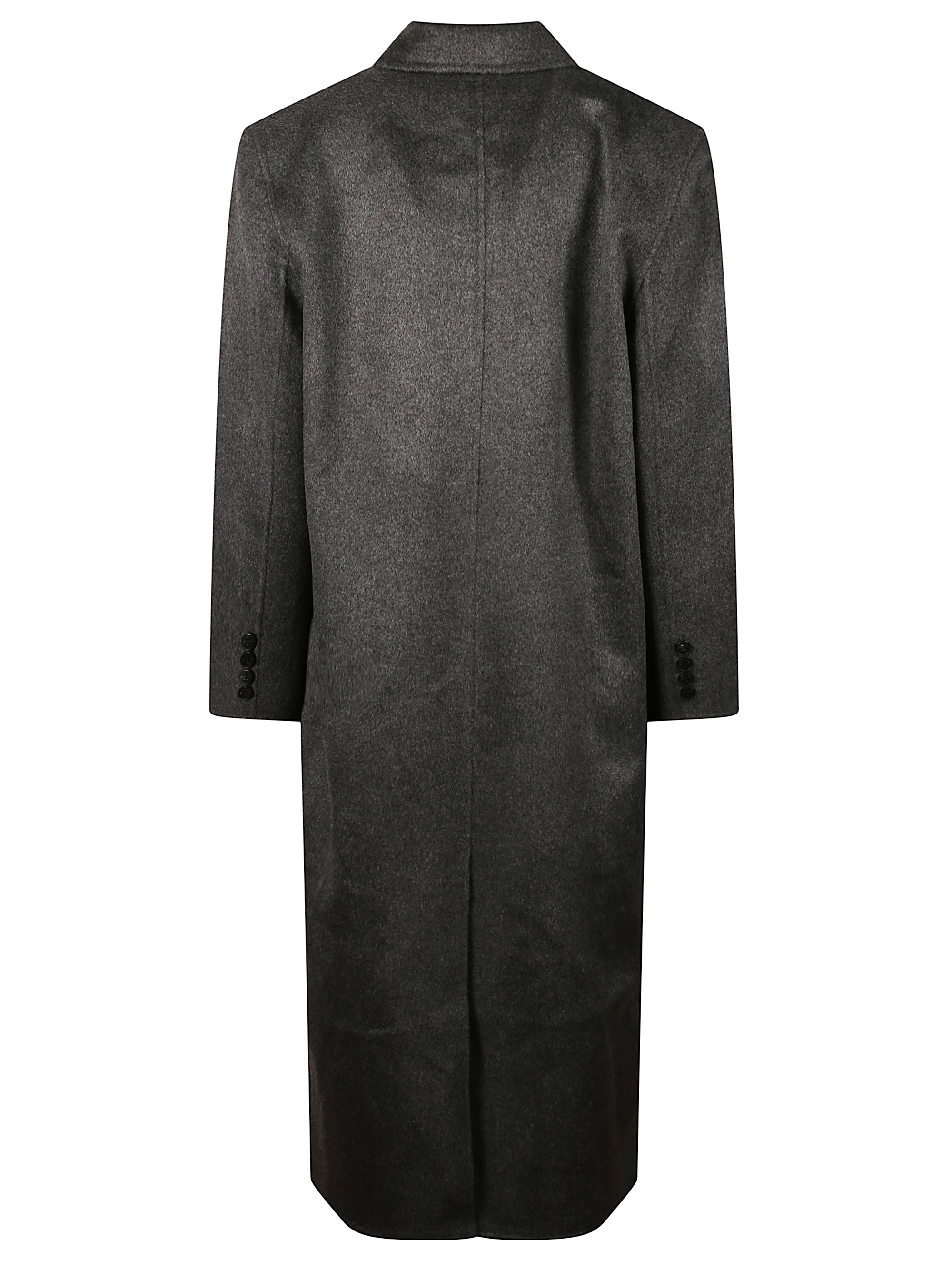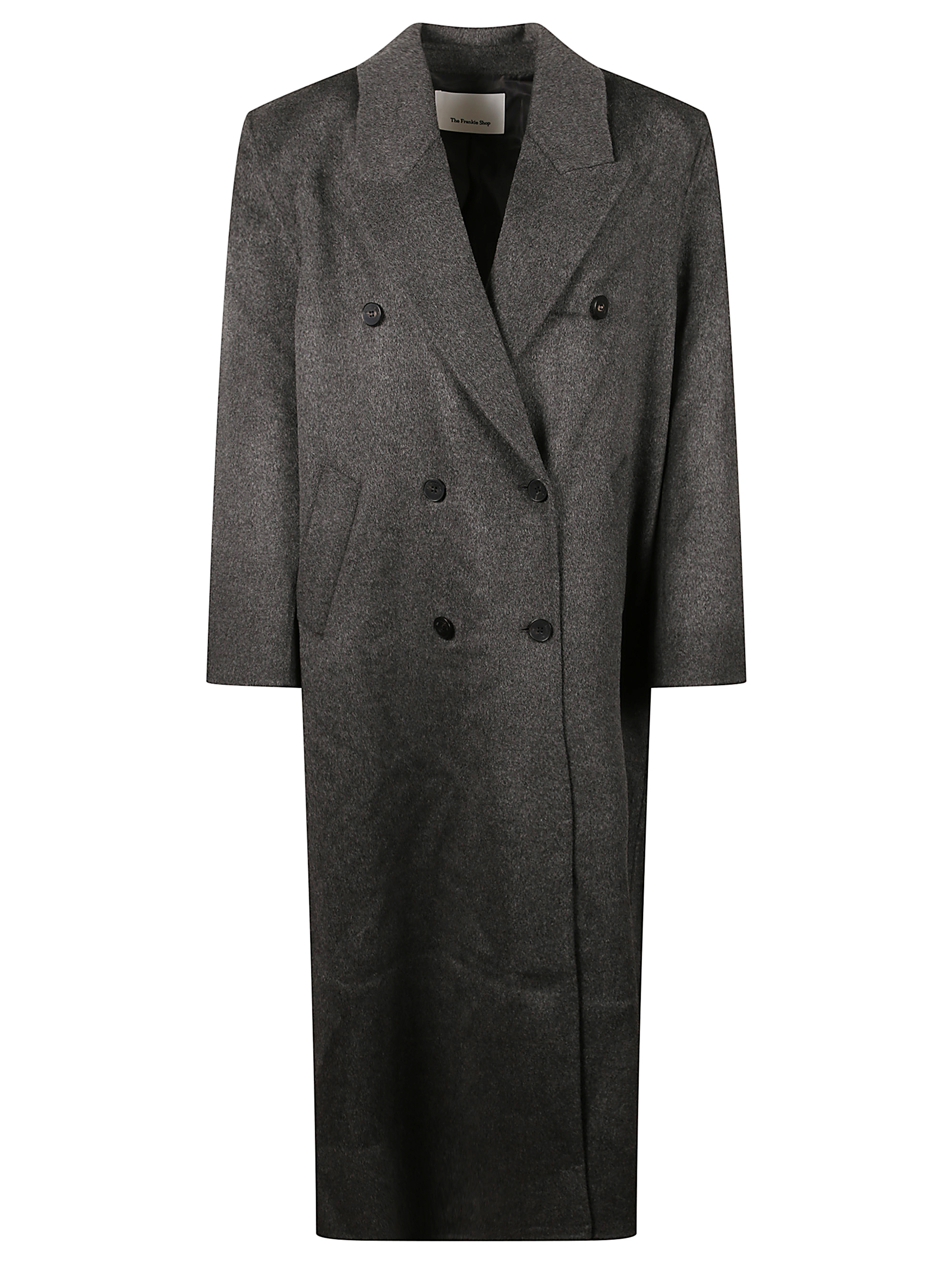 Gaia double-breasted coat by THE FRANKE SHOP in grey melange wool, featuring dropped shoulders, peak lapels, welt hip pockets, a single back vent hem, double-breasted fastening and partially lined.