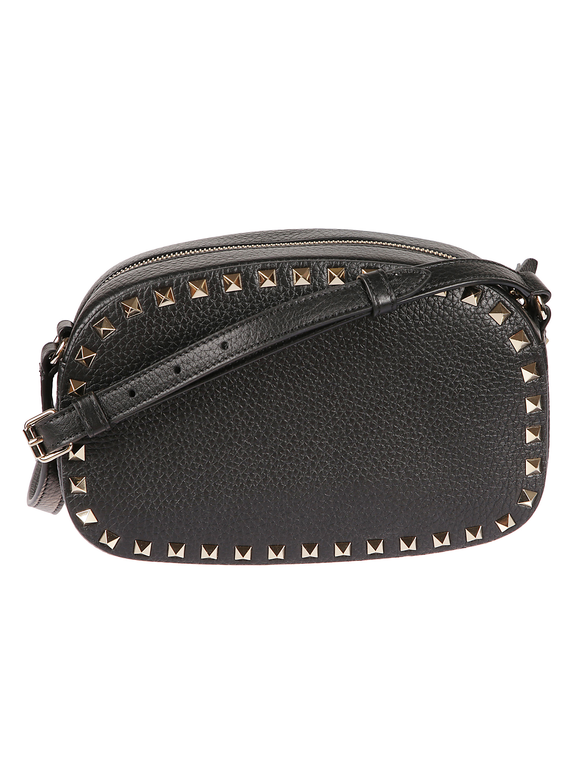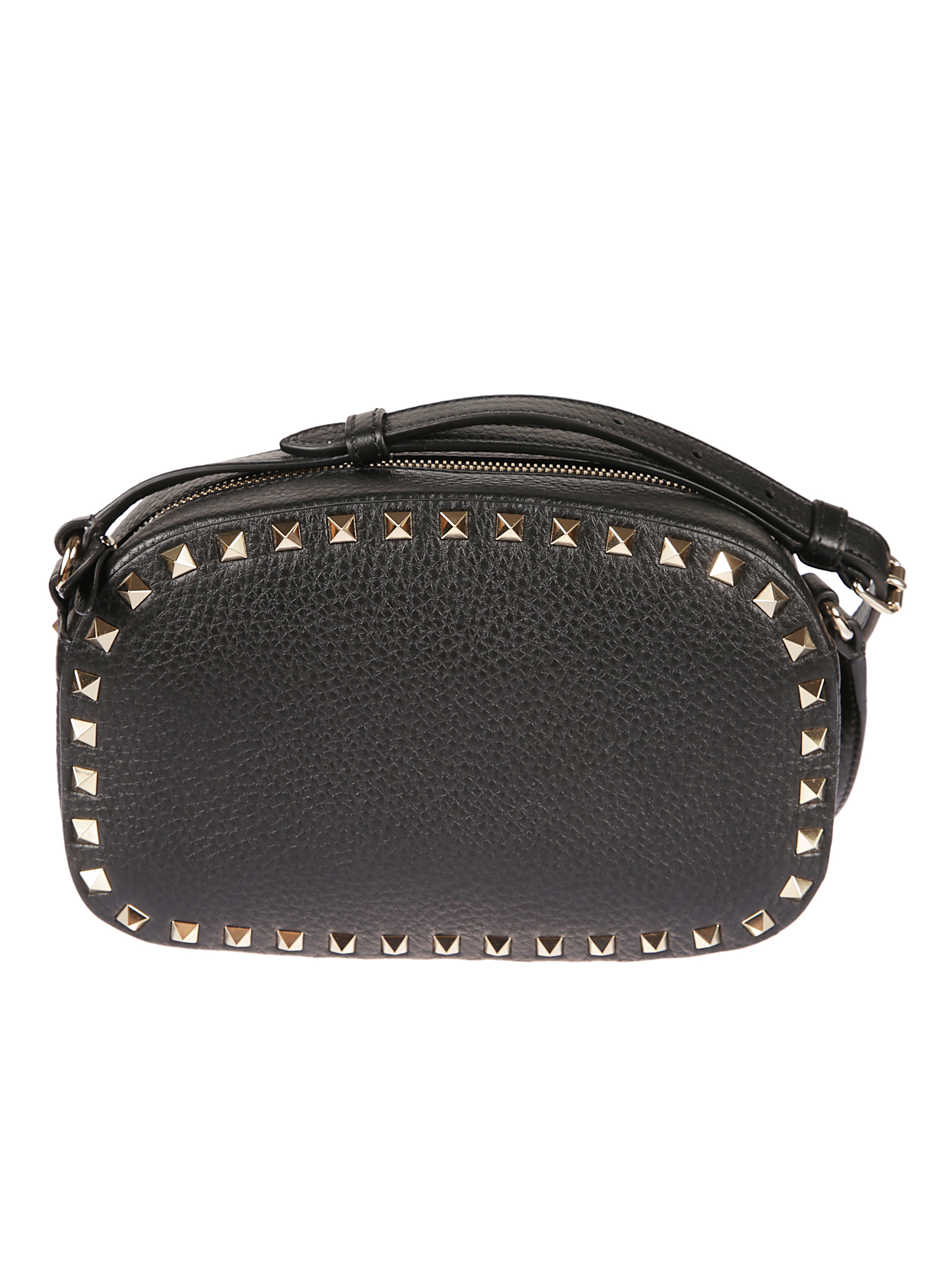 Black leather Camera Case Rockstud bag by VALENTINO GARAVANI, featuring an oval shape, adjustable shoulder strap, gold studs decorating the top edge and sides and zip closure.