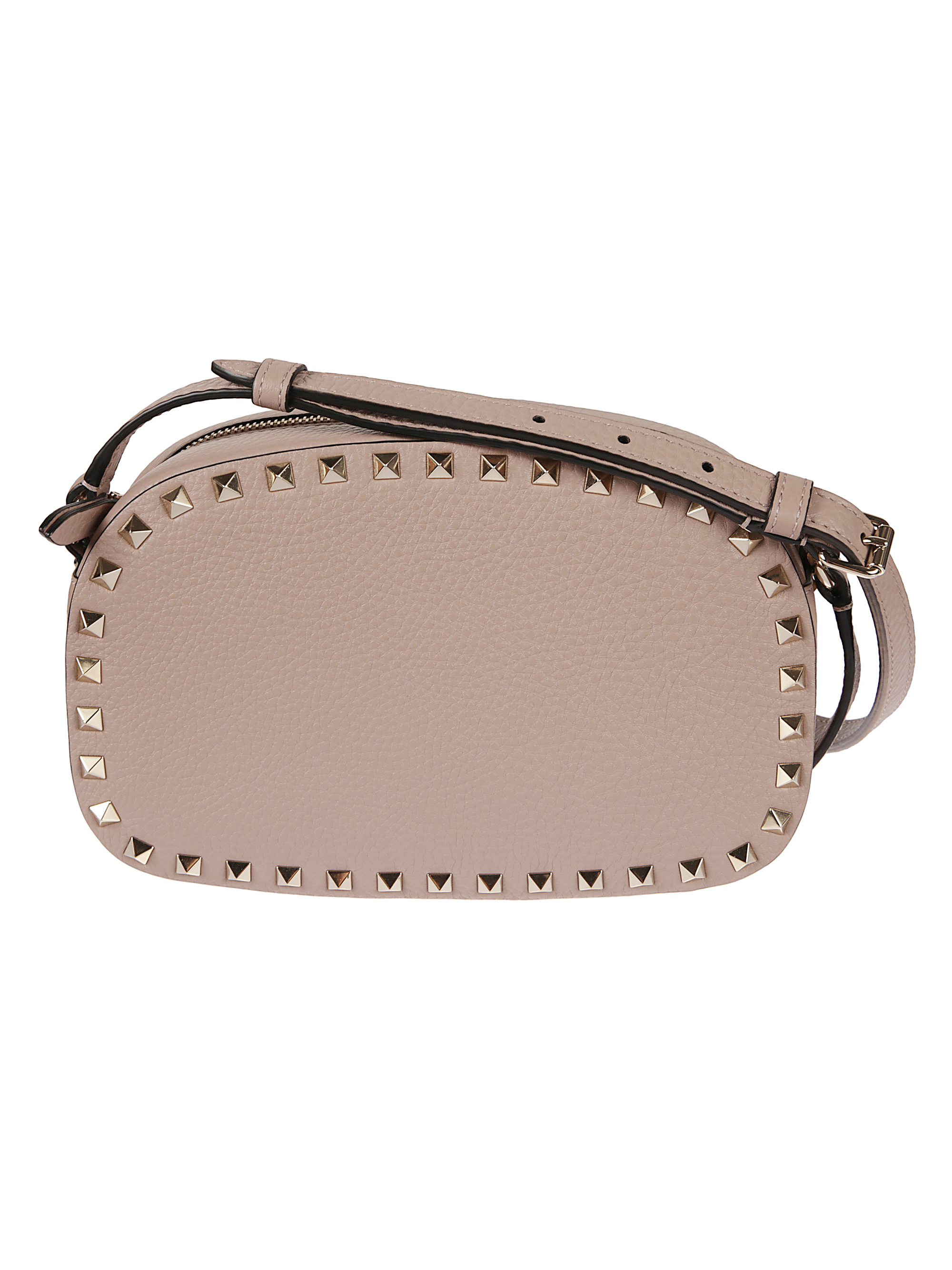 VALENTINO GARAVANI Rockstud Camera Case bag in beige leather, featuring an oval shape, adjustable shoulder strap, gold studs decorating the top edge and sides and zip closure.