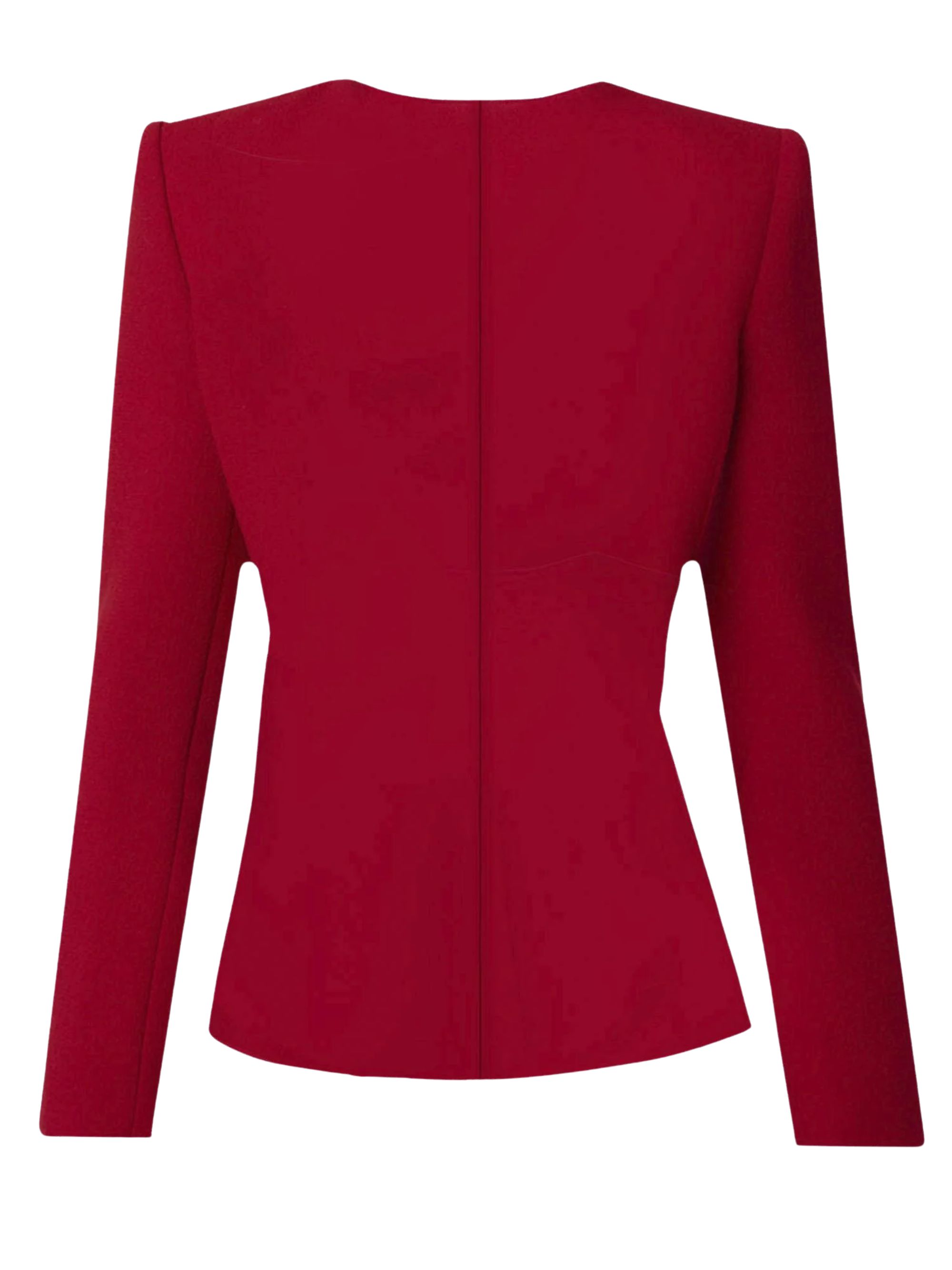 VALENTINO red wool crepe side bow jacket featuring a crossover front fastening with snap buttons, gathered waist detail and contrasting black bow.