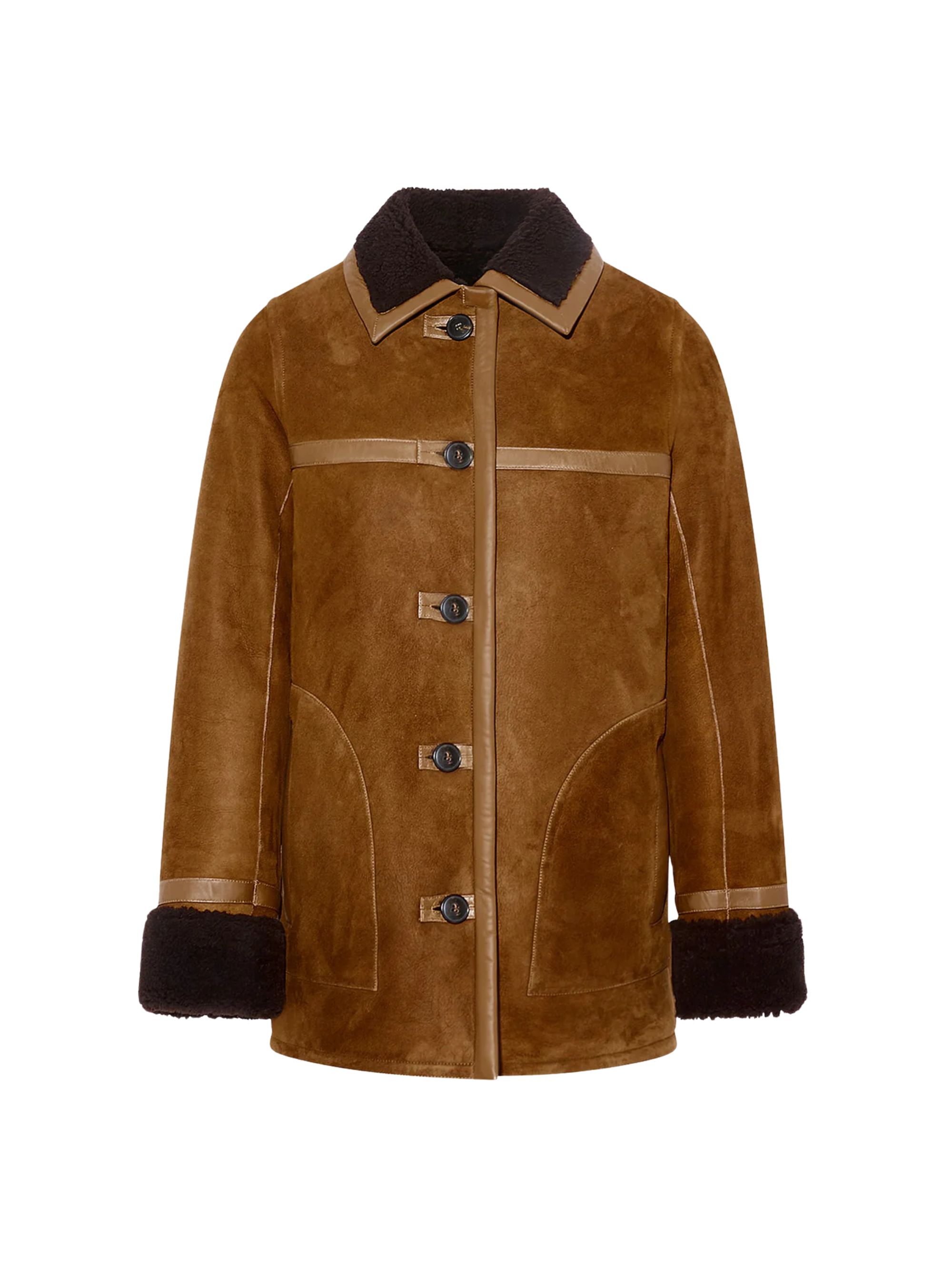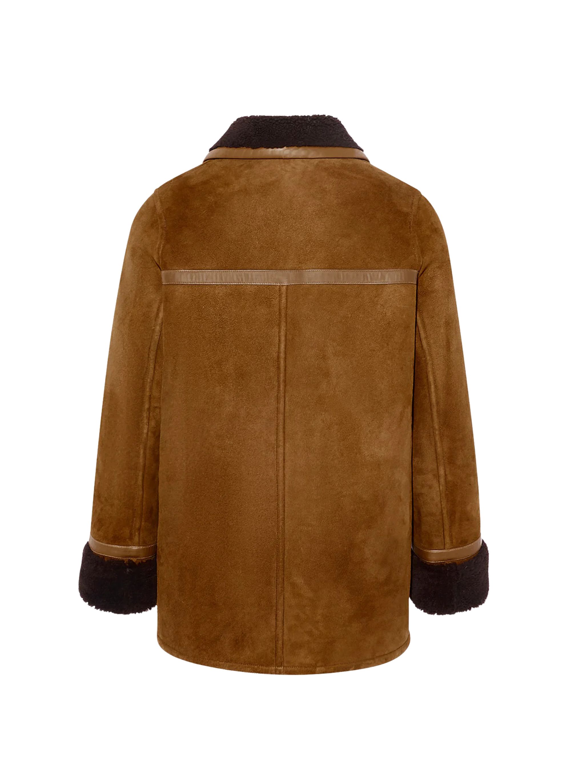 YVES SALOMON brown suede fur-lined coat featuring smooth leather detailing, a notched collar, cut-out piping insert pockets, a zip fastening and rolled-up sleeves.