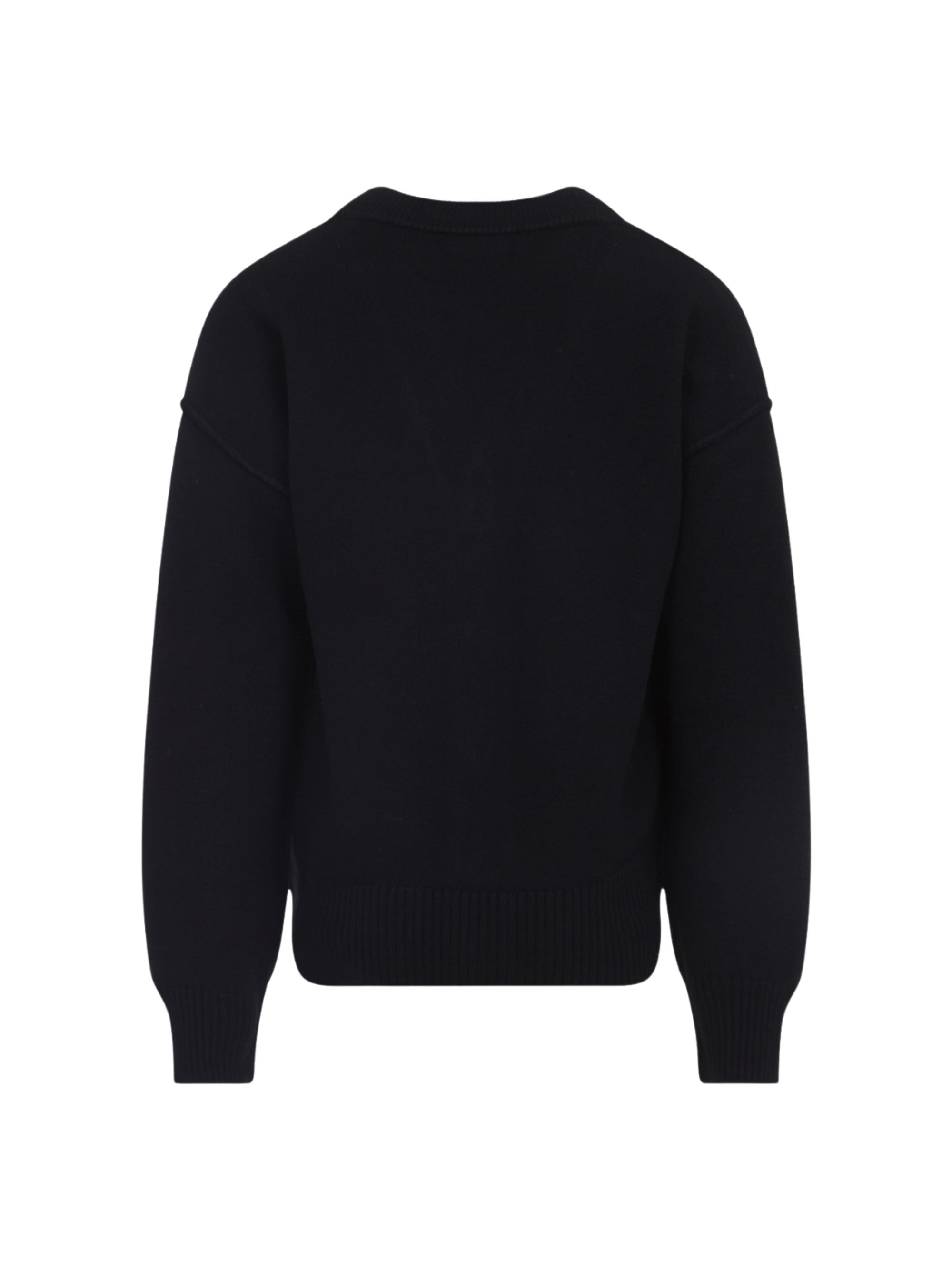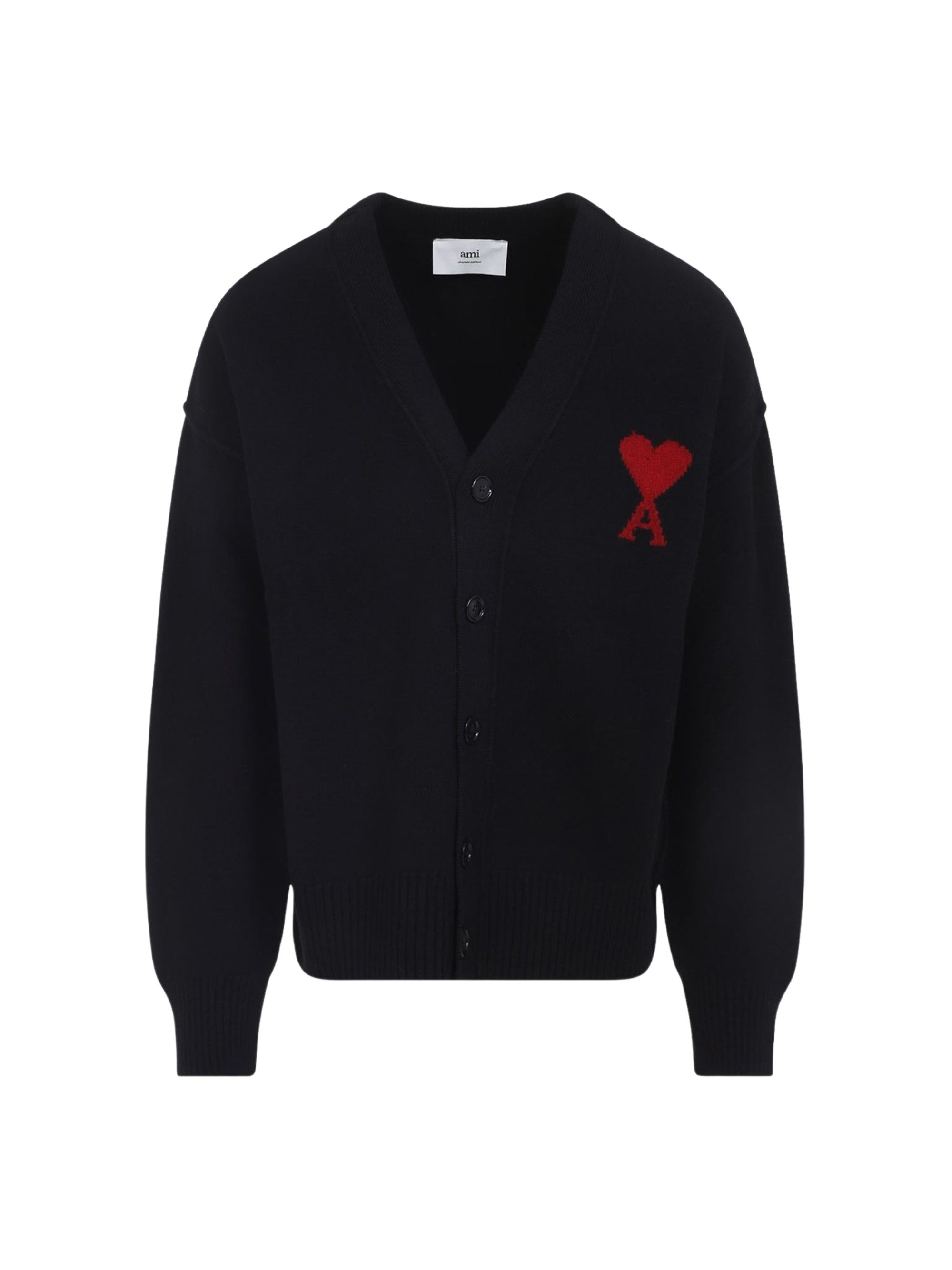 Cardigan Ami de Coeur con logo di AMI PARIS nero in lana, caratterizzato da scollo a V, polsini e orlo a coste, chiusura con bottoni in corno e logo Ami de Coeur sul petto.