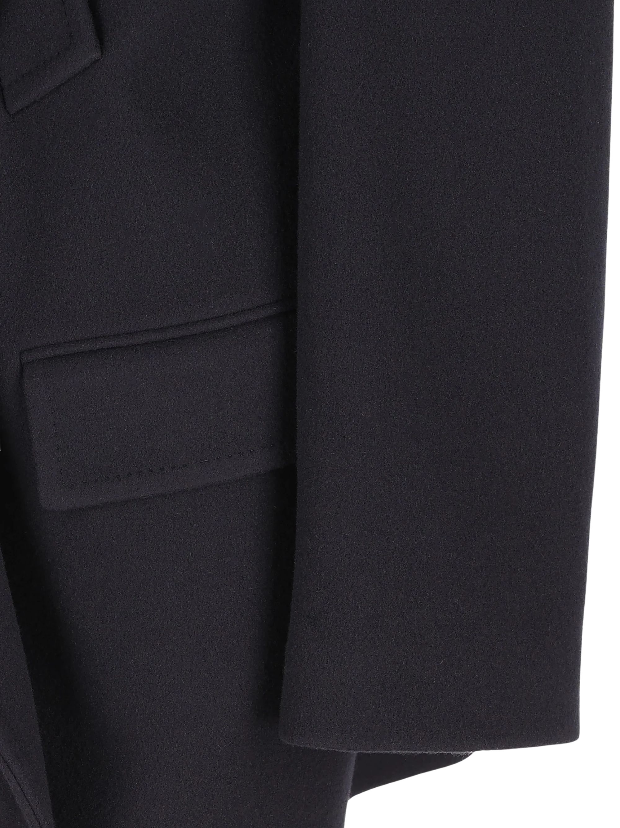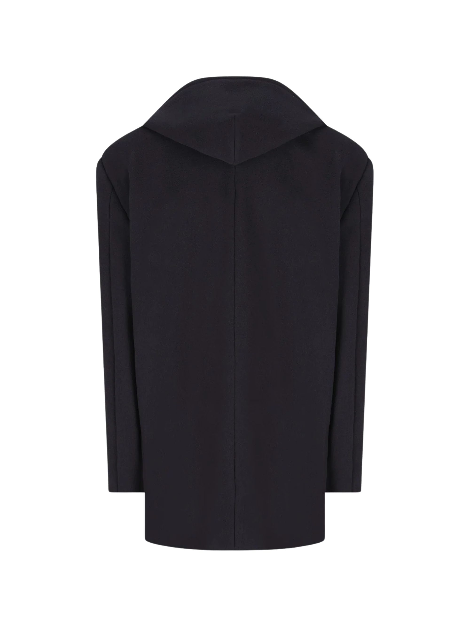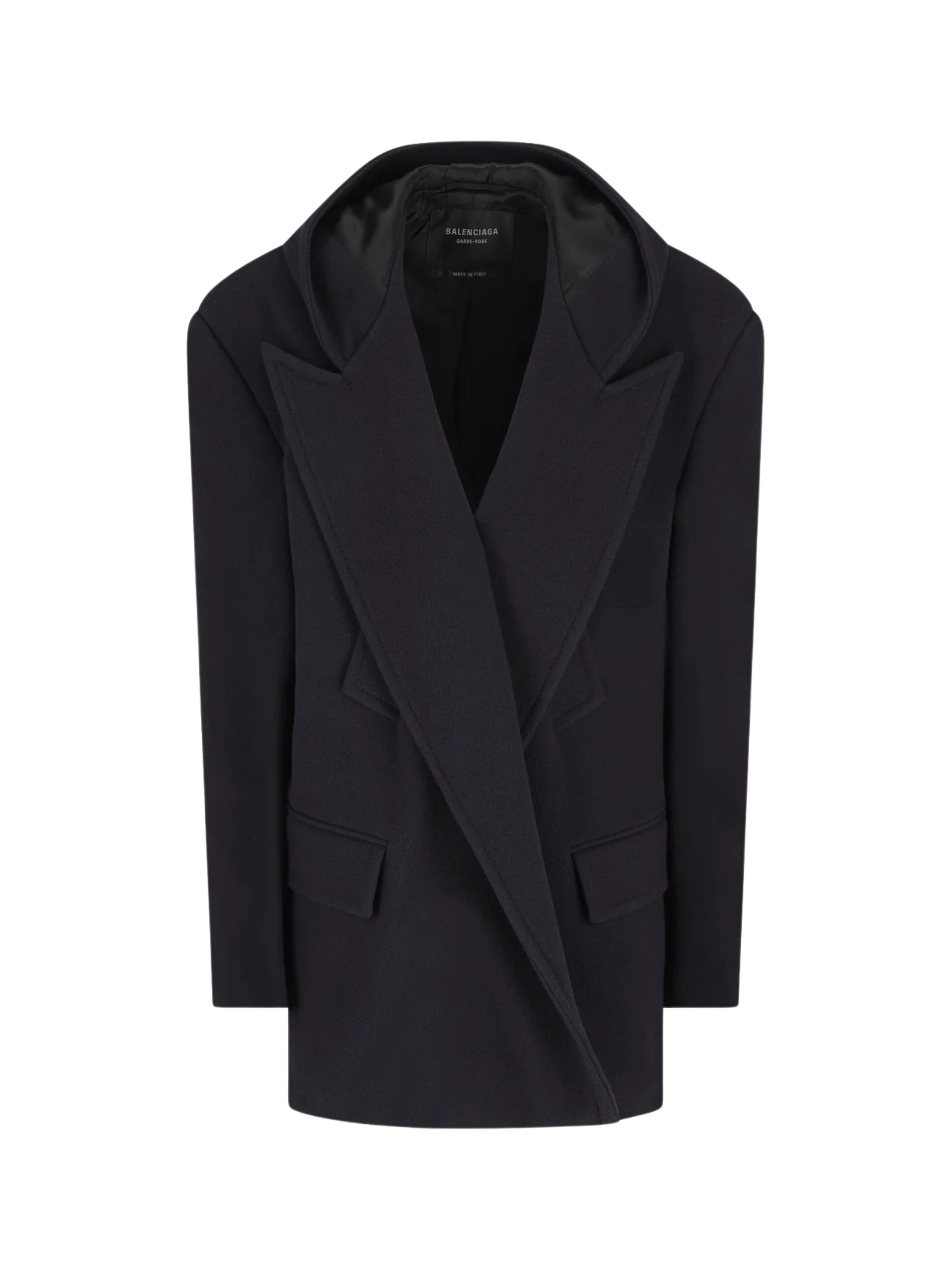 Cappotto corto con cappuccio di BALENCIAGA nero in lana, caratterizzato da revers a lancia, 2 tasche sul petto, 2 tasche con patta sul davanti e cappuccio.