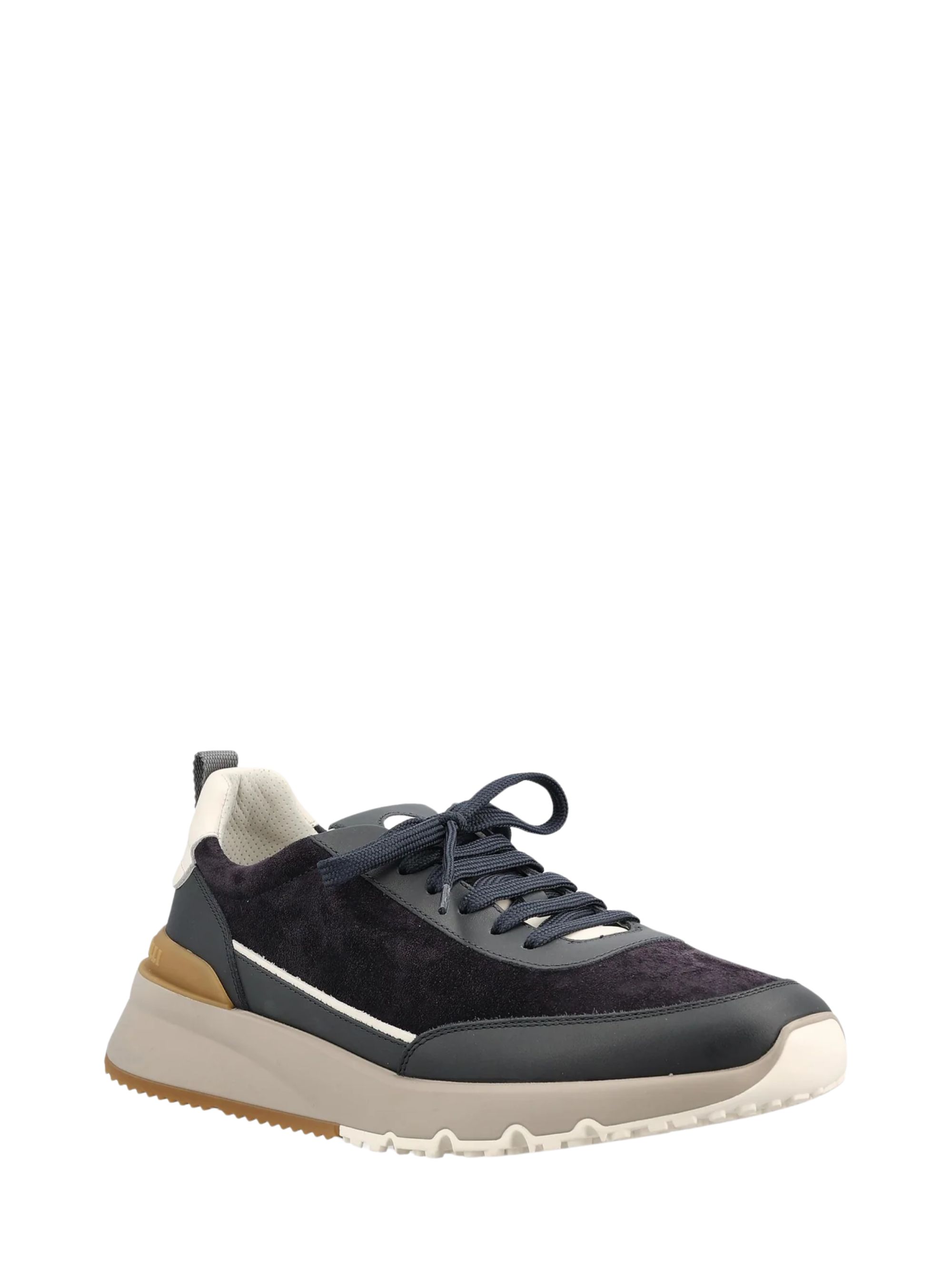 Sneaker in pelle di BRUNELLO CUCINELLI blu con inserti in pelle, tessuto, suola in gomma e chiusura con lacci.