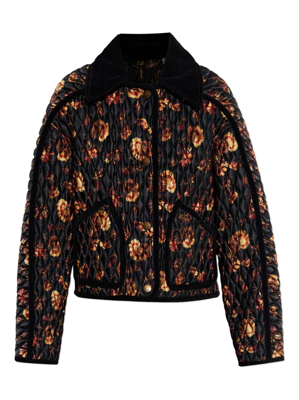 Giacca Floriston di BURBERRY multicolor in nylon, caratterizzata da finiture in velluto a coste, stampa geranio, chiusura con bottoni automatici e motivo metallico del cavaliere equestre sulla tasca.