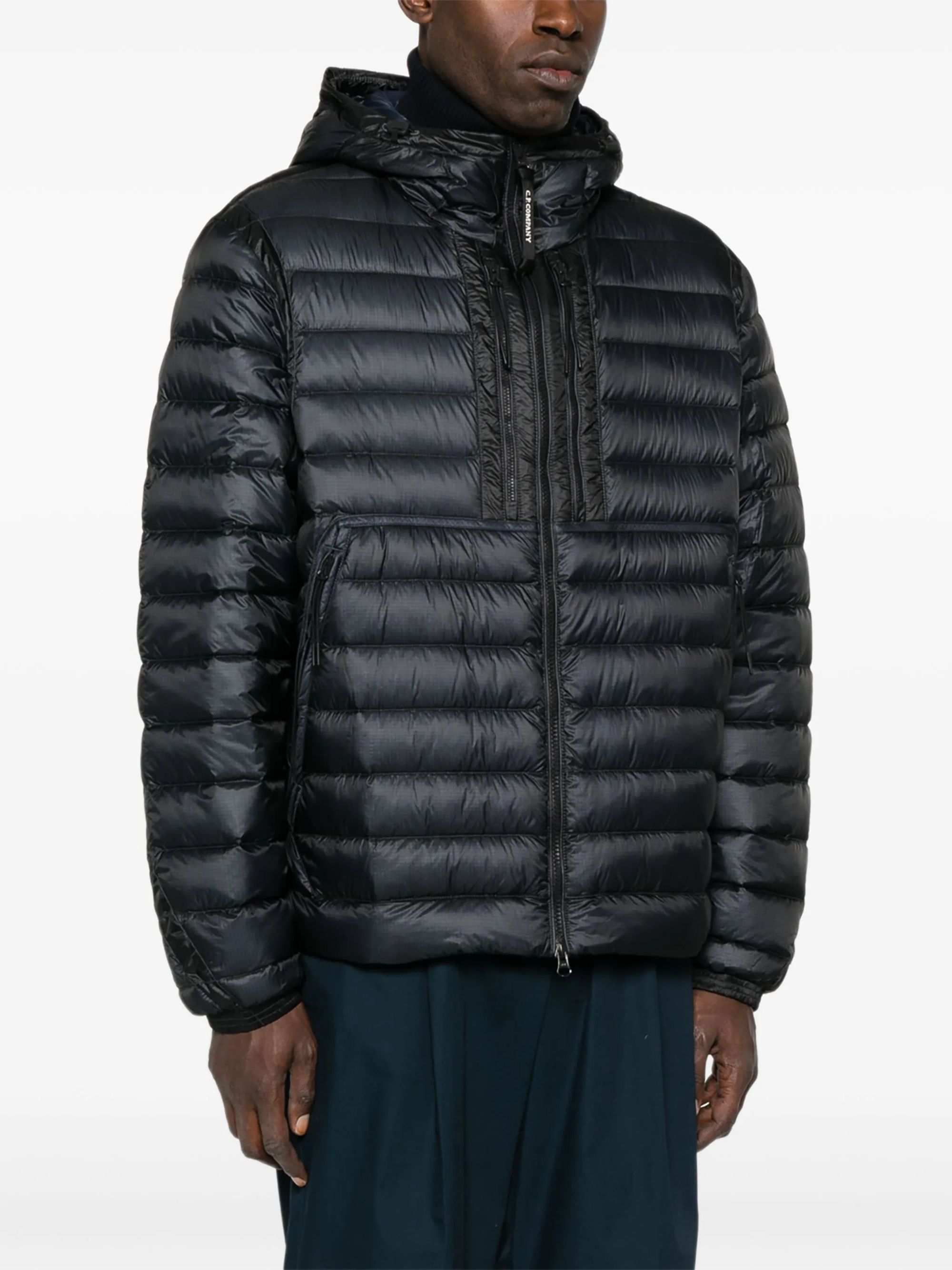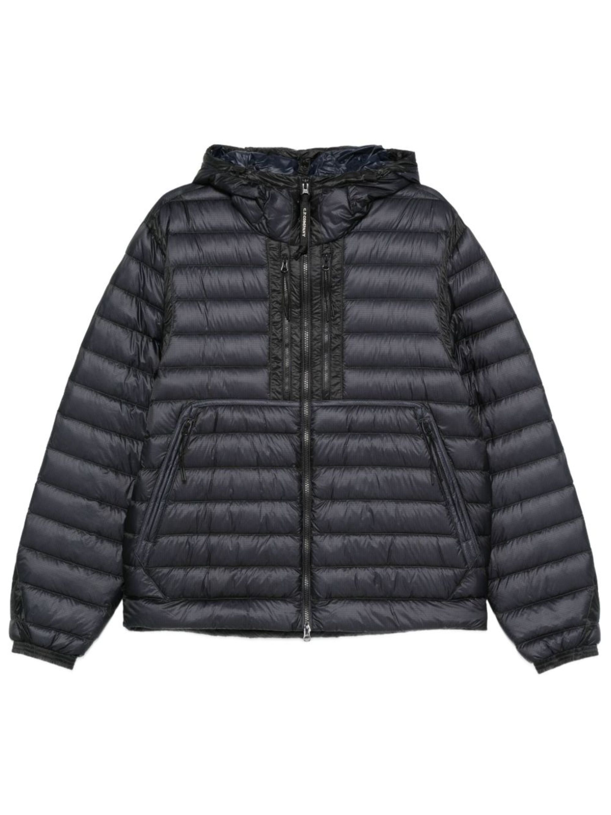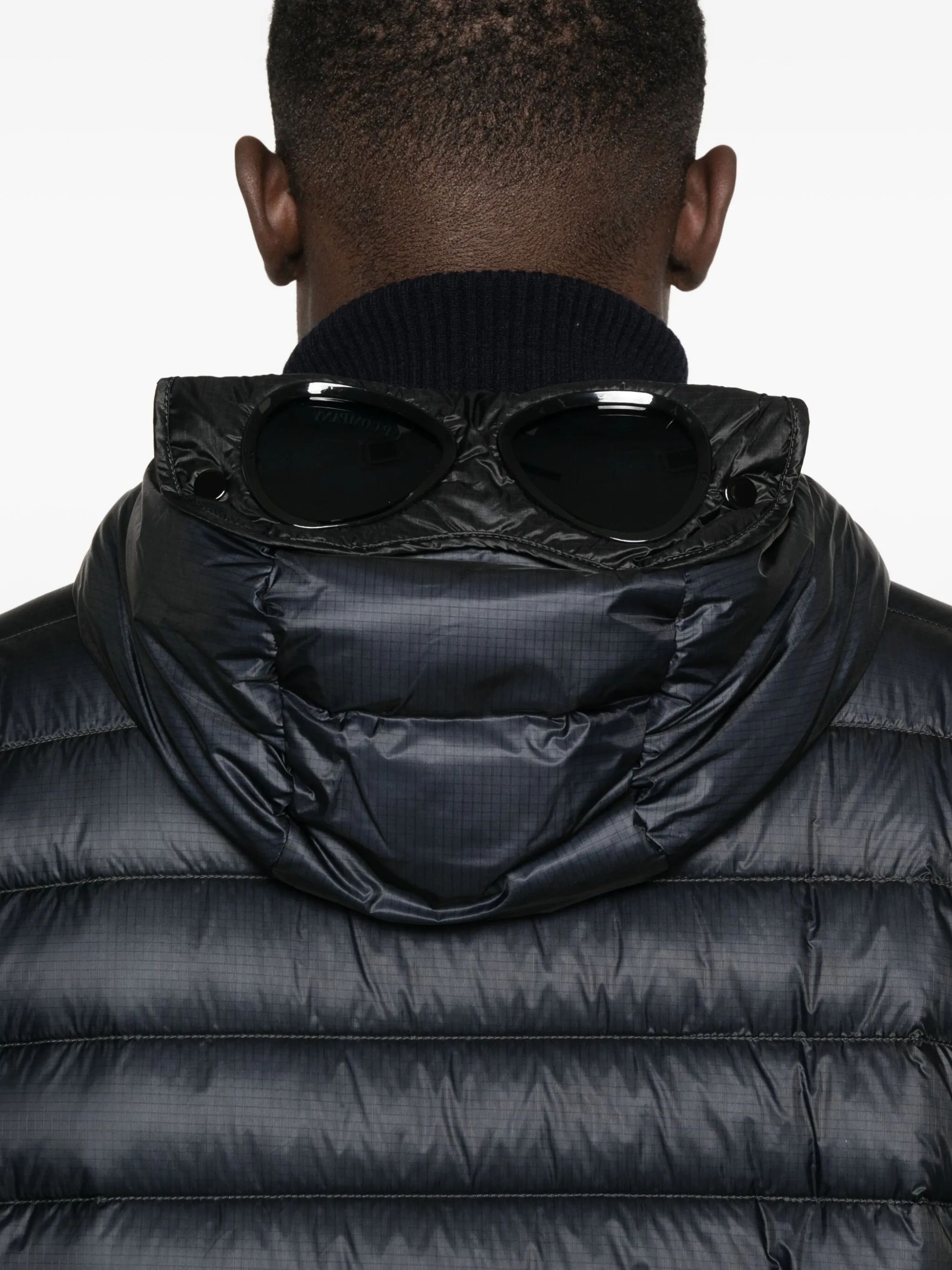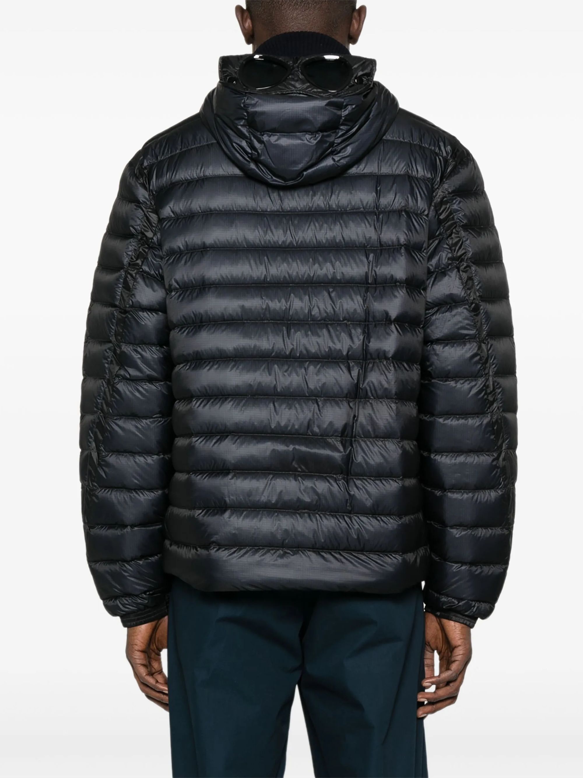 Giacca D.D. Shell Goggle di C.P. COMPANY nera in nylon, caratterizzata da cappuccio Goggle regolabile, tasche sul petto con zip, tasche laterali con zip, polsini a costine e orlo regolabile con coulisse.