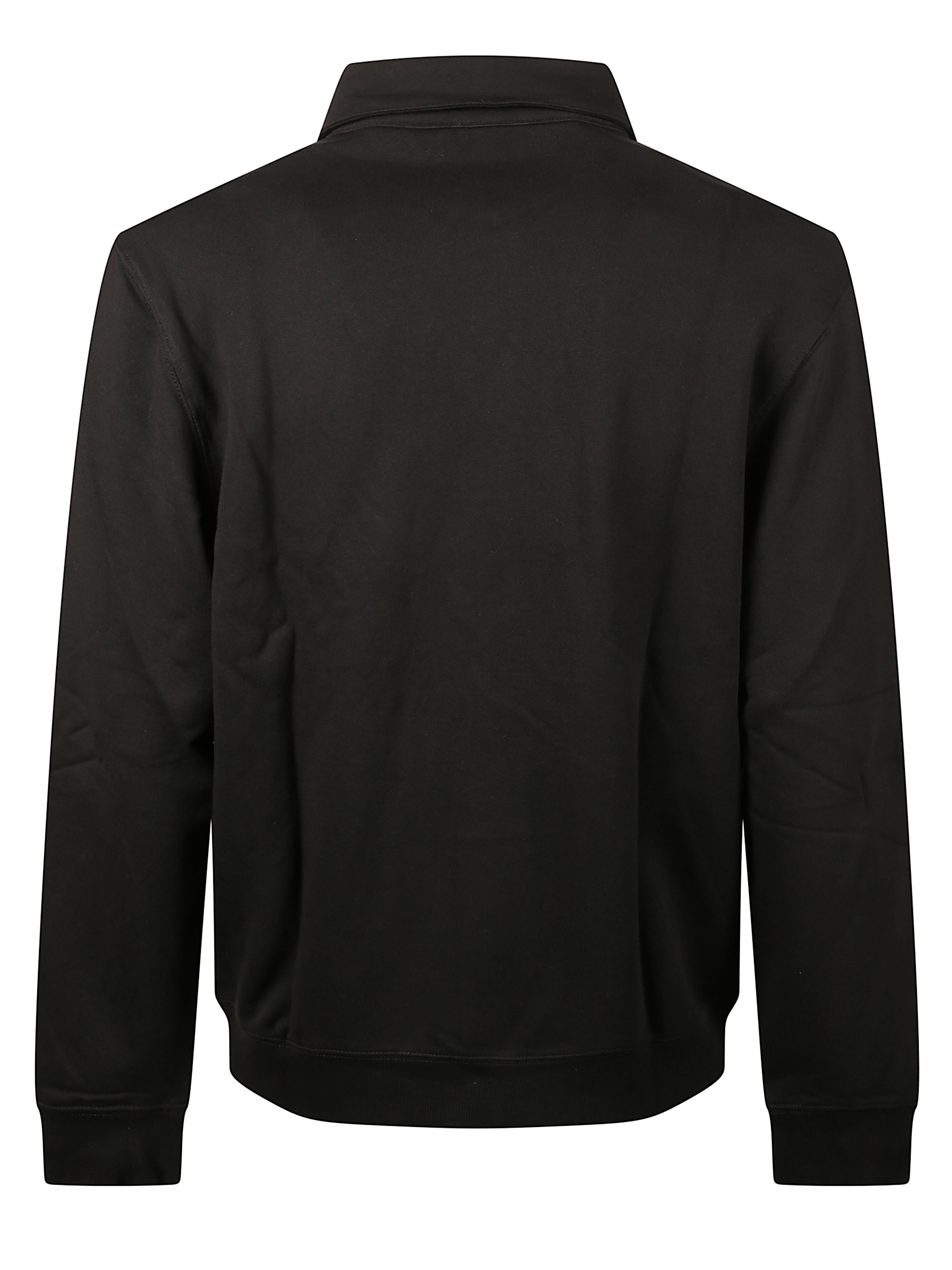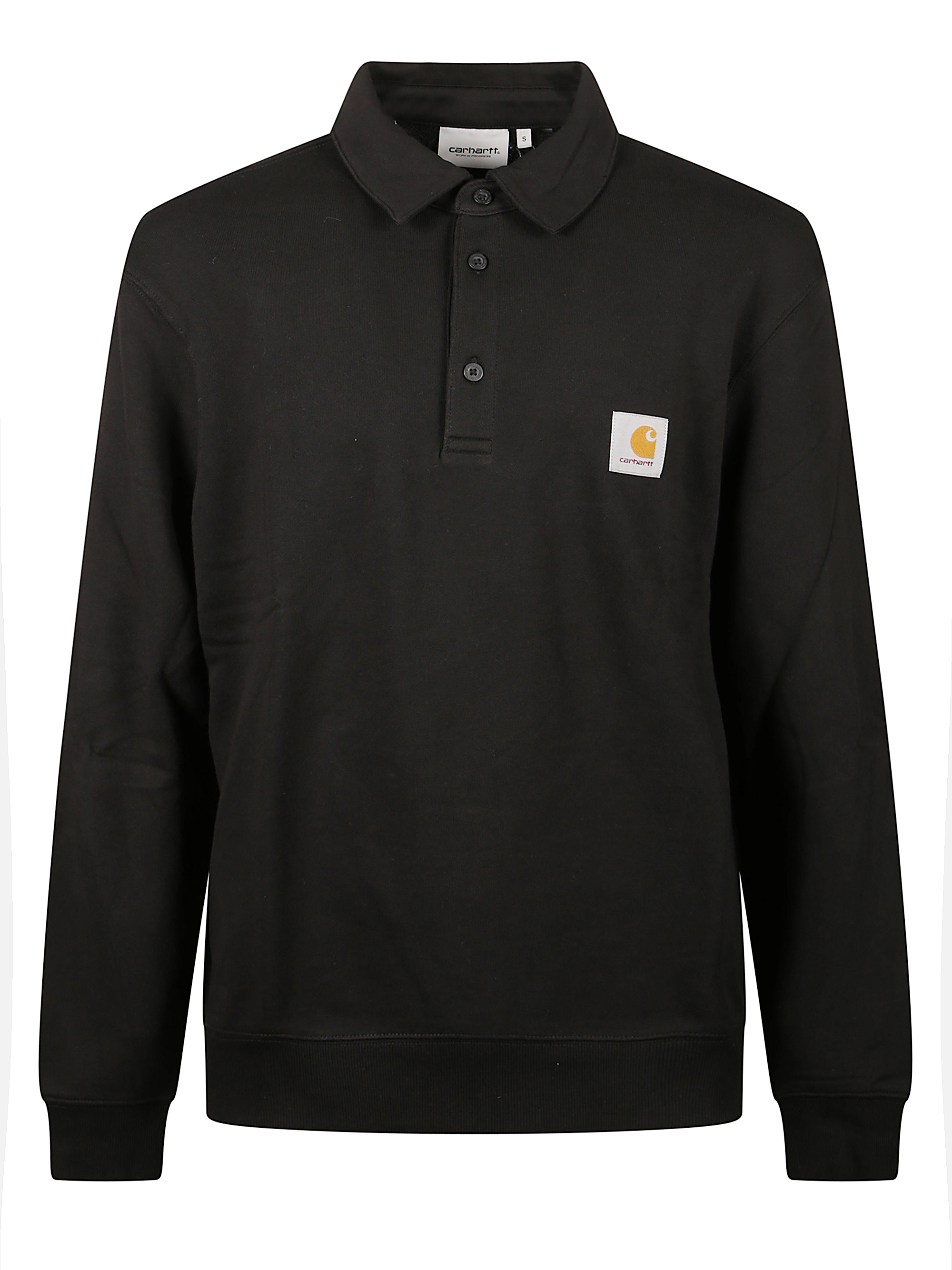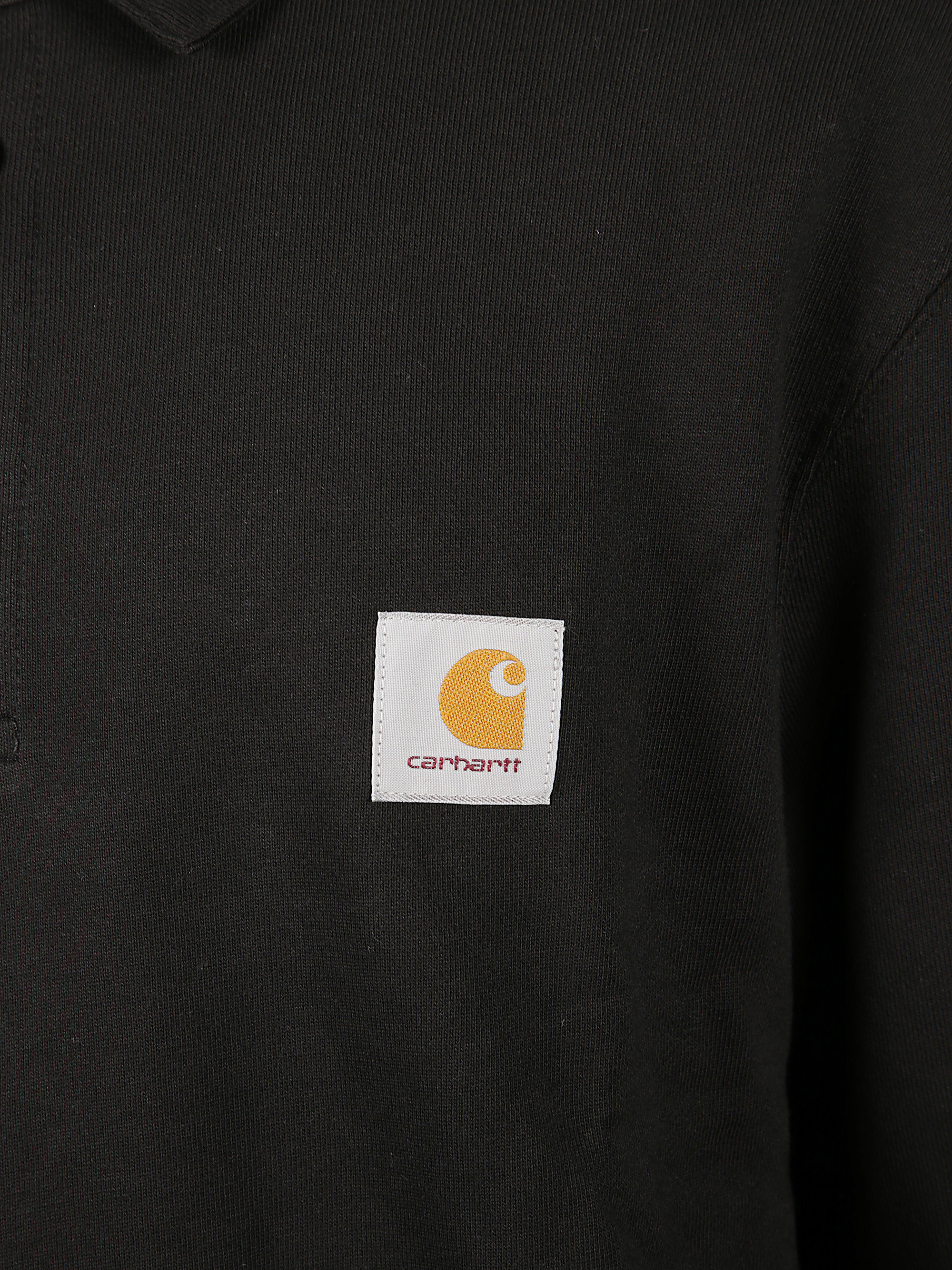 Polo Sweatshirt di CARHARTT WIP nera in jersey di cotone, caratterizzata da maniche lunghe, apertura con bottoni, inserti a coste sui fianchi e patch con logo sul petto.