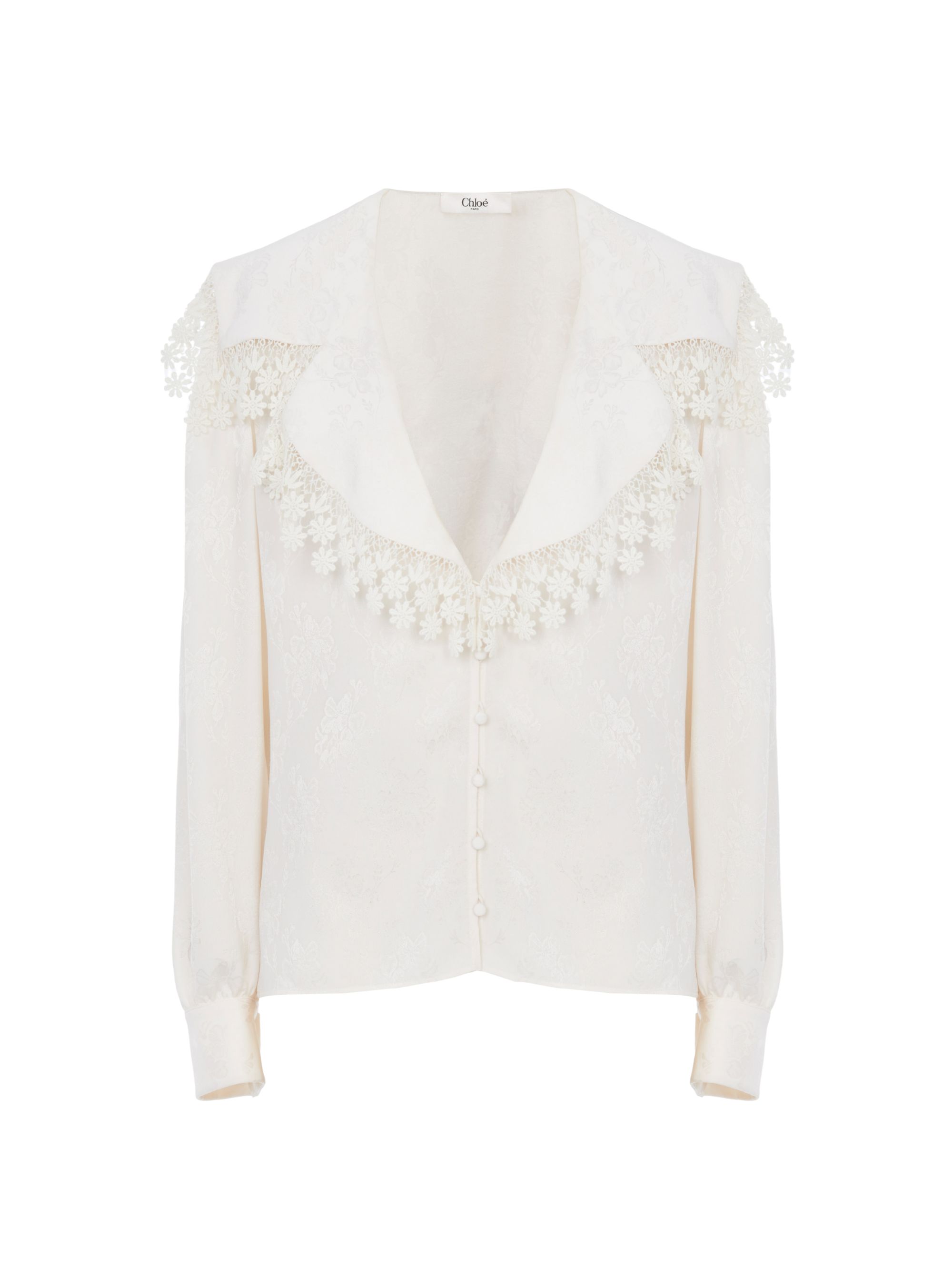 Camicia maniche lunghe con ricamo di CHLOE' bianca in jacquard di seta e pizzo, caratterizzata da bordo in pizzo floreale e bottoni in tessuto sul davanti e sui polsini.