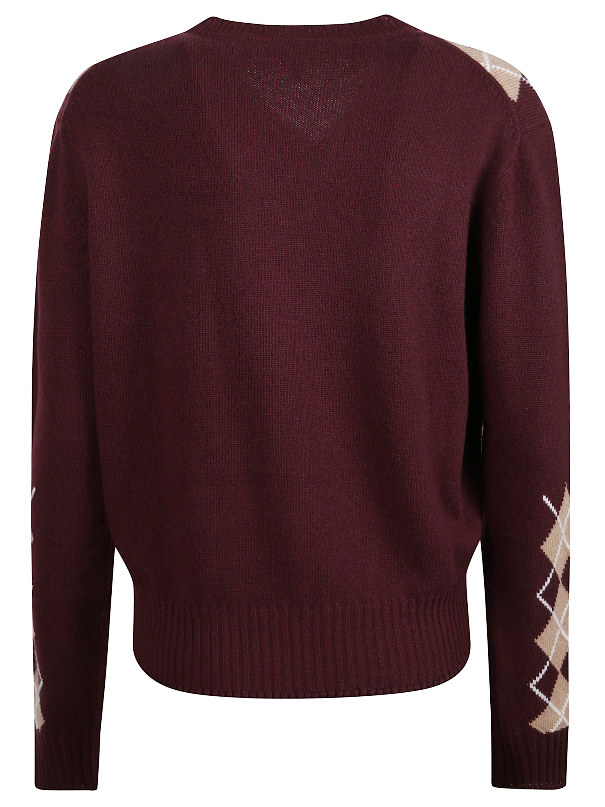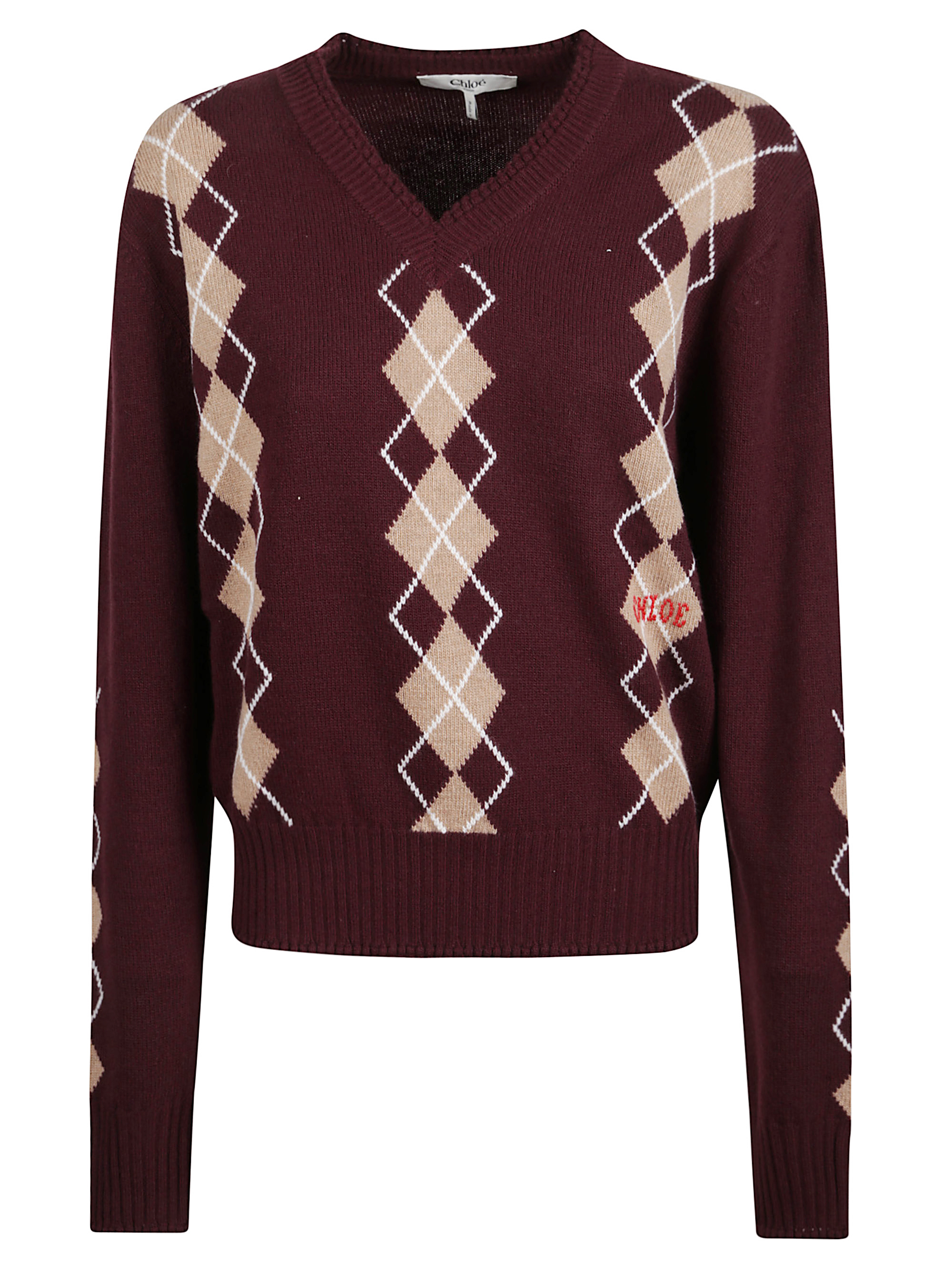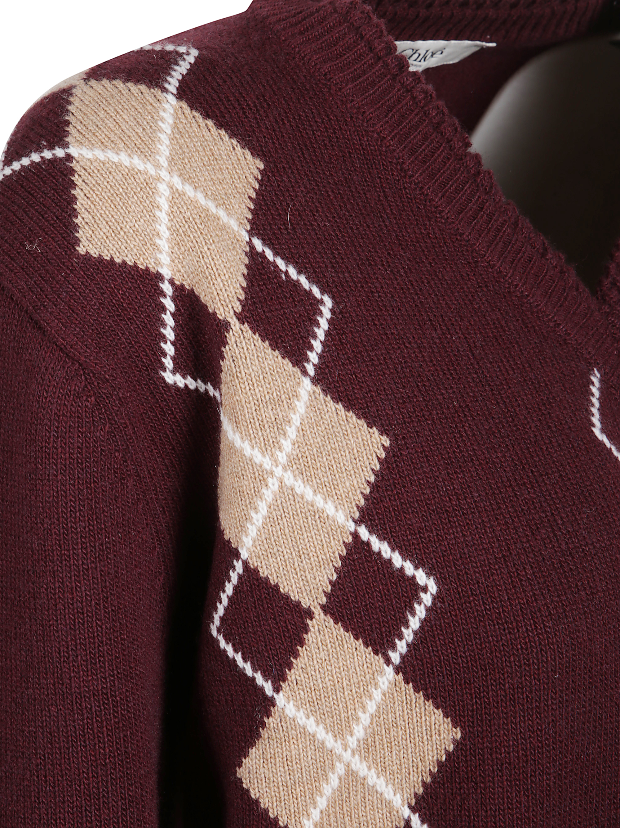 Maglione con scollo a V di CHLOE' multicolor in lana e cashmere, caratterizzato da motivo a rombi, bordi, polsini e scollo a costine e vestibilità regular.