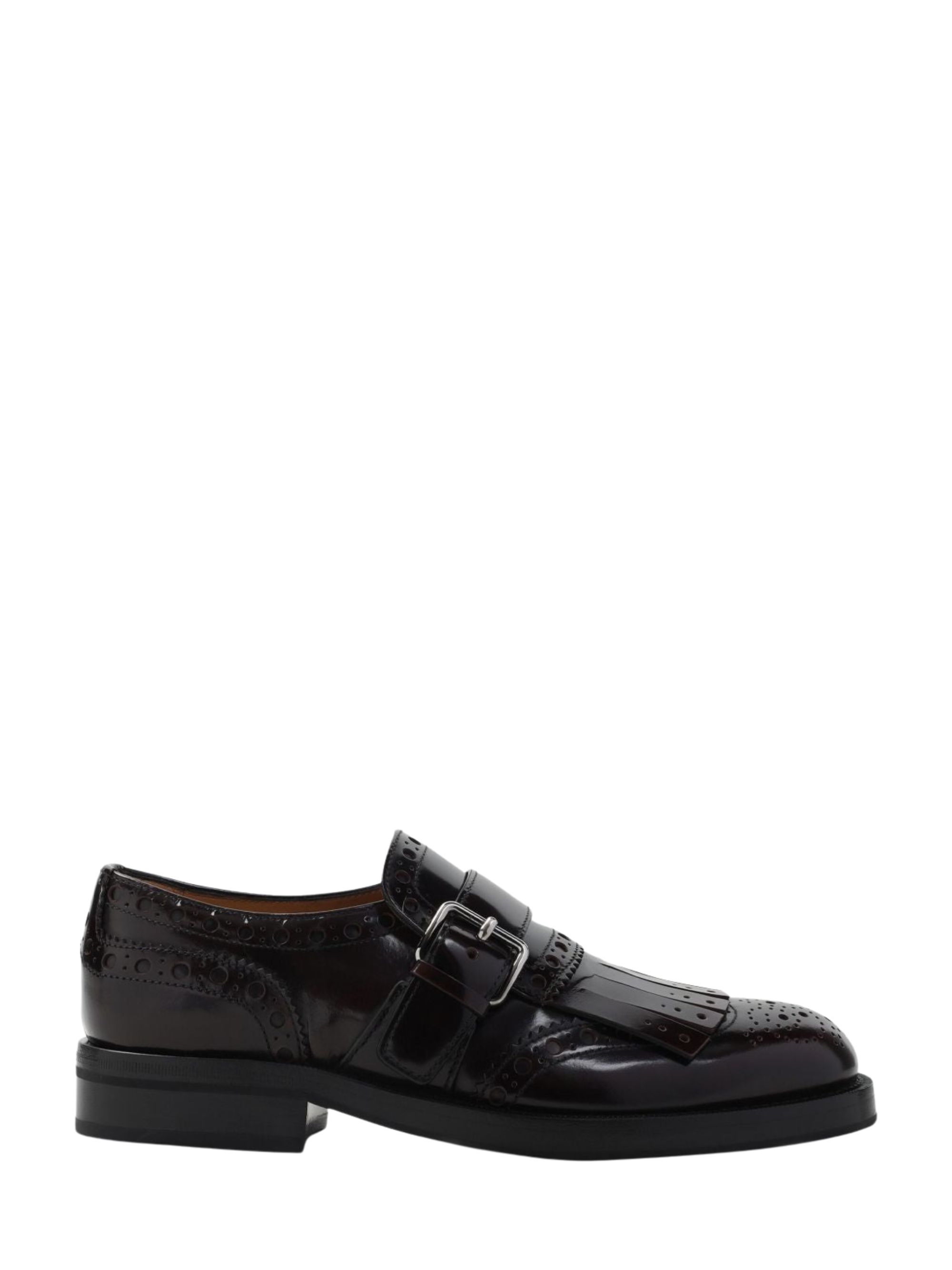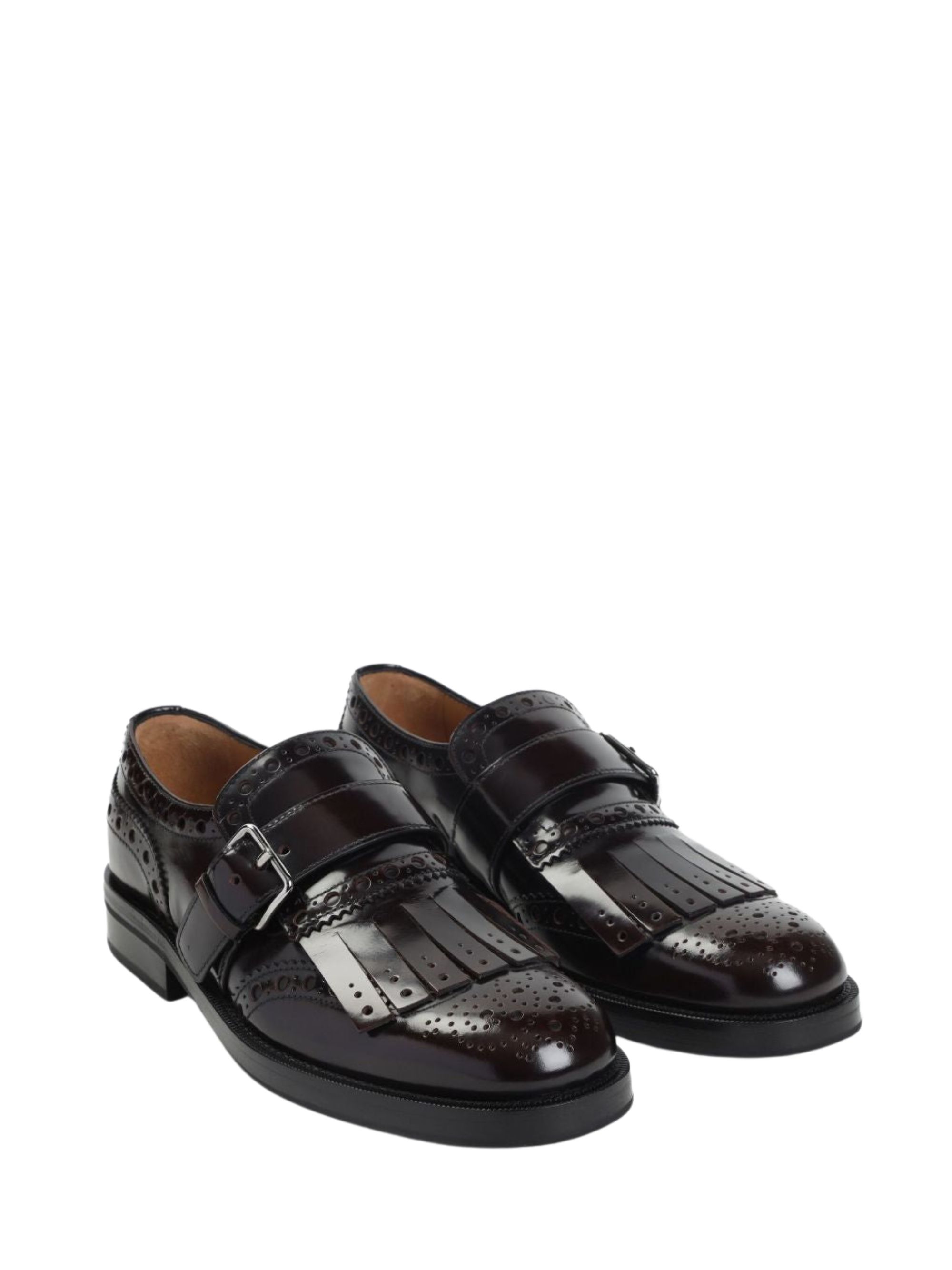 Mocassino Phillis di CHURCH'S borgogna in pelle spazzolata con lavorazione full-brogue, caratterizzato da punta tonda, dettaglio frange sulla linguetta, suola in gomma e chiusura laterale con fibbia.