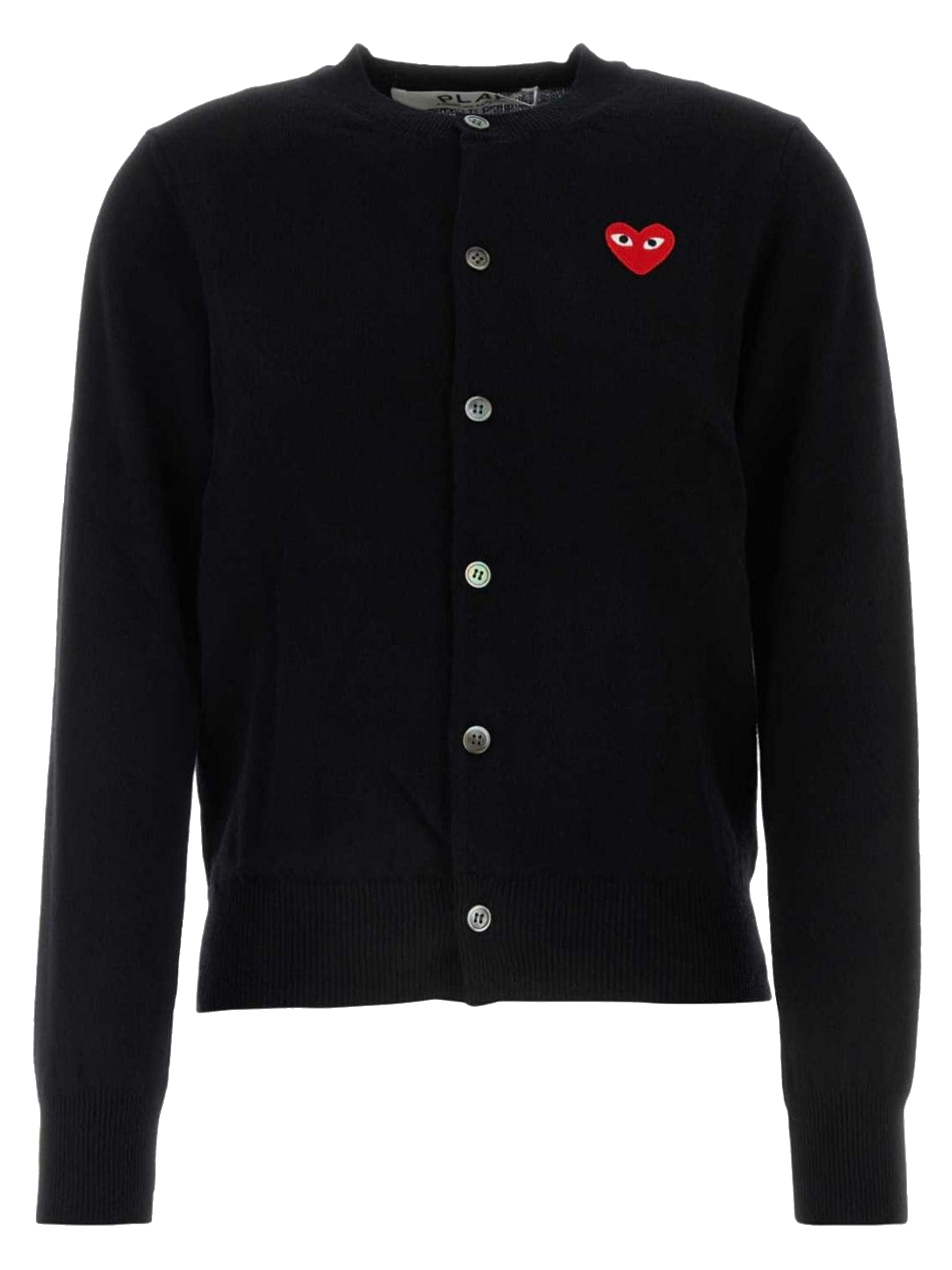 Cardigan con emblema a cuore rosso di COMME DES GARÇONS PLAY nero in lana, caratterizzato da chiusura con bottoni, logo sul petto e polsini e orlo a costine.