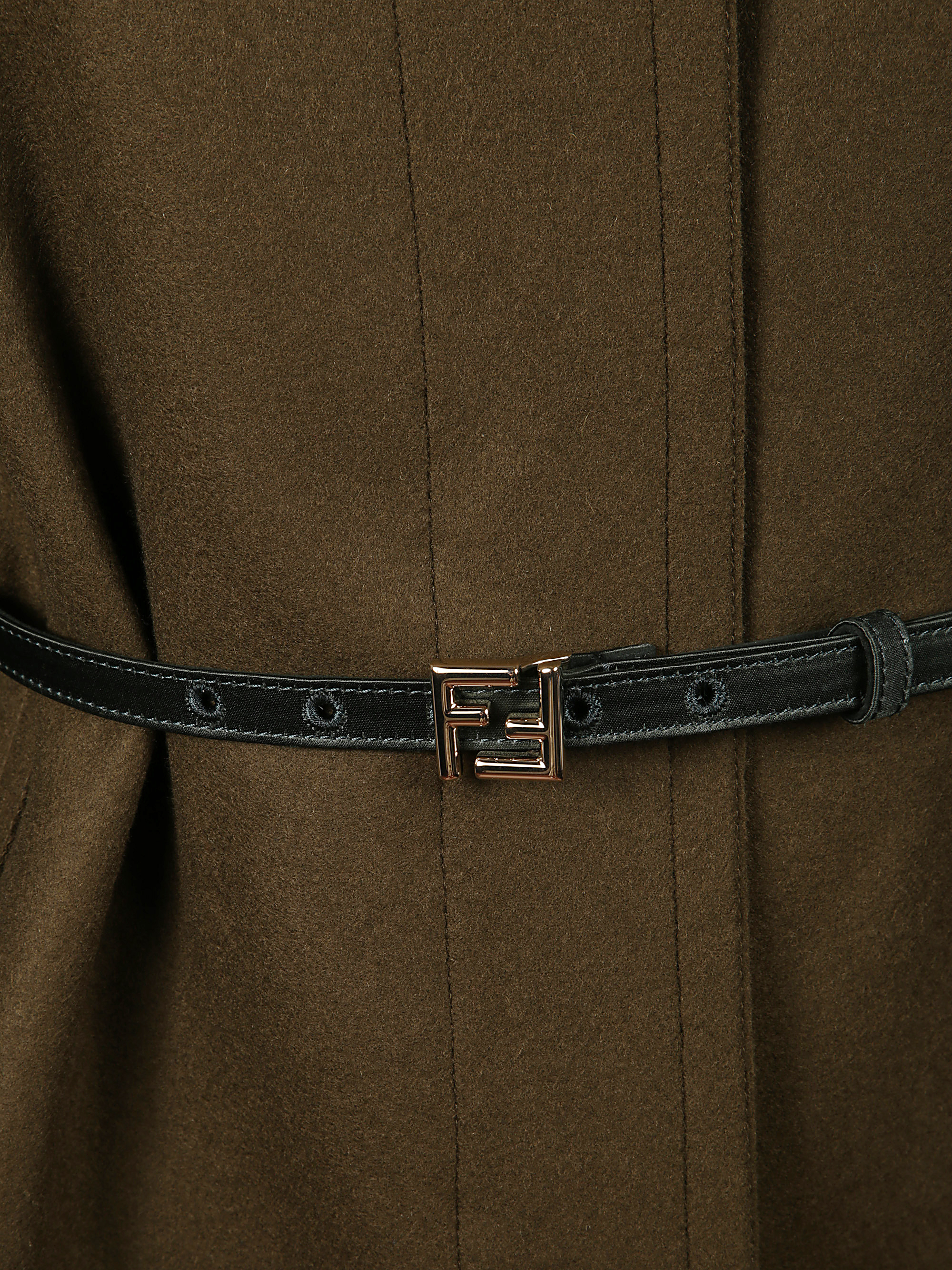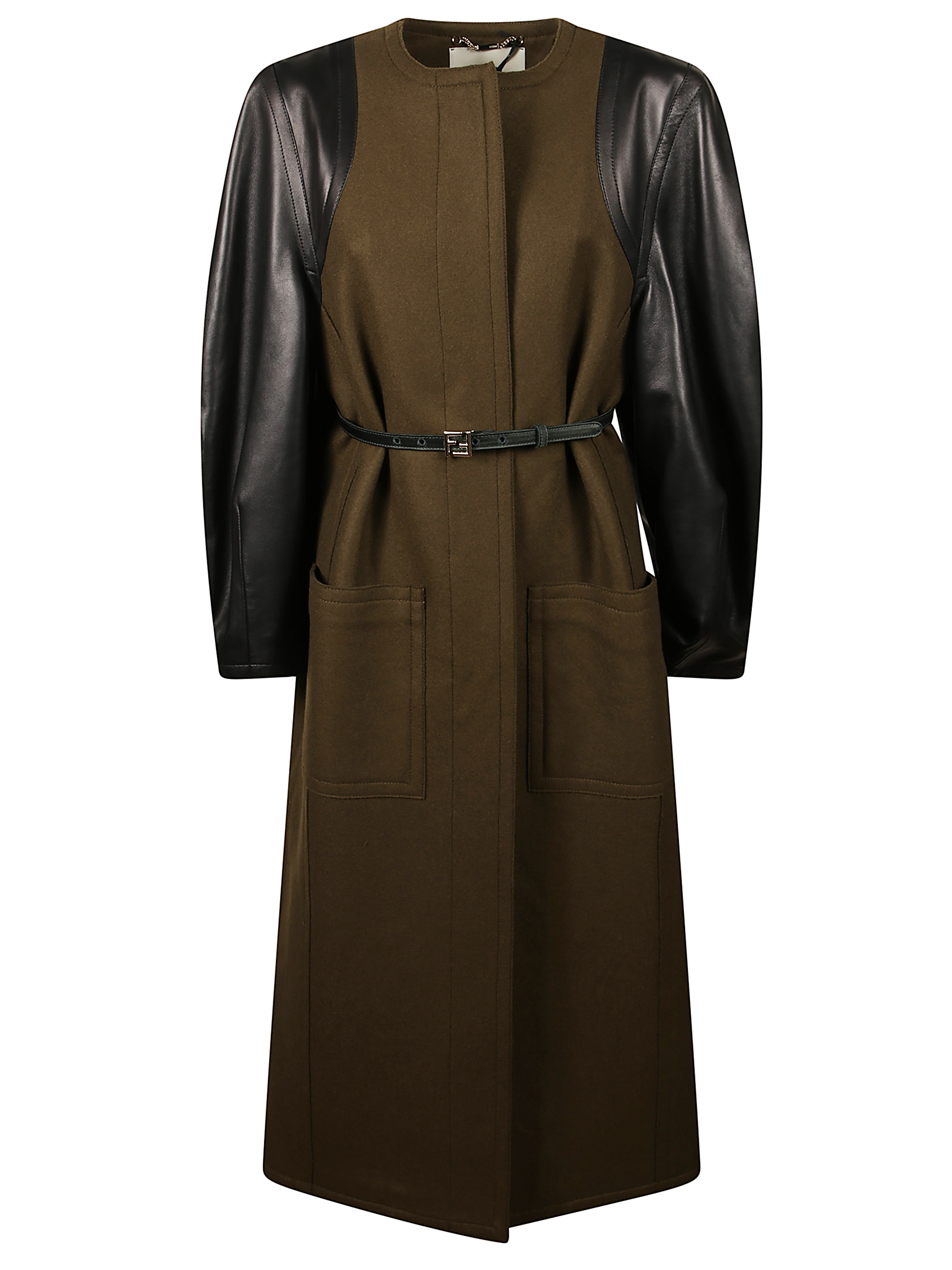 Cappotto midi monopetto di FENDI verde in feltro di lana, caratterizzato da linea cocoon con ampie maniche lunghe e scollo a giro, chiusura frontale nascosta, maniche in nappa nera e tasche.