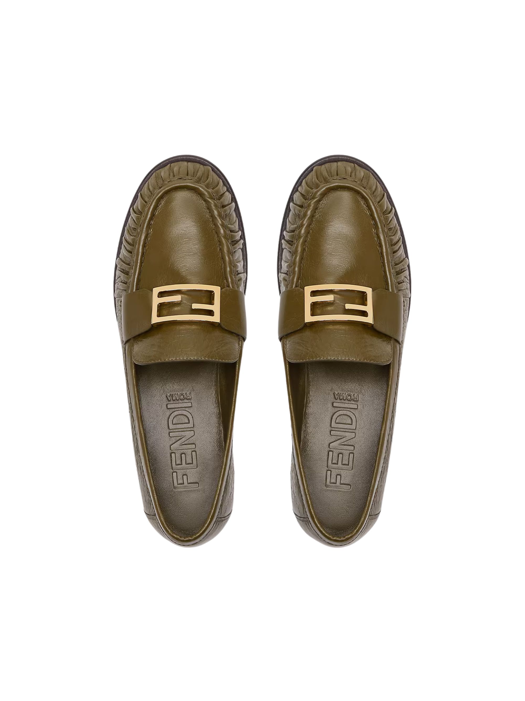 Mocassino Baguette di FENDI verde in pelle, caratterizzato da punta stondata, accessorio FF Baguette sulla mascherina, vaschetta arricciata, suola in cuoio con isola in gomma antiscivolo e costruzione flessibile a sacchetto.