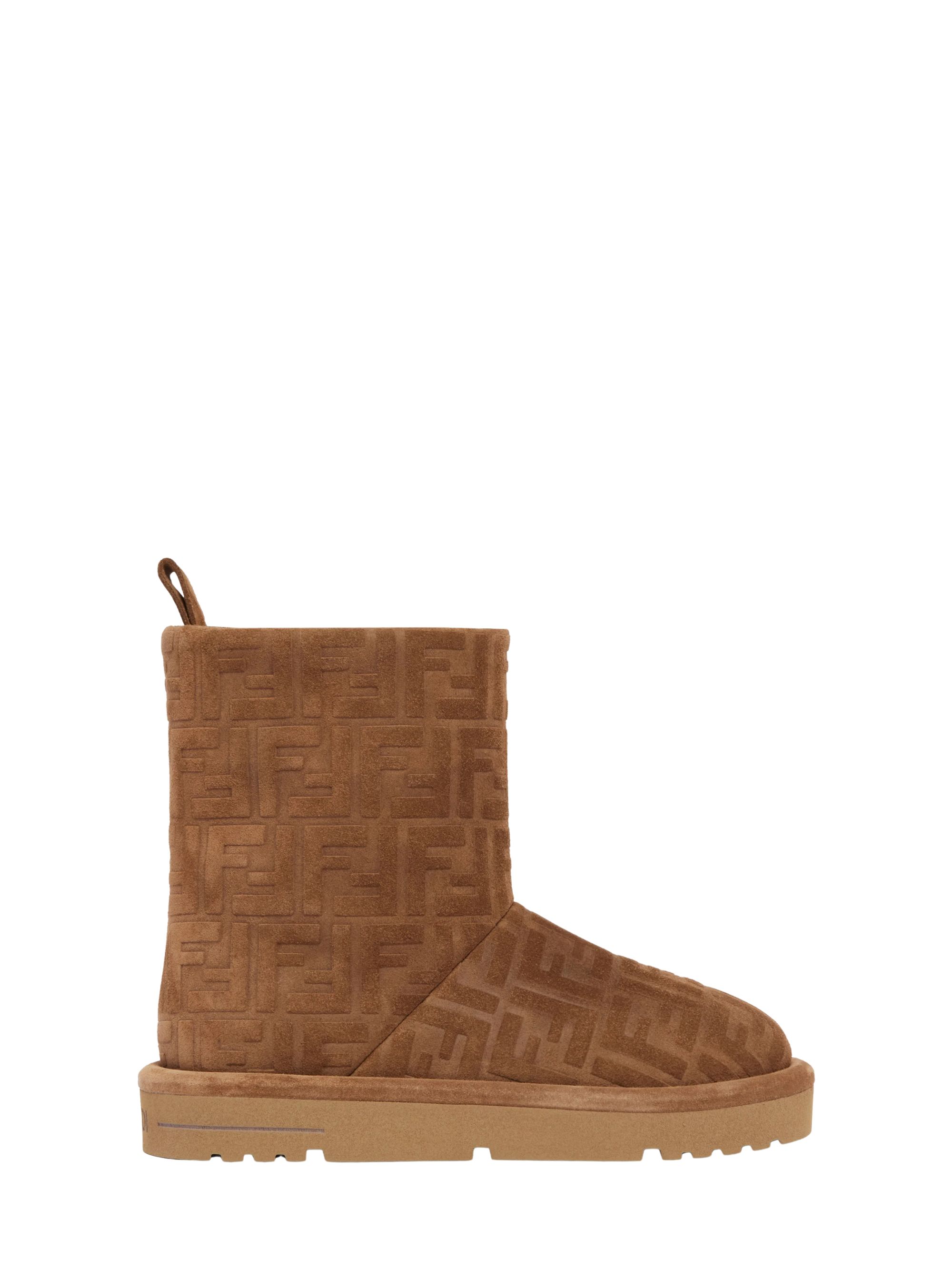 Stivale après-ski basso di FENDI marrone in camoscio FF, caratterizzato da punta tonda, costruzione pull-on, motivo FF all over, fodera in montone bianco, suola in gomma e logo FF.