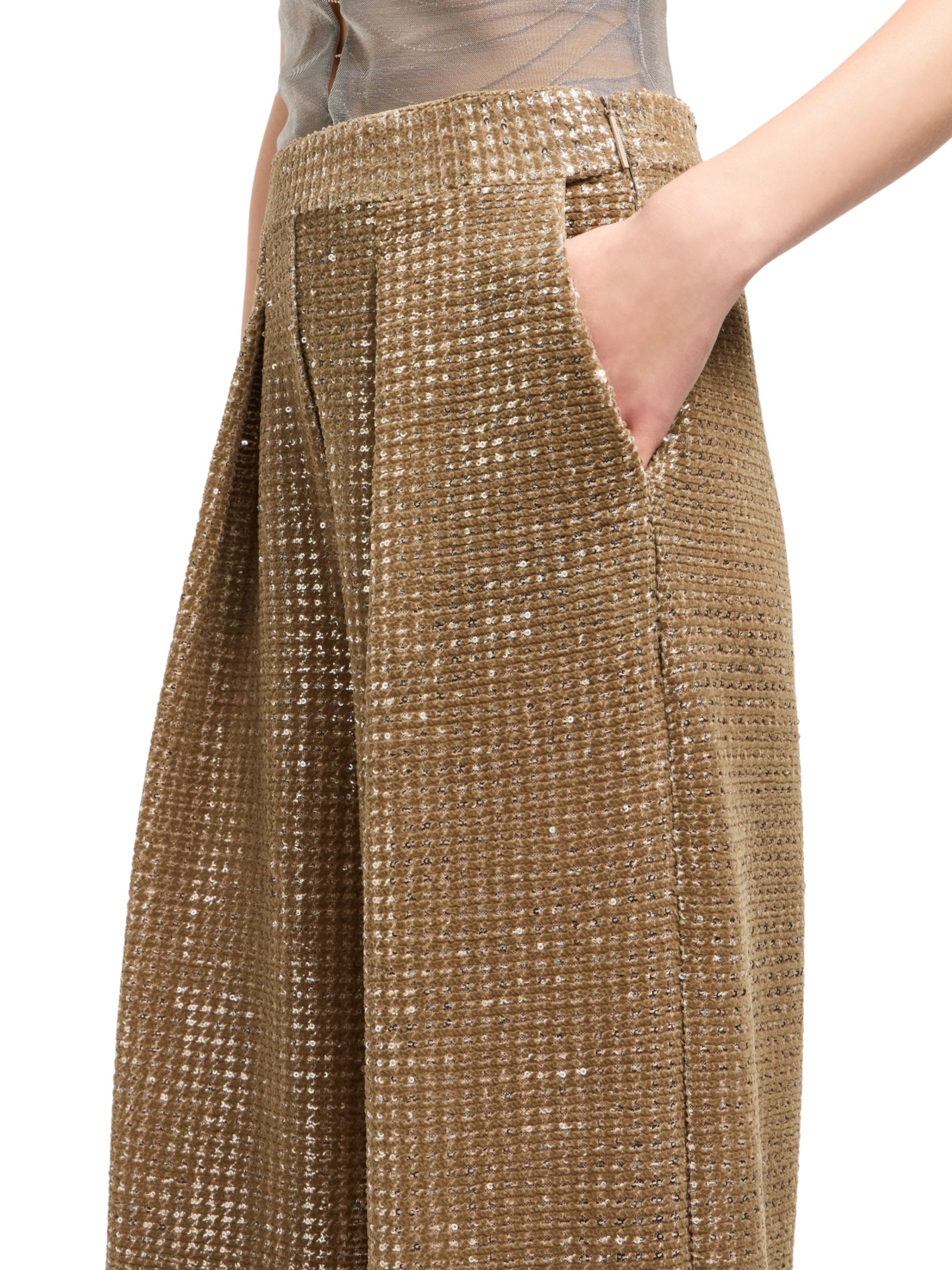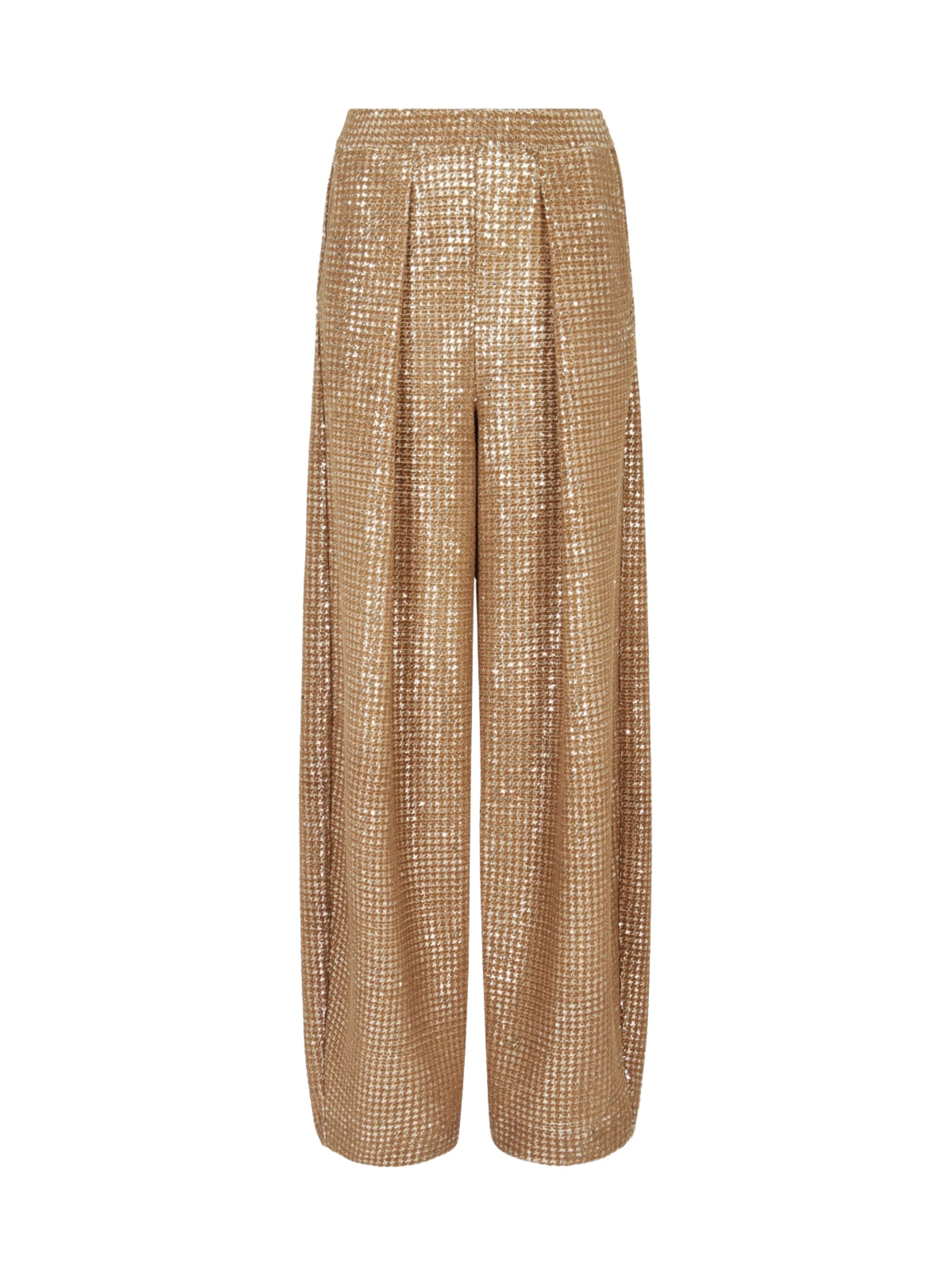 Pantalone in jersey lucido di GIORGIO ARMANI beige, caratterizzato da stampa floccata bicolore, paillettes, chiusura laterale con zip e due tasche oblique.