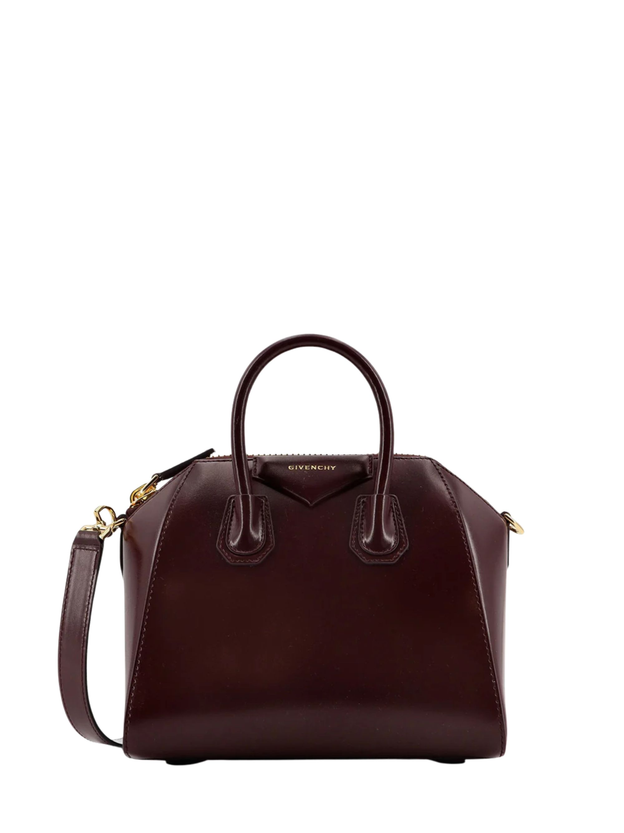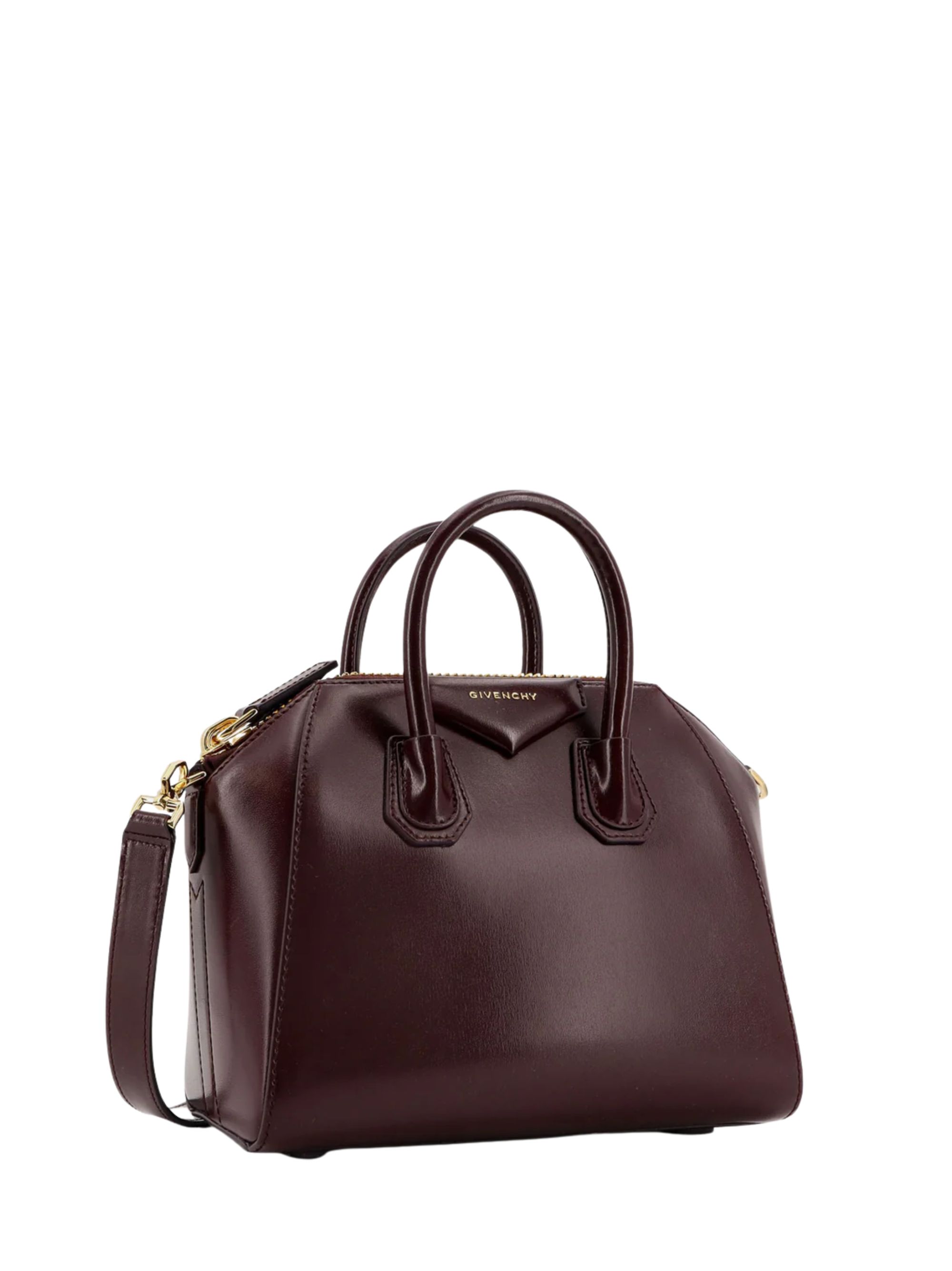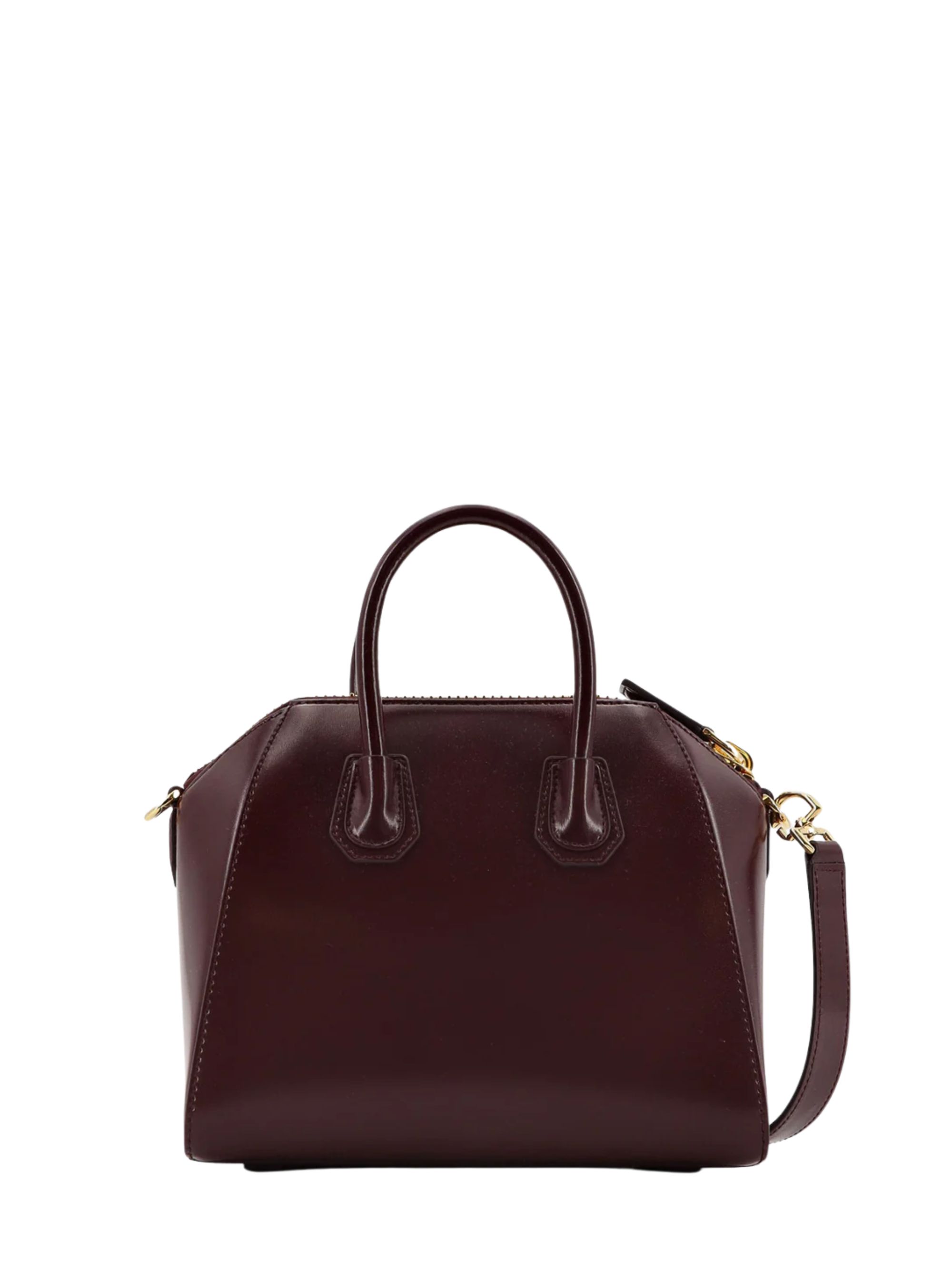 Borsa Antigona mini di GIVENCHY borgogna in pelle con doppio manico in pelle, tracolla rimovibile in pelle, hardware oro, logo, tasca interna con zip e chiusura con zip.