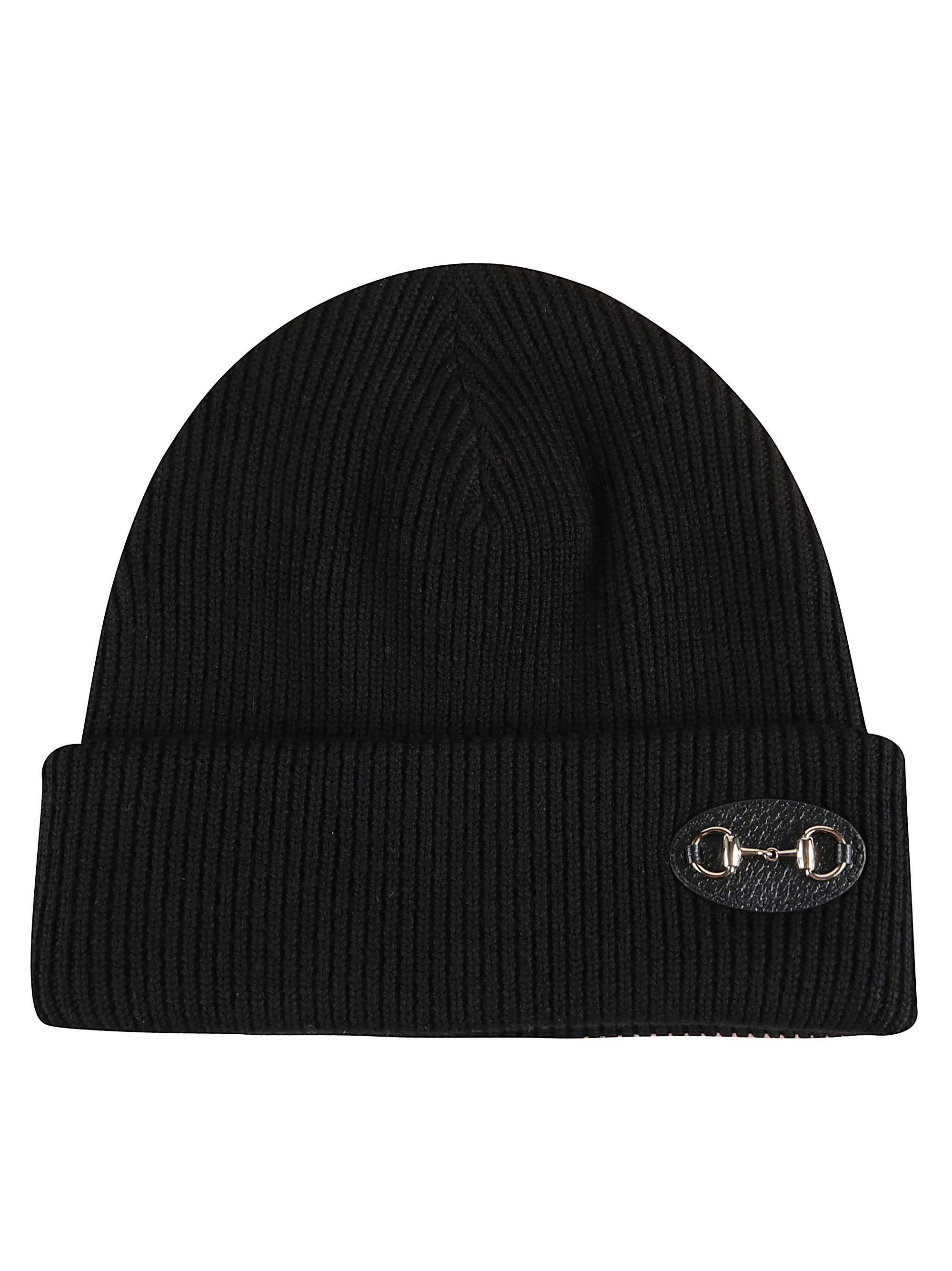 Cappello con morsetto di GUCCI nero in lana, caratterizzato da patch in pelle con logo e morsetto dorato.