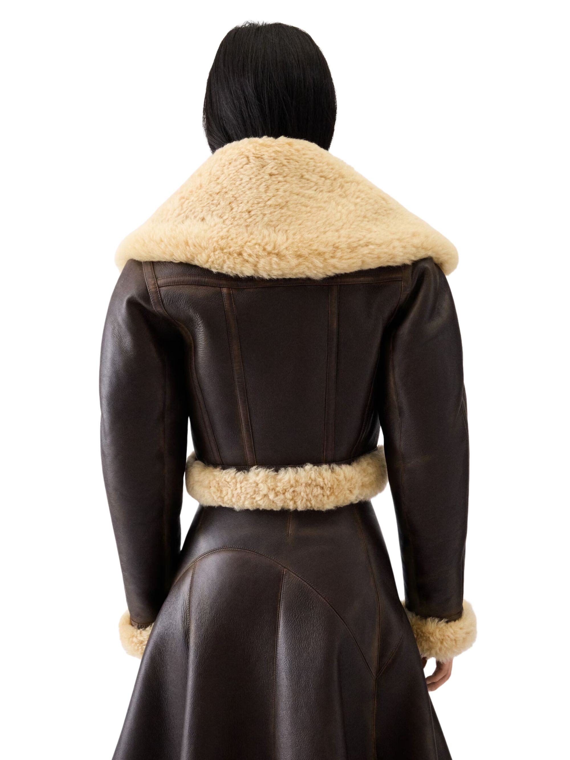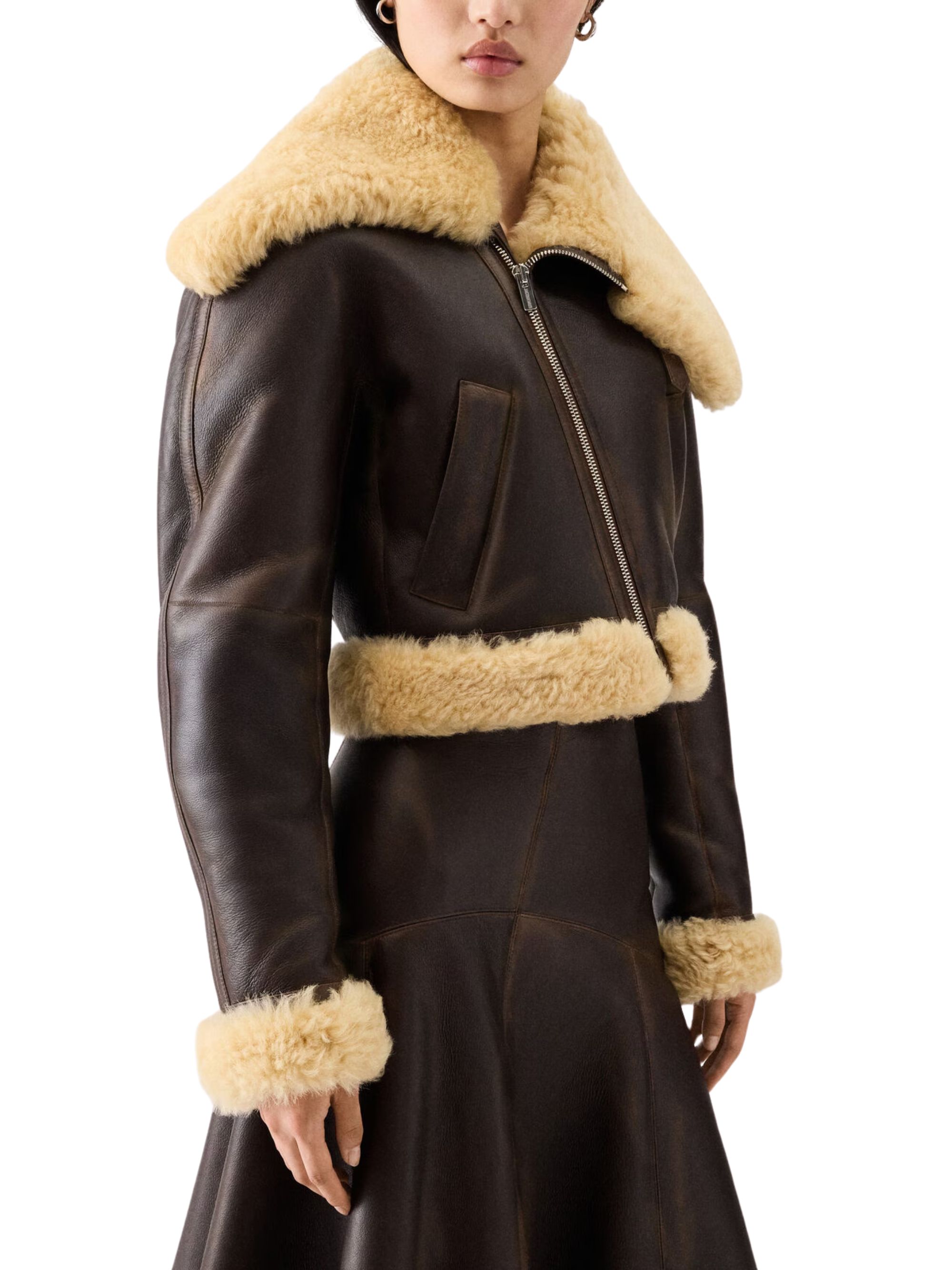 Giacca Aviatore di JACQUEMUS marrone in pelle, caratterizzata da collo asimmetrico in pelliccia con cintura regolabile, chiusura con zip obliqua, tasche a filetto e polsini e orlo rifiniti in pelliccia.