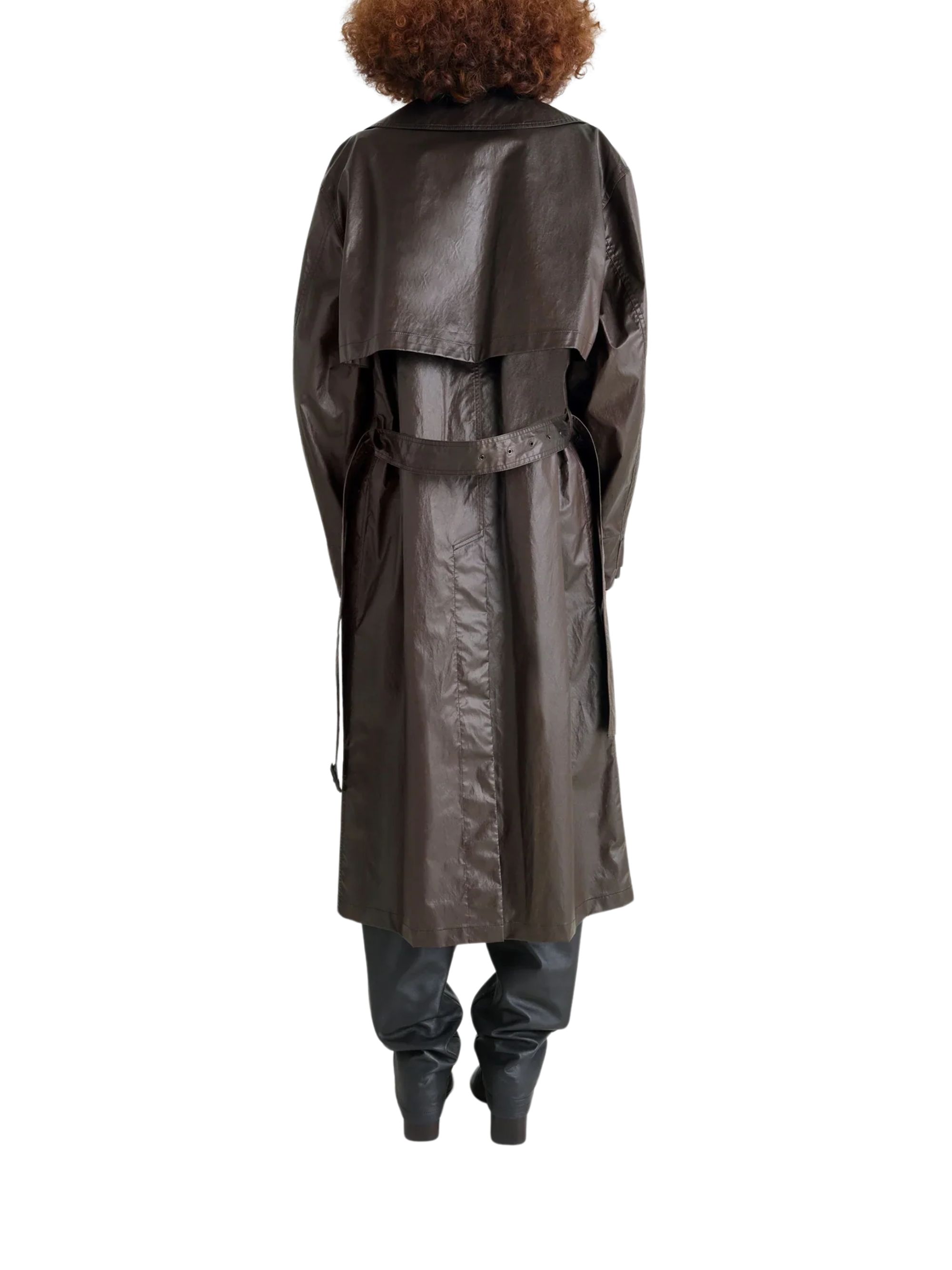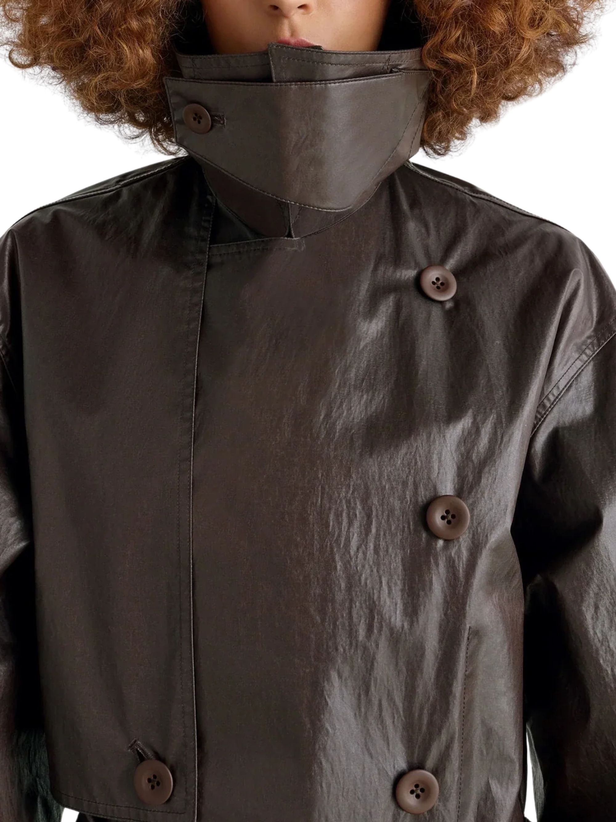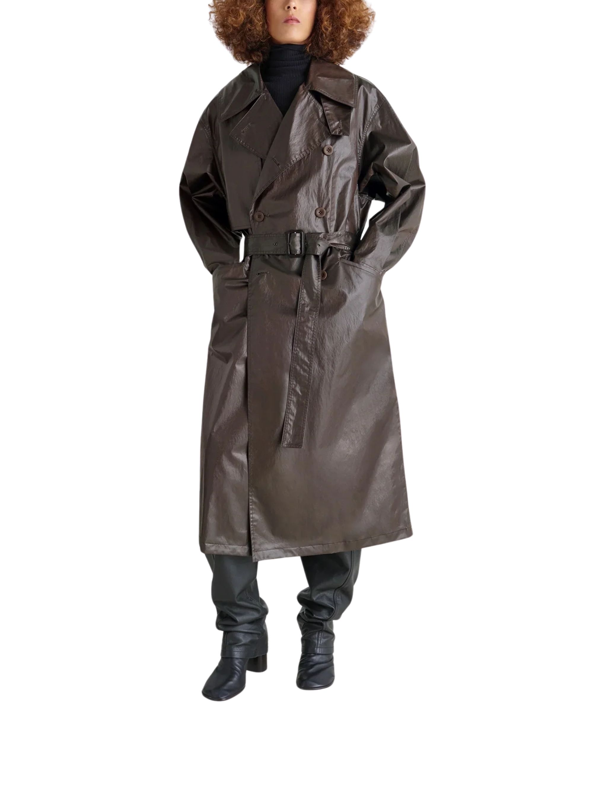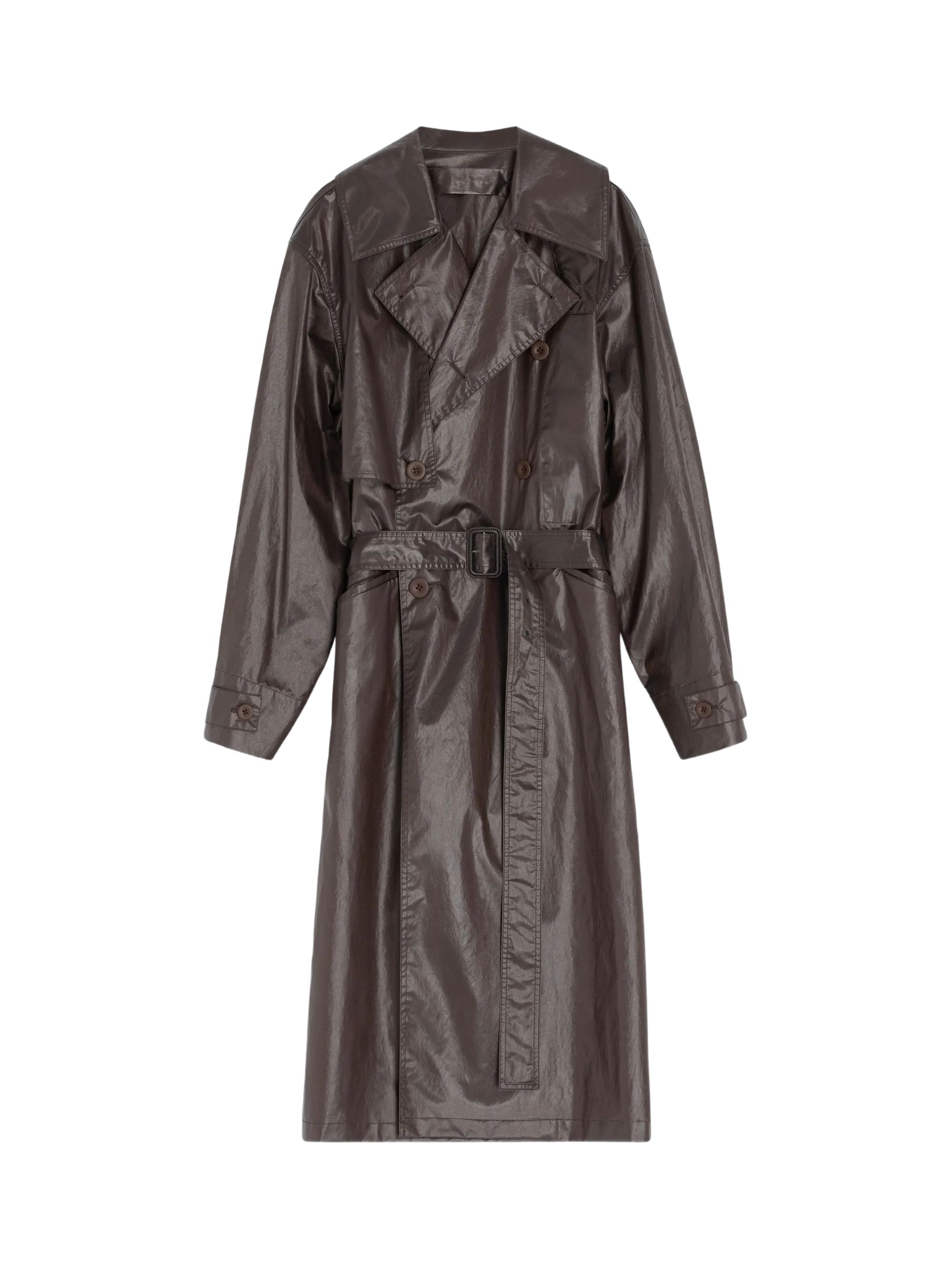 Trench lungo oversize di LEMAIRE in cotone lucido e idrorepellente, caratterizzato da collo sartoriale con cinturino, sottogola Patte antivento con bottoni, chiusura a doppio petto con bottoni, cintura rimovibile e spacco posteriore.