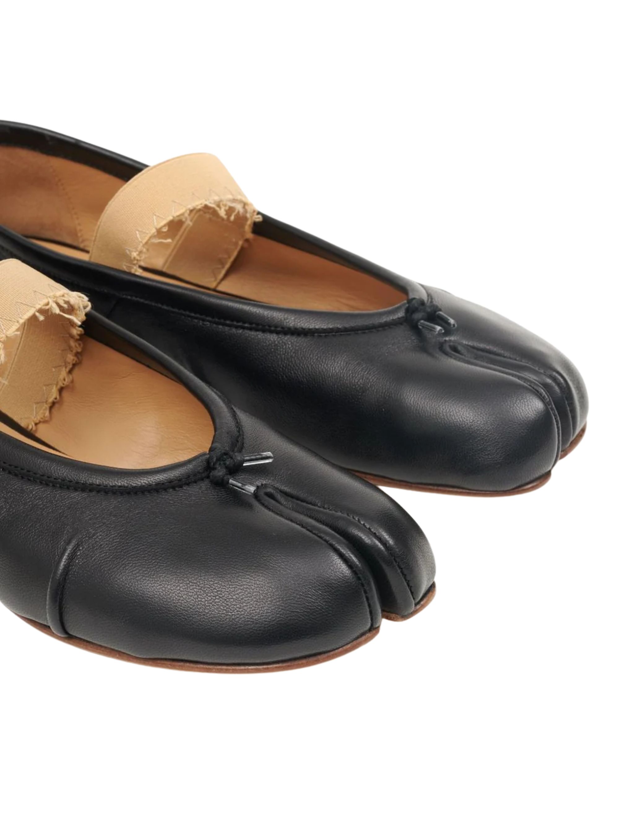 Ballerina Tabi con fascia elastica di MAISON MARGIELA nera in pelle, caratterizzata da nodo in cotone sul davanti, pieghe in pelle realizzate a mano, logo sulla suola e impuntura bianca sul retro.