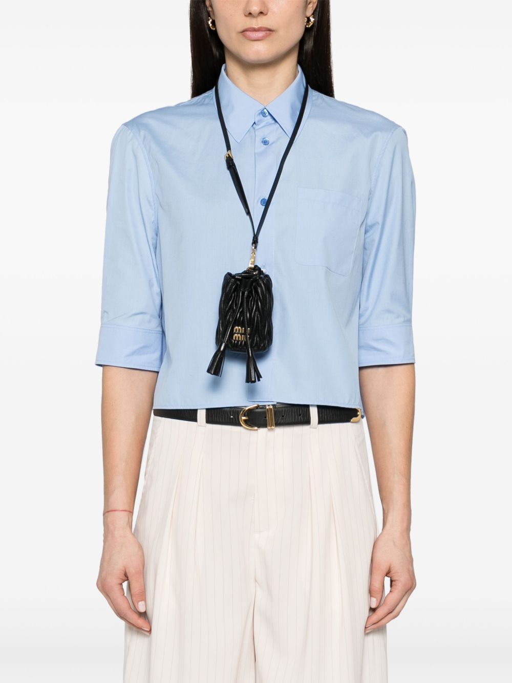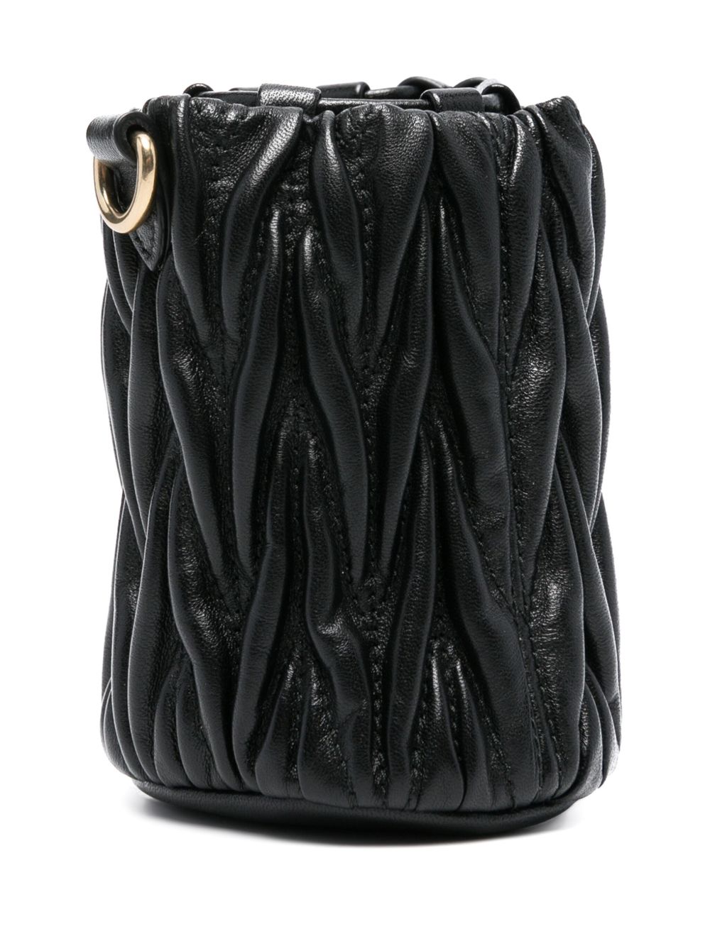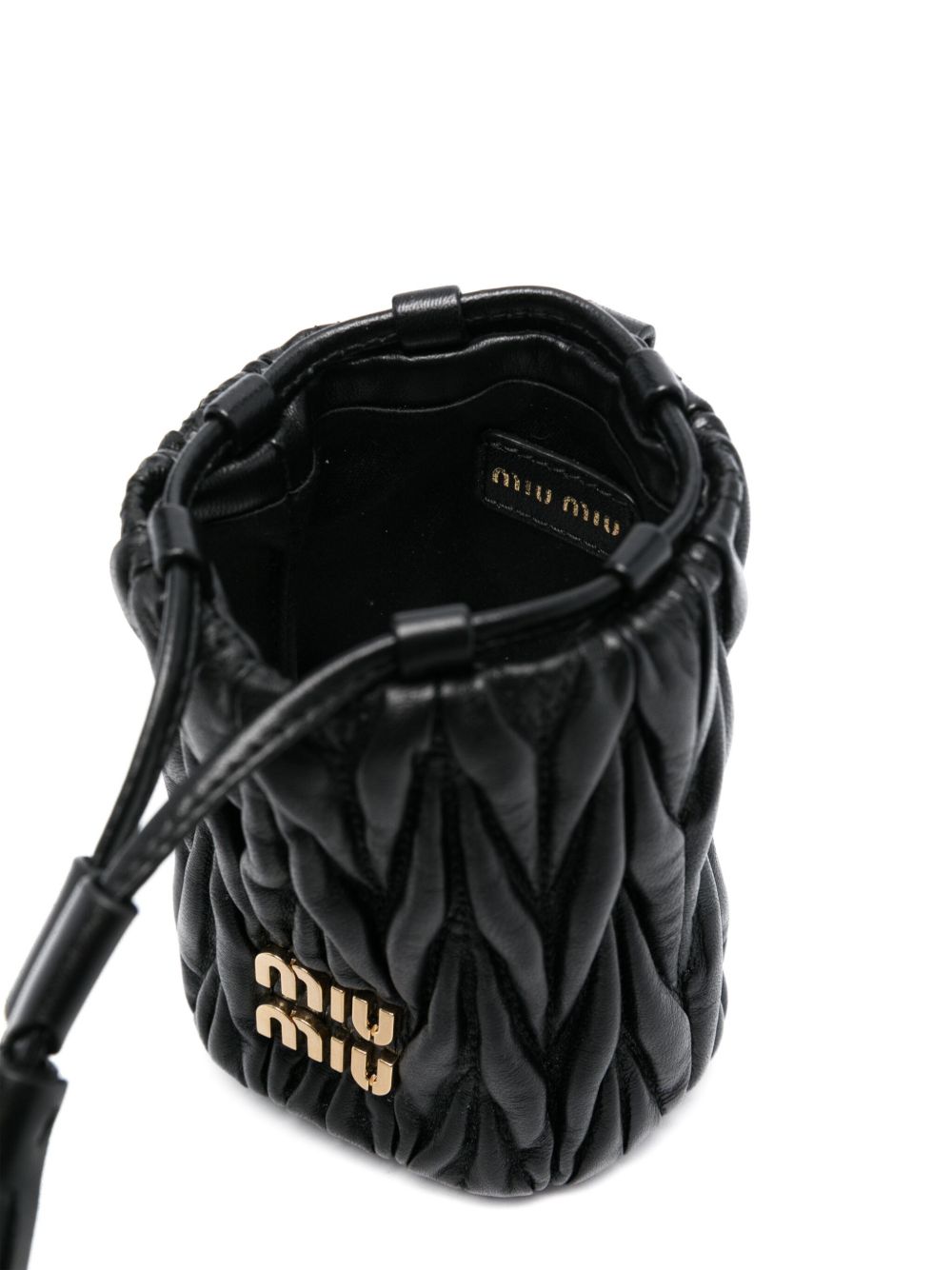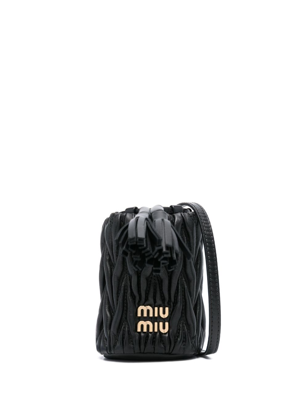 Borsa mini di MIU MIU nera in nappa matelassé, caratterizzata da logo MIU MIU sul fronte, chiusura con coulisse e tracolla regolabile.