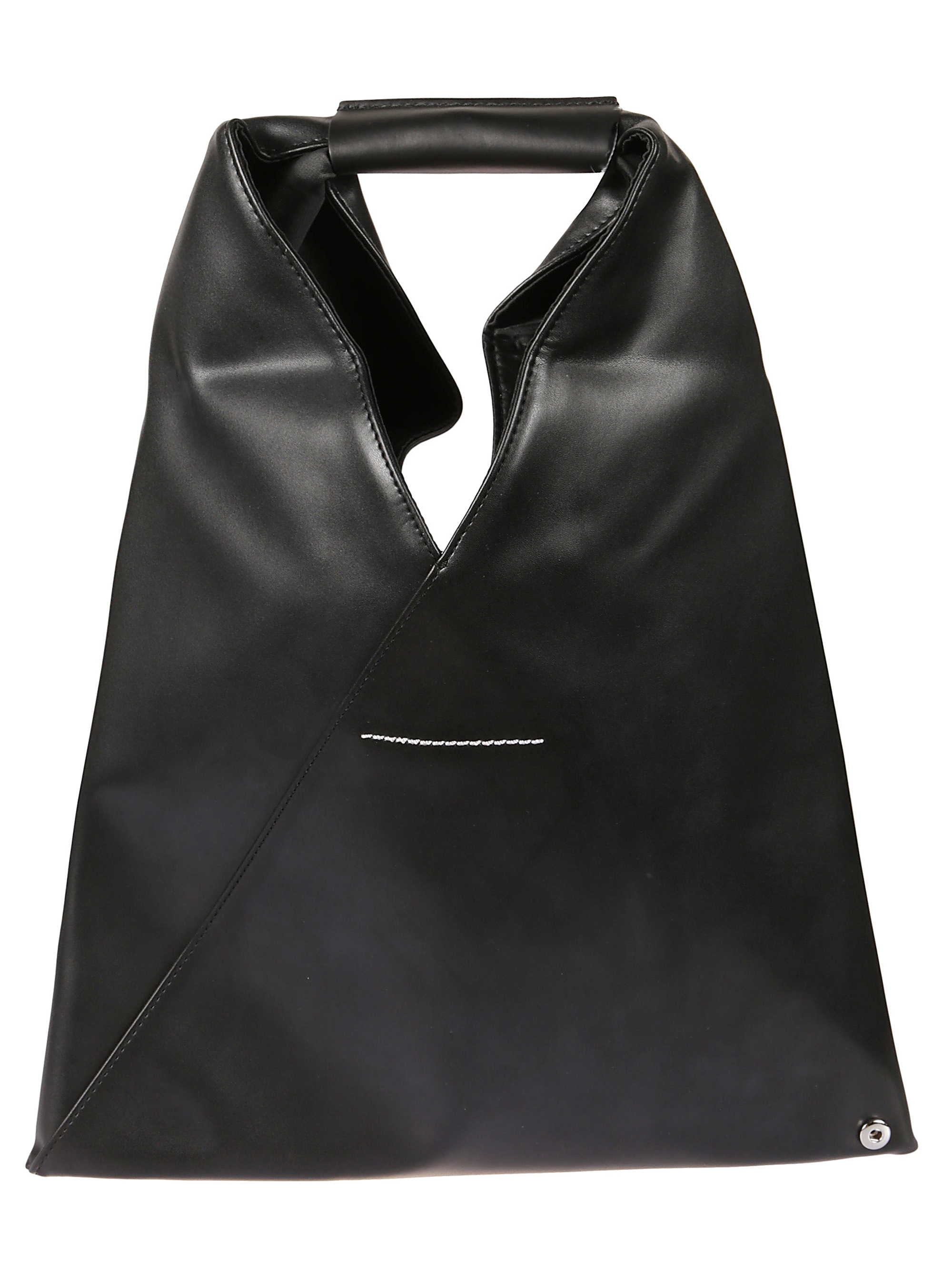 Borsa Giapponese classica piccola di MM6 nera in similpelle, caratterizzata da silhouette triangolare morbida, bottoni sui bordi, maniglia superiore con firma numerica impressa e linea di cucitura bianca sul retro.