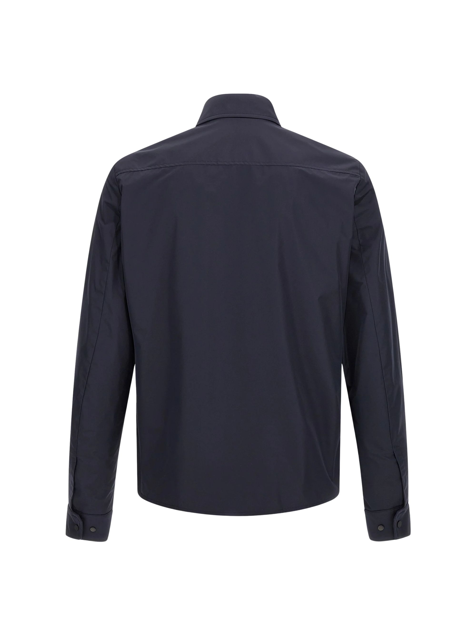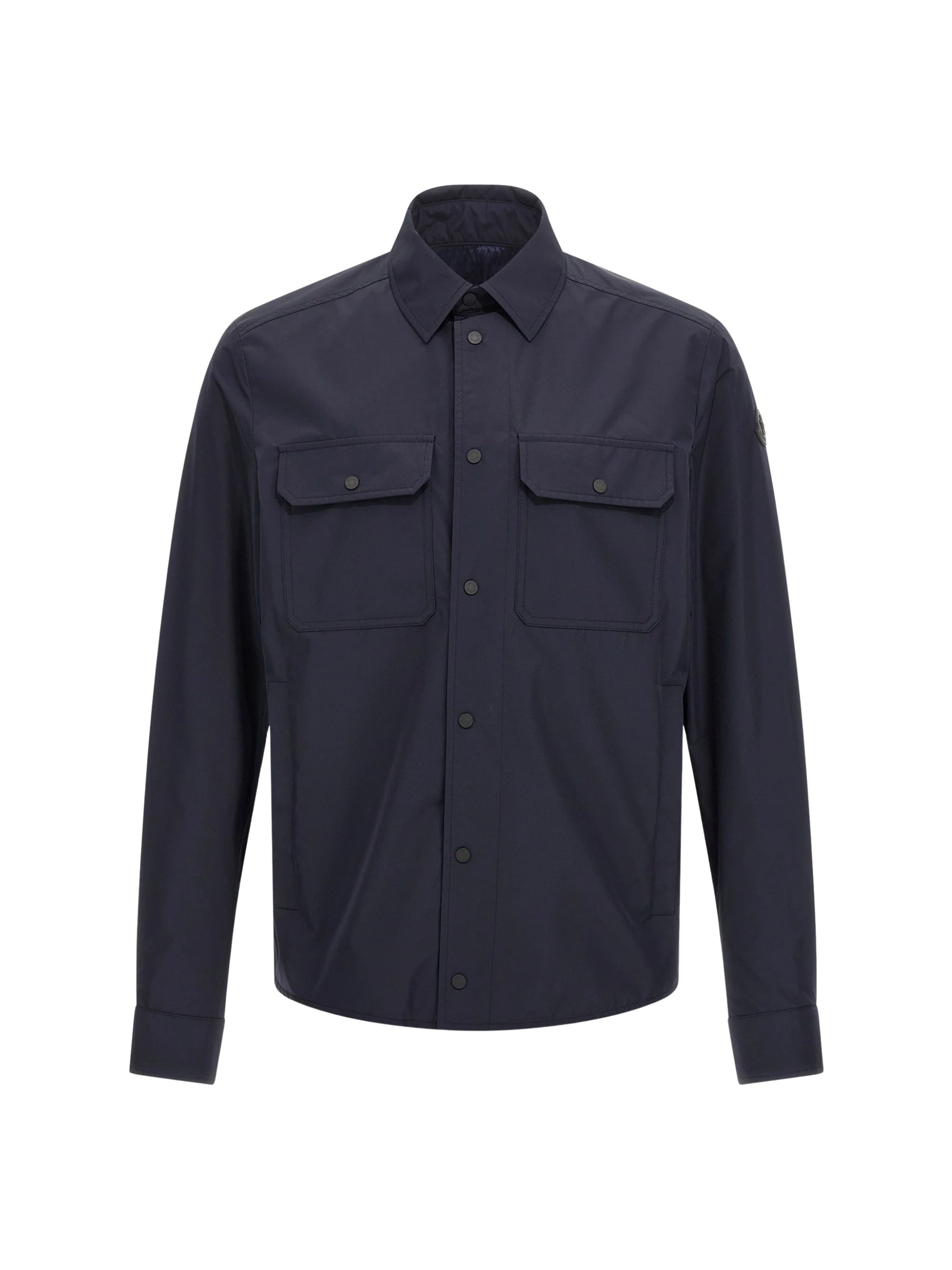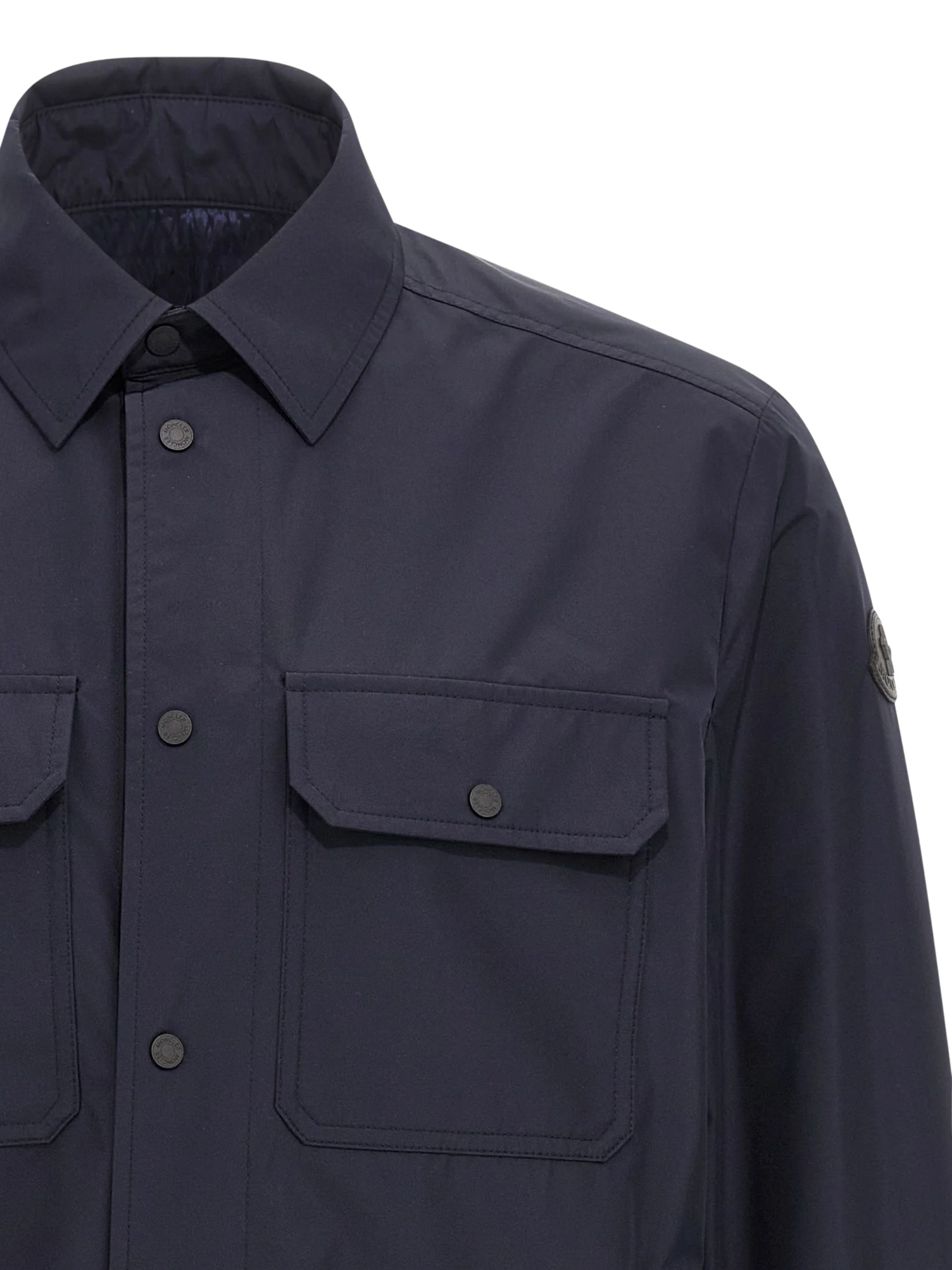 Camicia con logo di MONCLER blu in tessuto idrorepellente, caratterizzata da chiusura con zop e bottoni, maniche lunghe con polsini e patch con logo in pelle tono su tono.