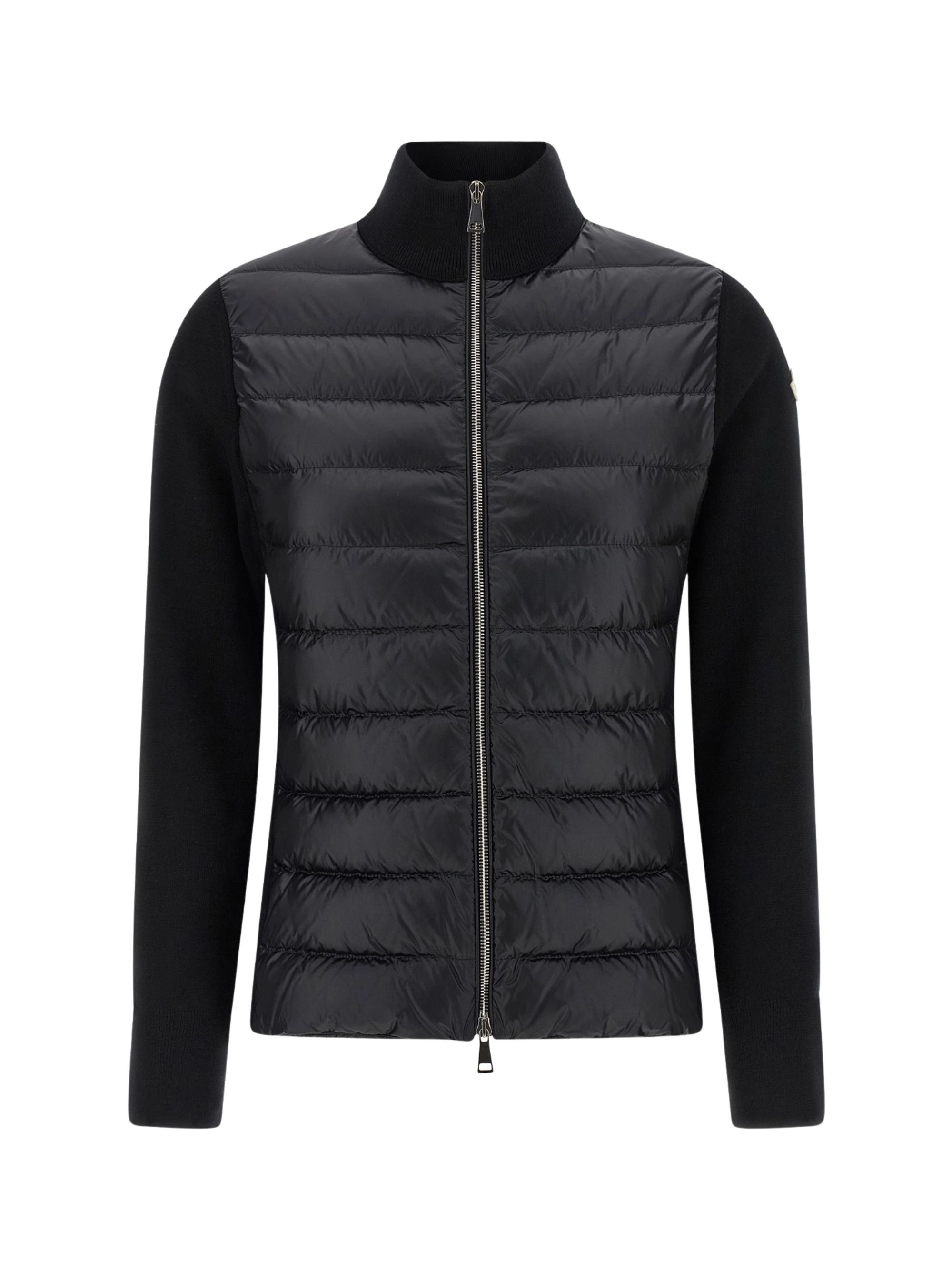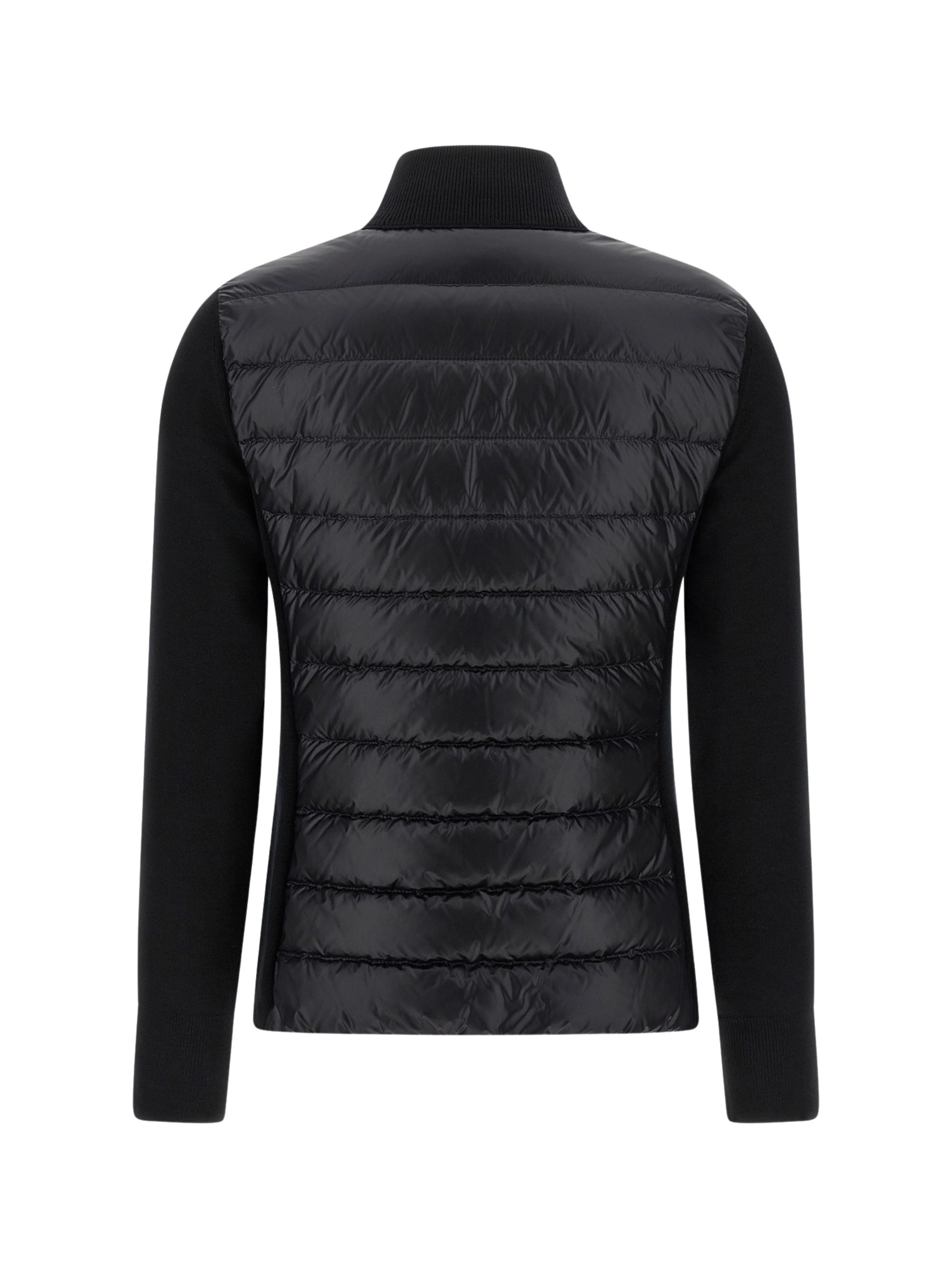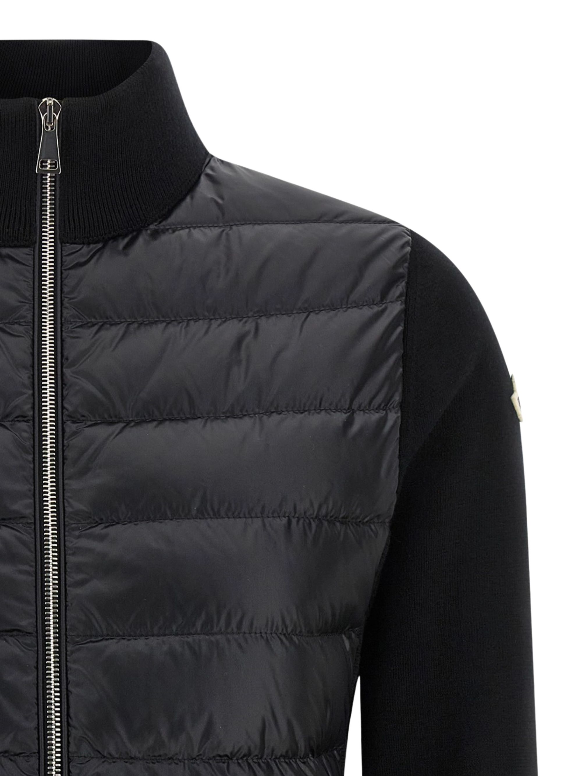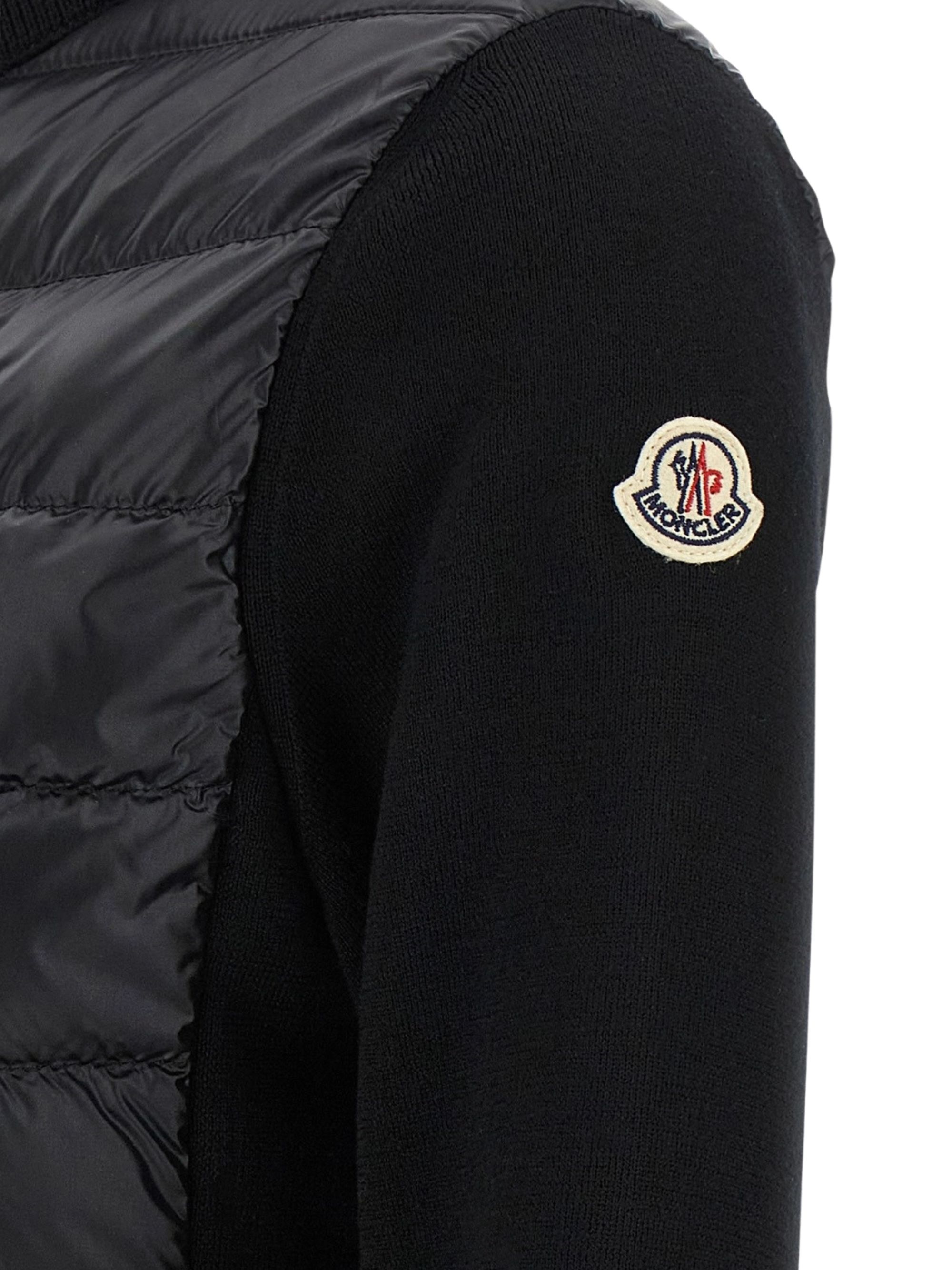 Cardigan bimateriale di MONCLER nero in lana con gilet imbottito in piuma d'oca, caratterizzato da collo alto, chiusura con zip e patch logo in feltro.