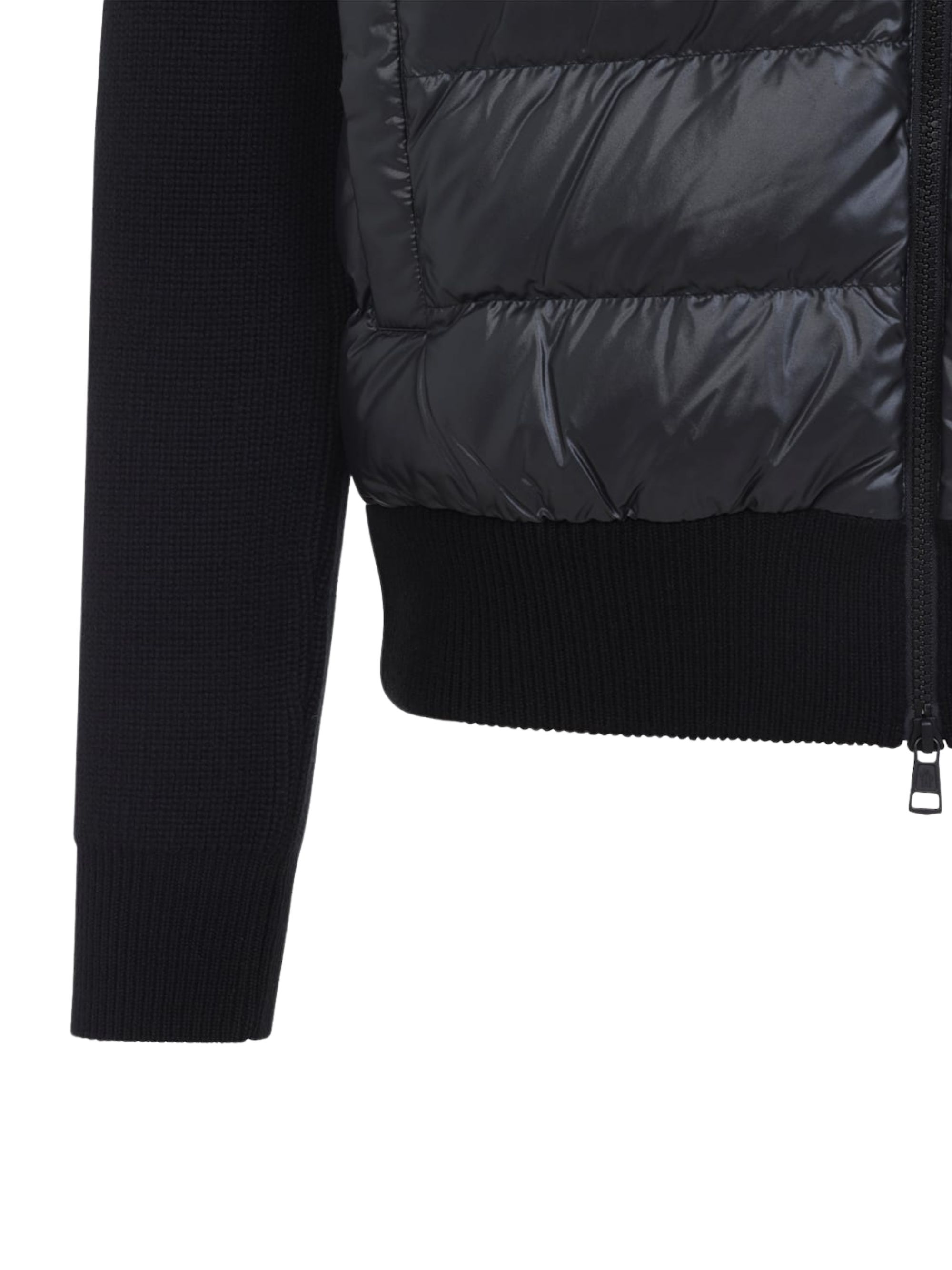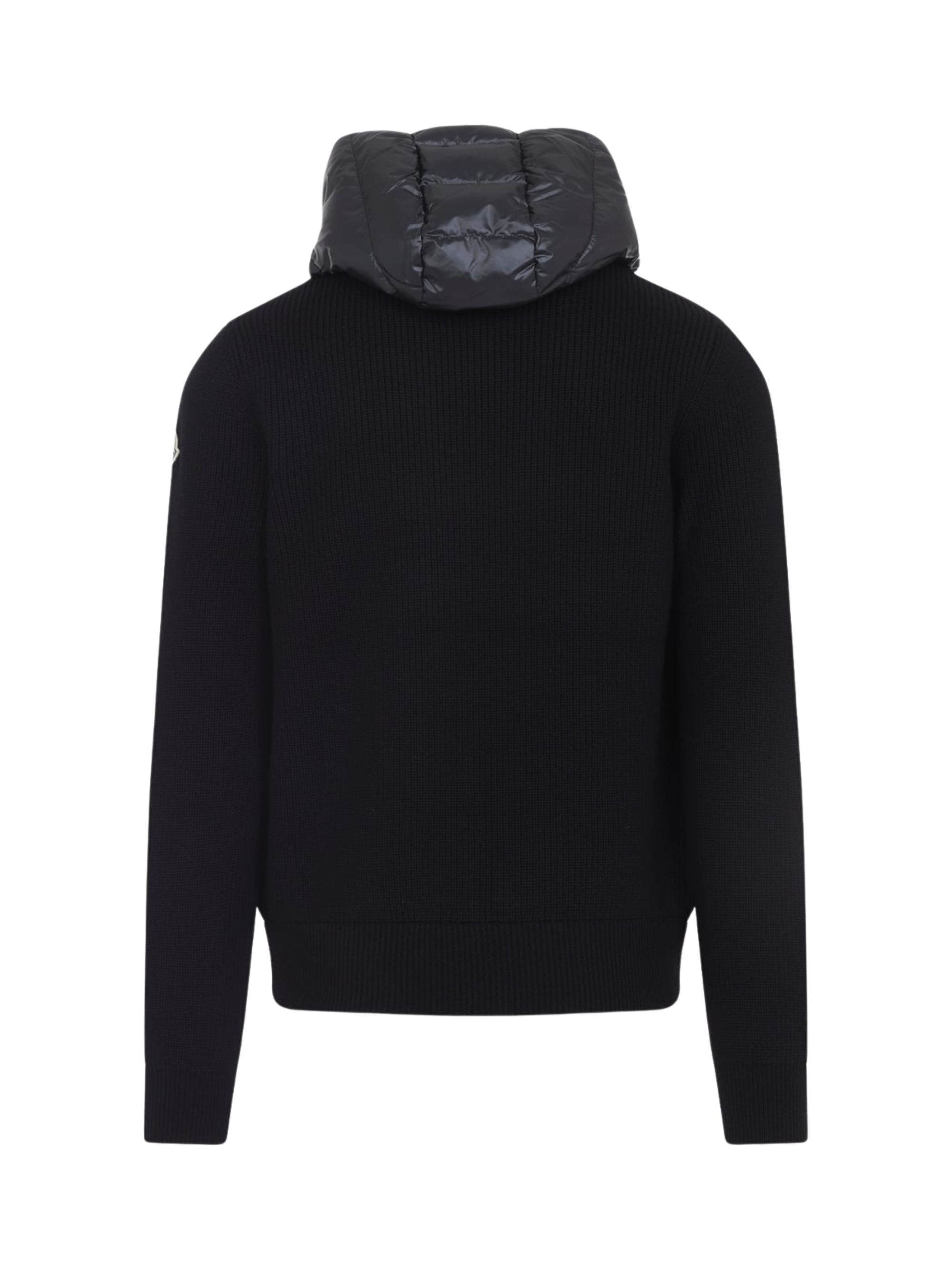 Cardigan imbottito lucido di MONCLER in lana, caratterizzato da cappuccio, chiusura con zip, due tashce con bottone sul davanti, polsini e orlo a coste e logo patch sulla manica.