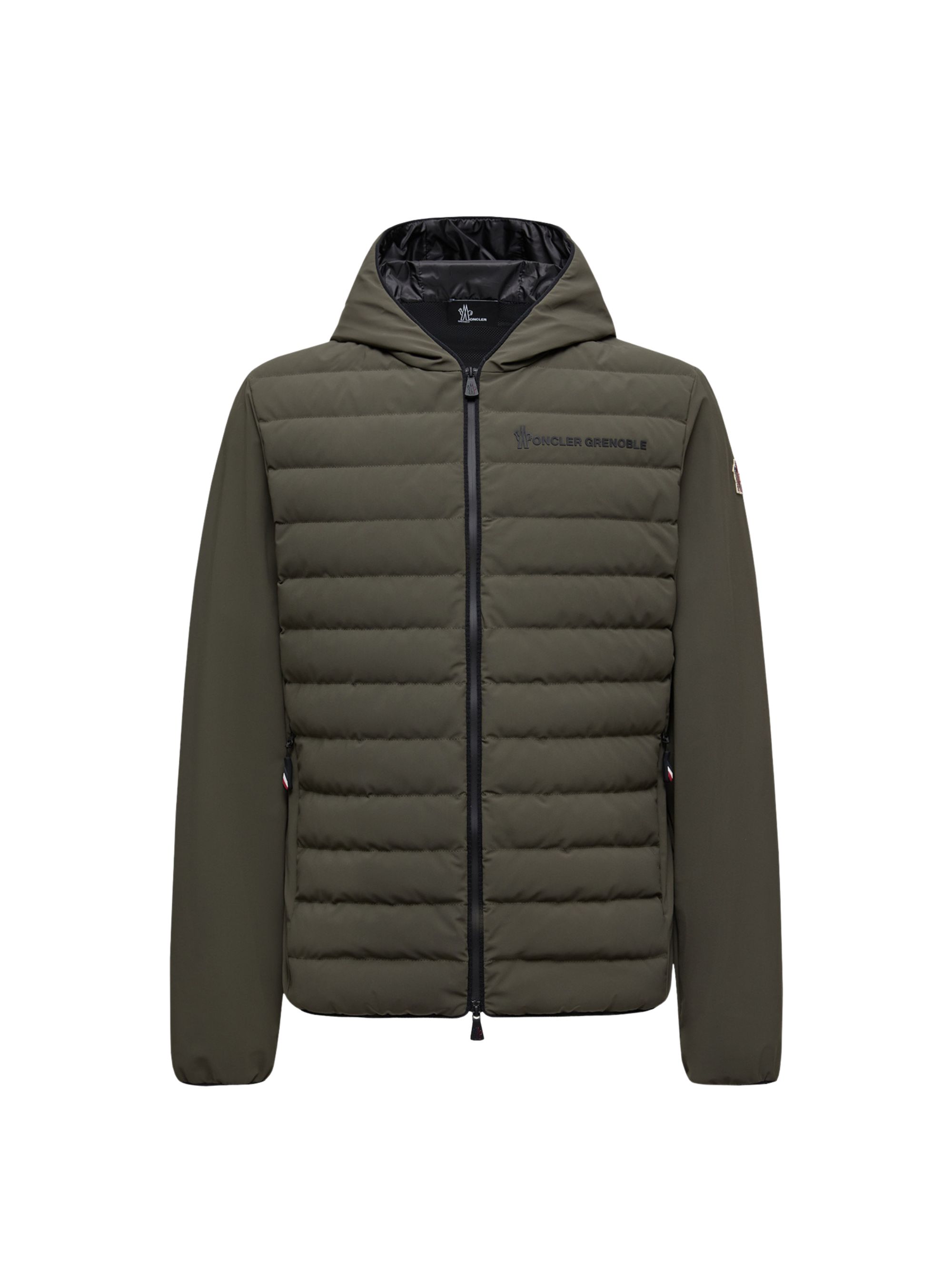 Cardigan con zip di MONCLER GRENOBLE verde in nylon, caratterizzayo da cappuccio, imbottitura sul davanti, chiusura con zip, due tasche laterali con zip e firma sul petto.