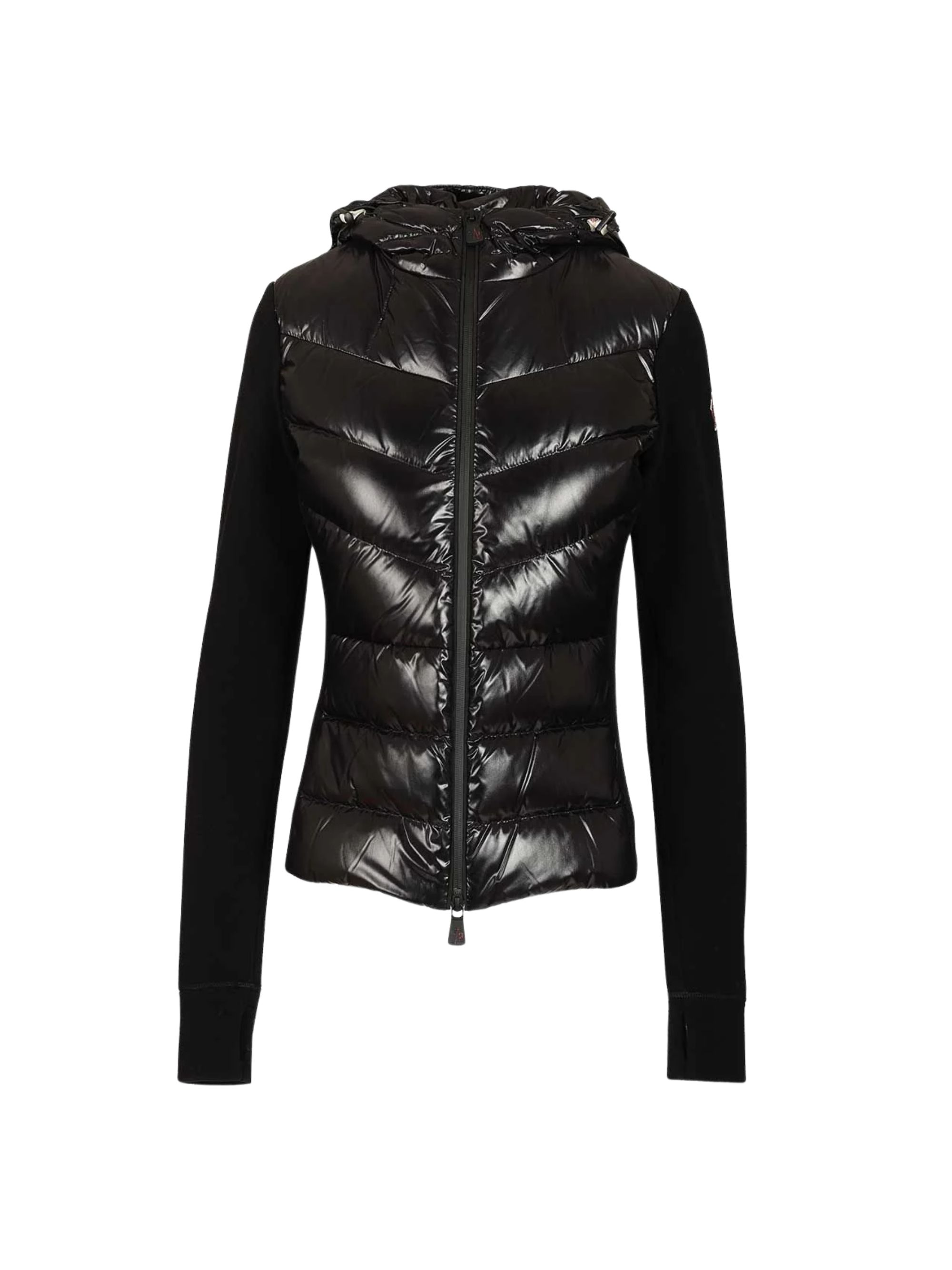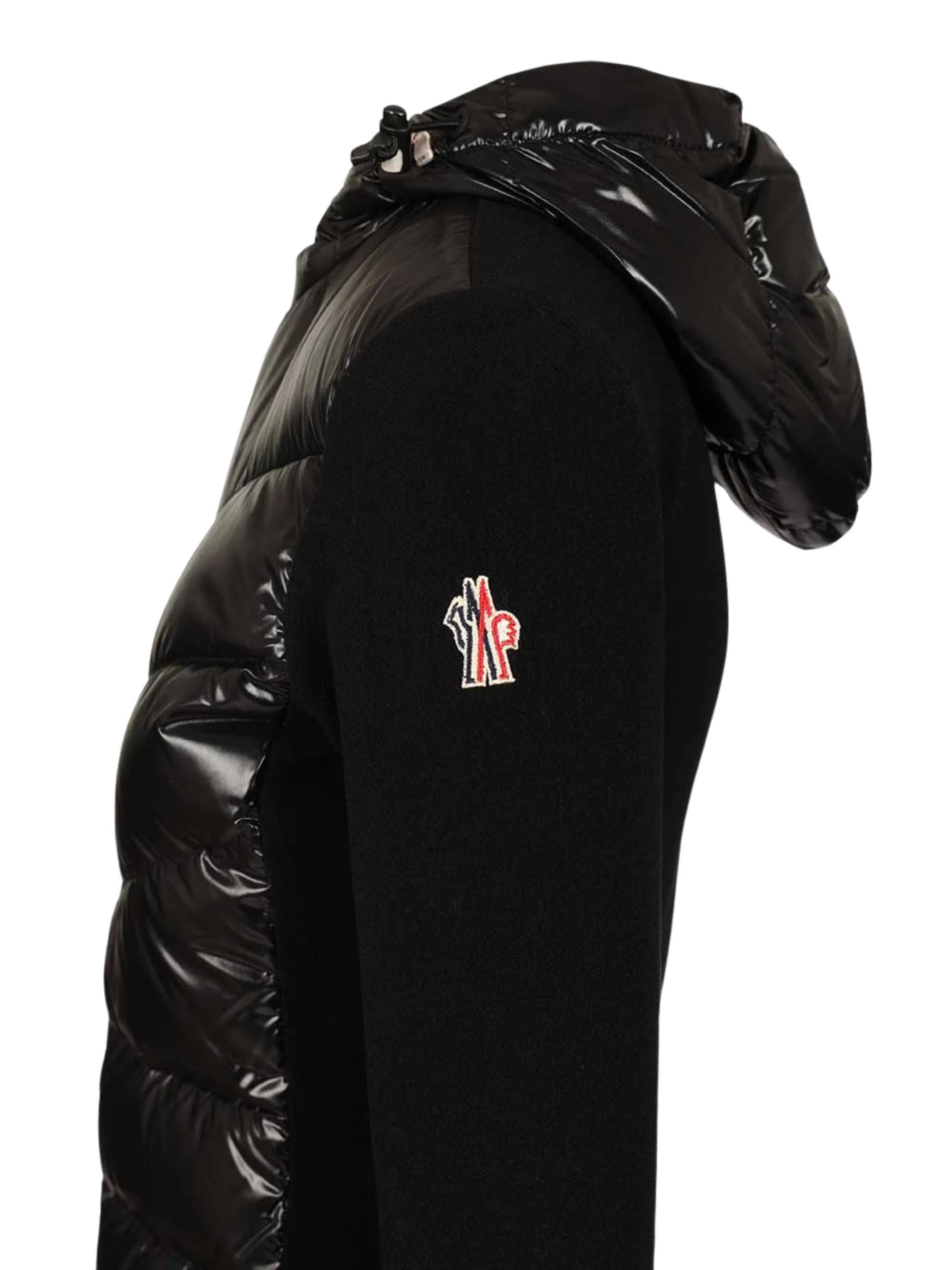 Cardigan imbottito con zip di MONCLER GRENOBLE nero in jersey, caratterizzato da cappuccio in nylon laqué con coulisse, patch logo sulla manica, chiusura con zip a doppio cursore e polsini elasticizzati con foro per pollici.
