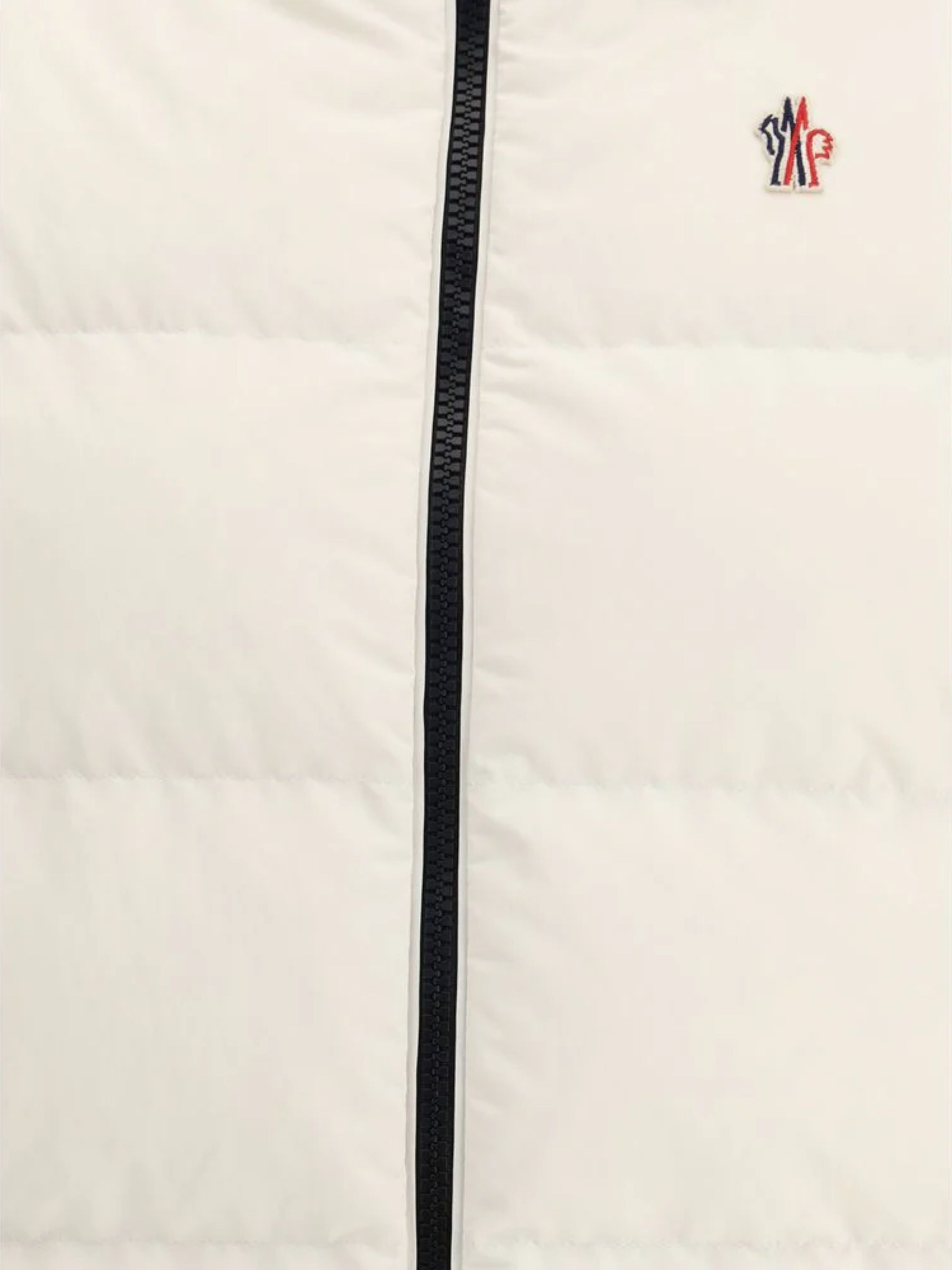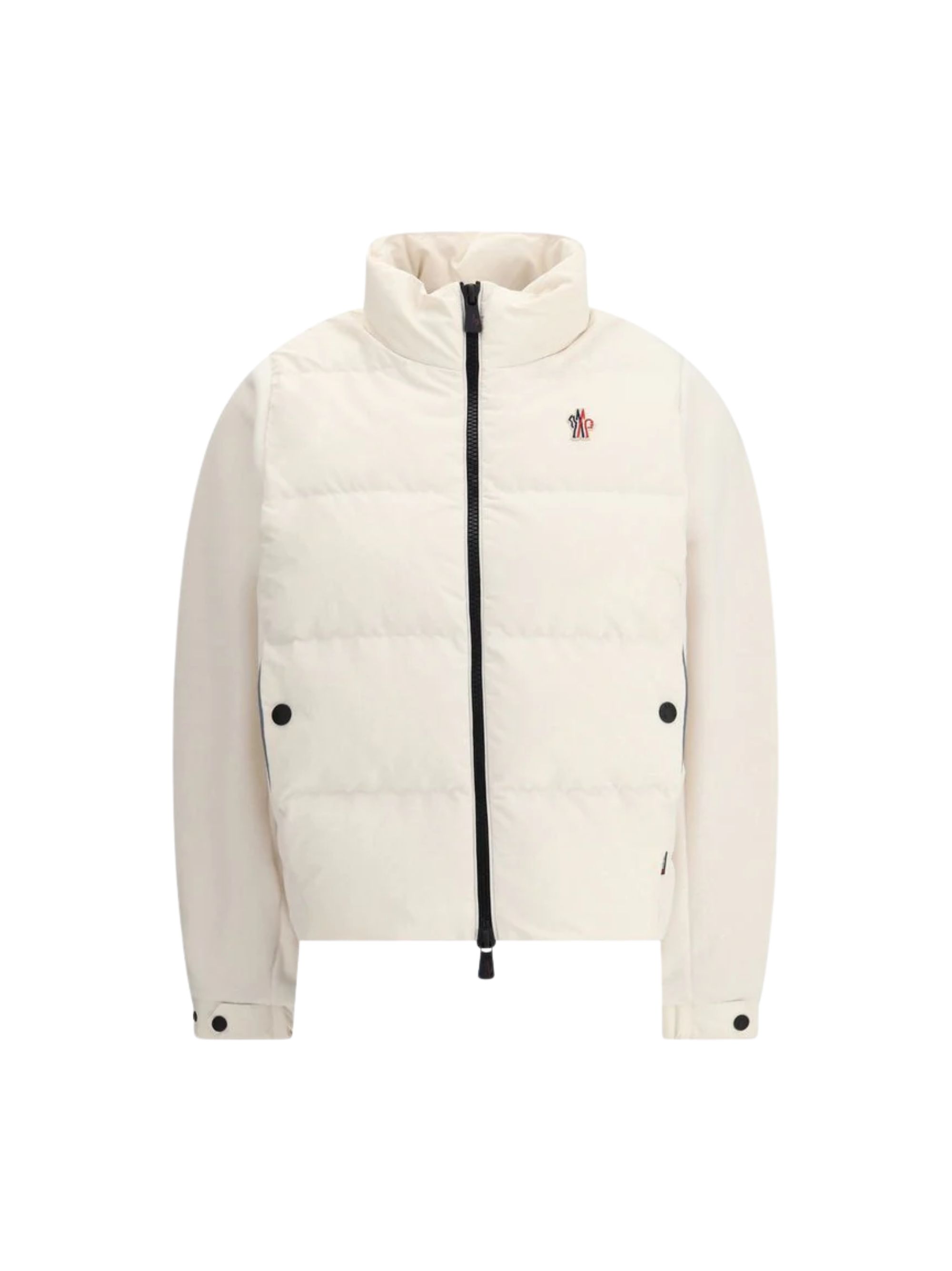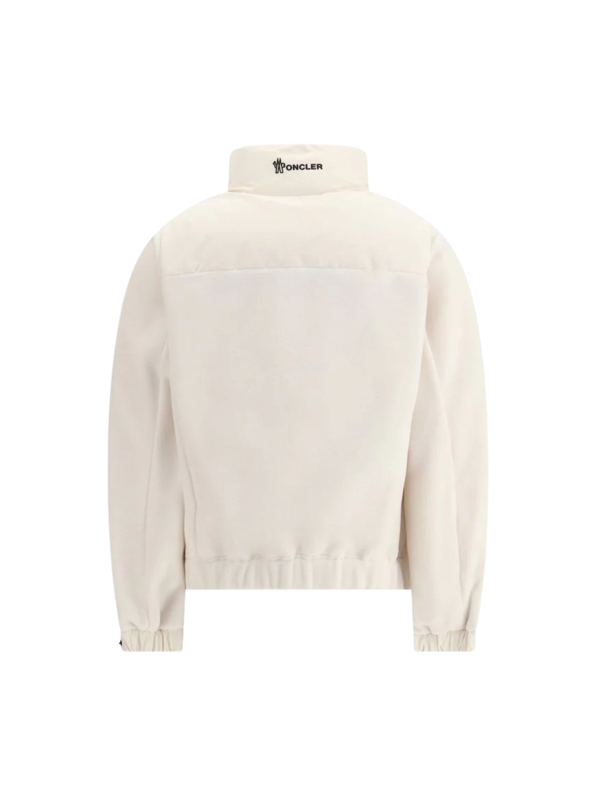 Giacca con maniche a constrasto di MONCLER GRENOBLE bianca in nylon, caratterizzata da collo rialzato, chiusura a zip a contrasto, tasche laterali con zip, bottoni sui polsini e logo sul petto.