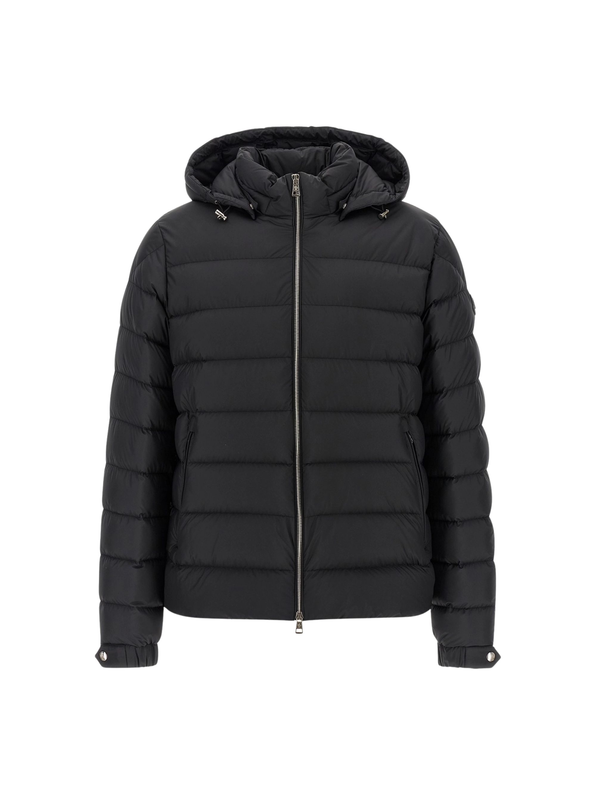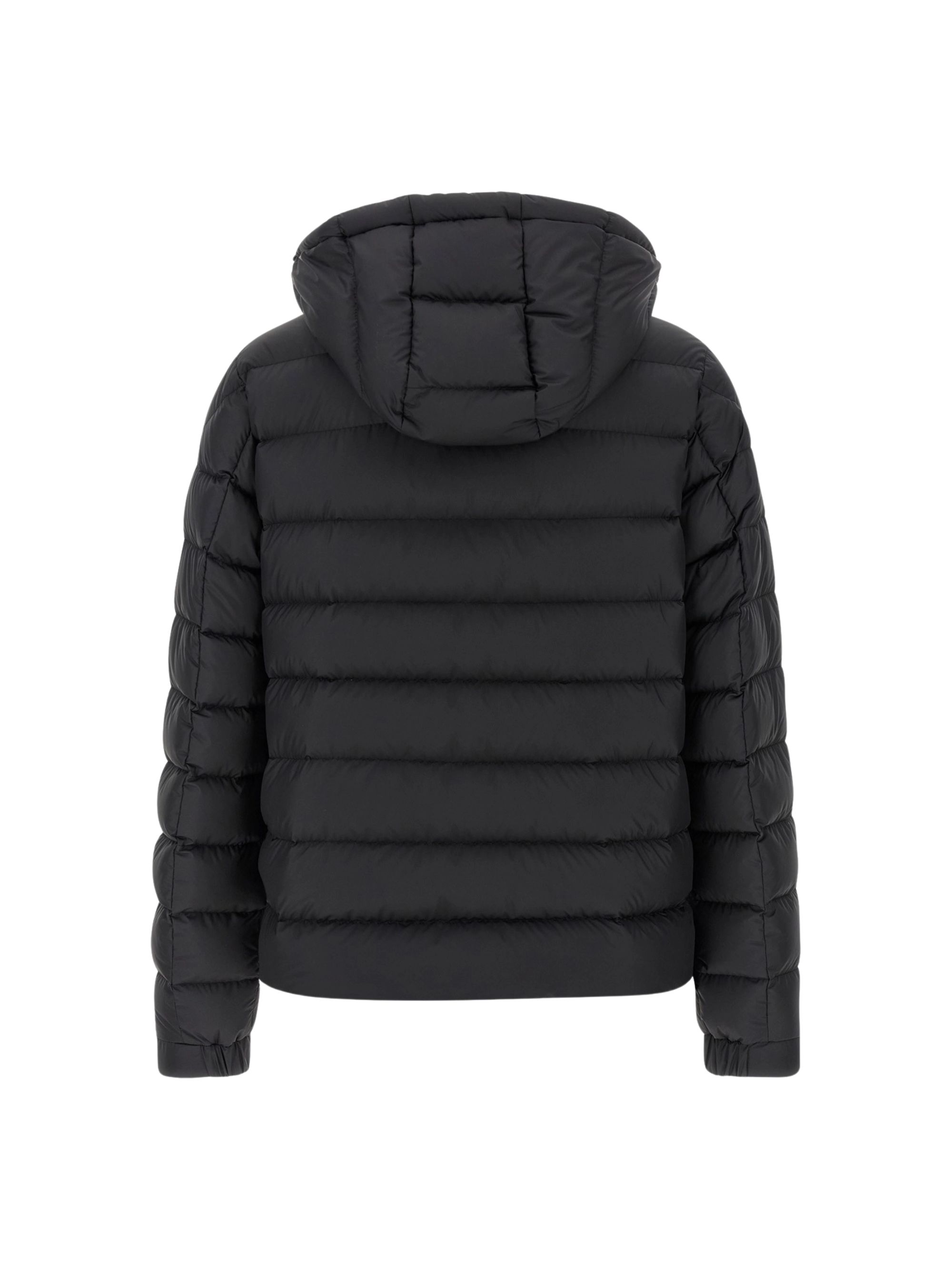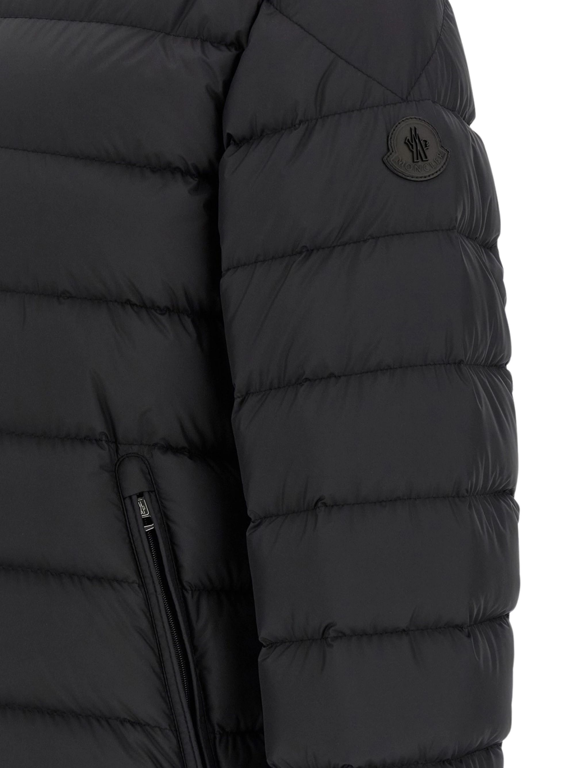 Piumino Arneb di MONCLER nero in Airsoft idrorepellente trapuntato imbottito in piuma d'oca, caratterizzato da cappuccio regolabile e removibile, collo in piedi, chiusura a zip, polsino elastico, patch con logo e coulisse su fondo capo.