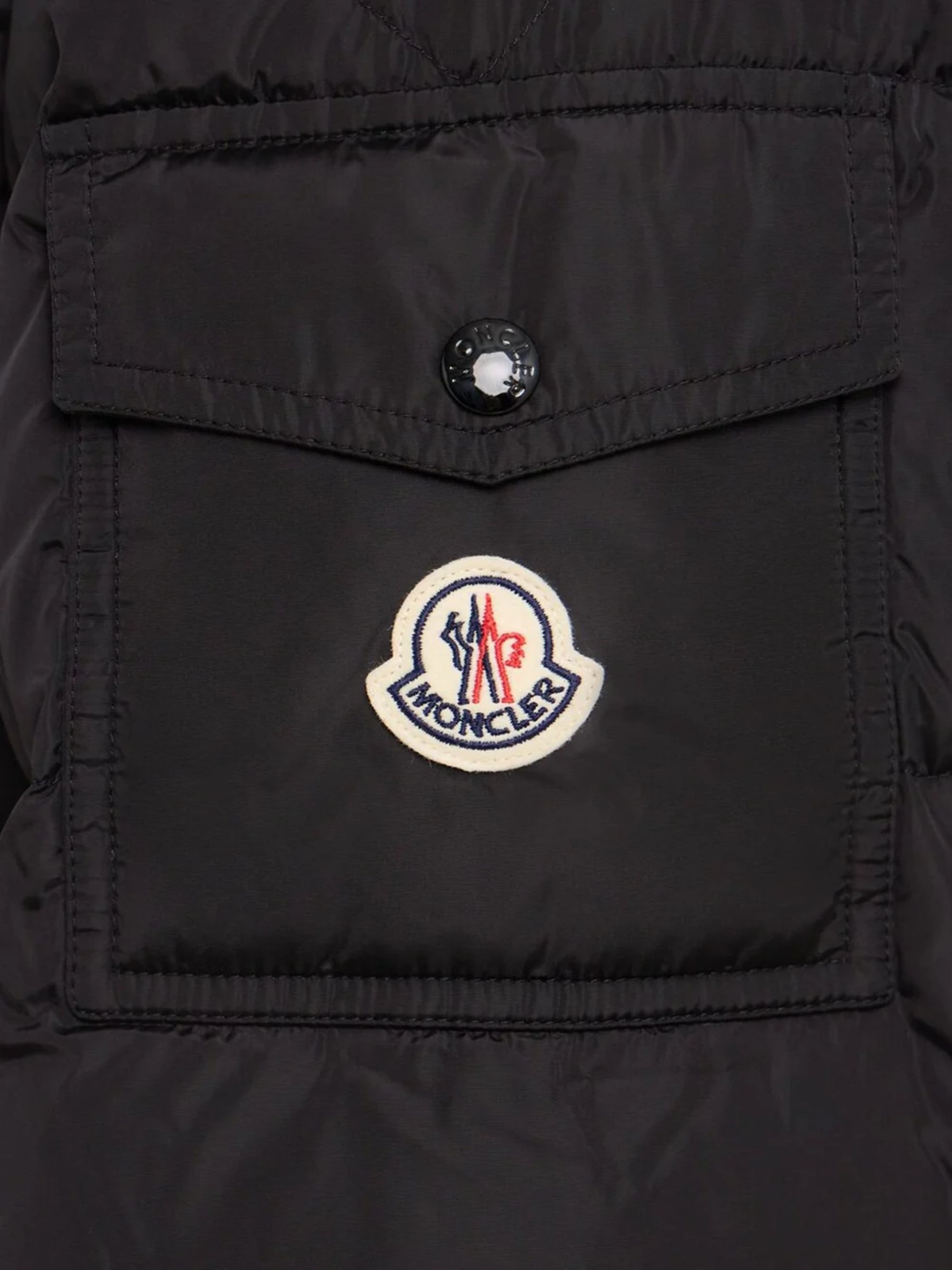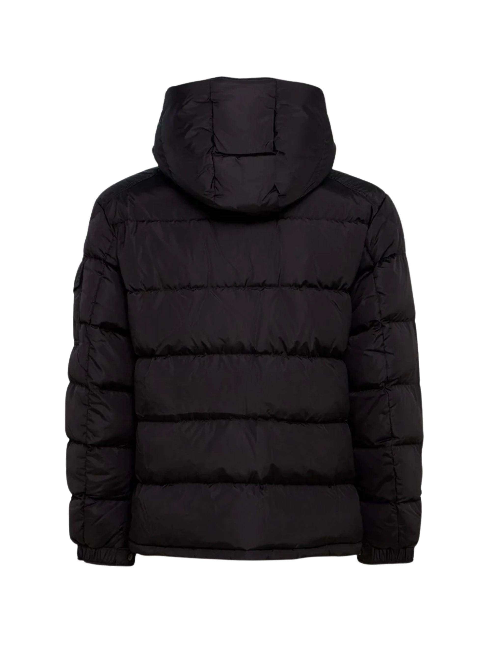 Piumino Maya di MONCLER nera in nylon, caratterizzata da cappuccio amovibile, tasche anteriori con zip, tasca con pattina e patch logo sulla manica sinistra e chiusura con zip e doppio cursore.