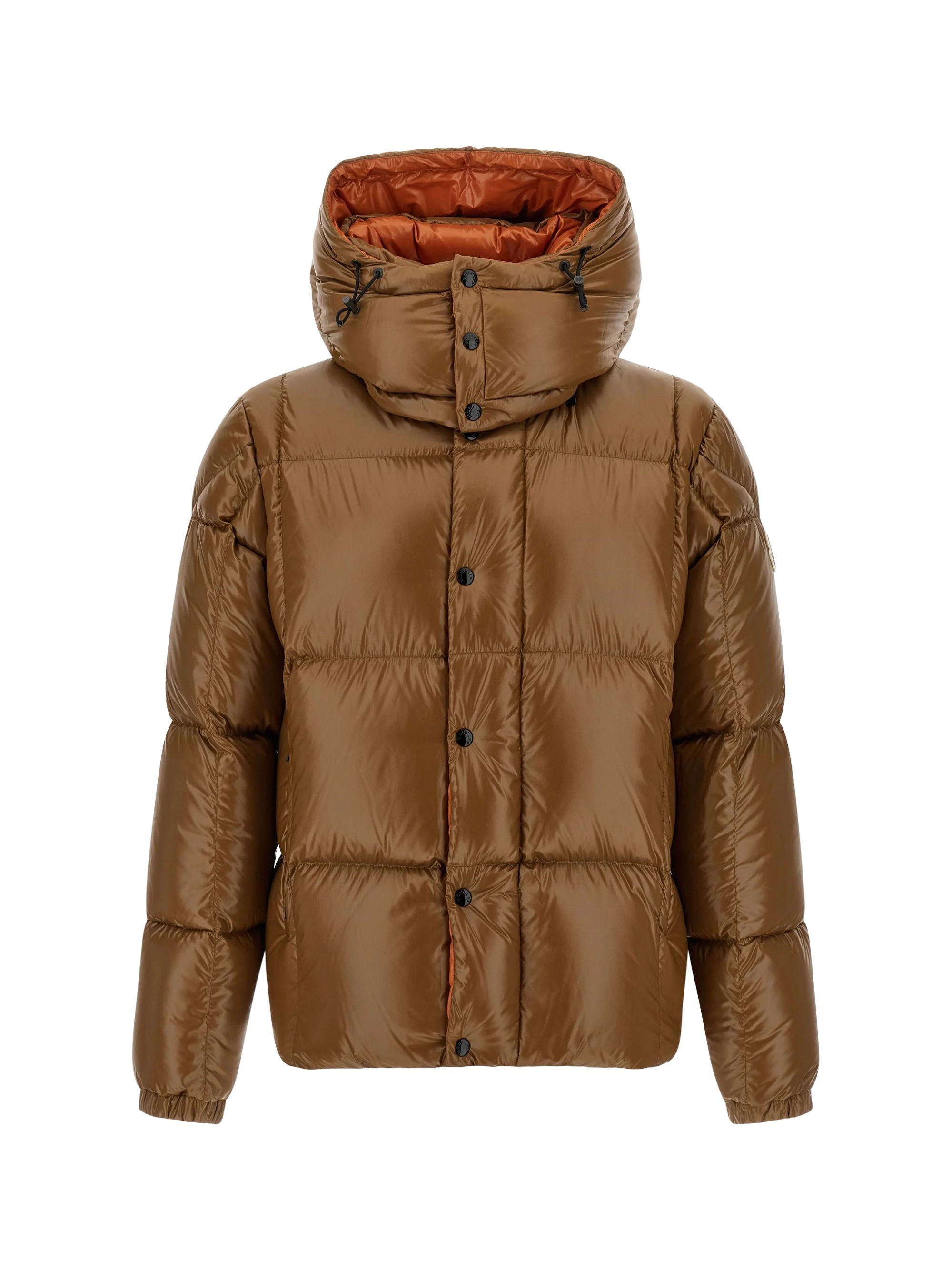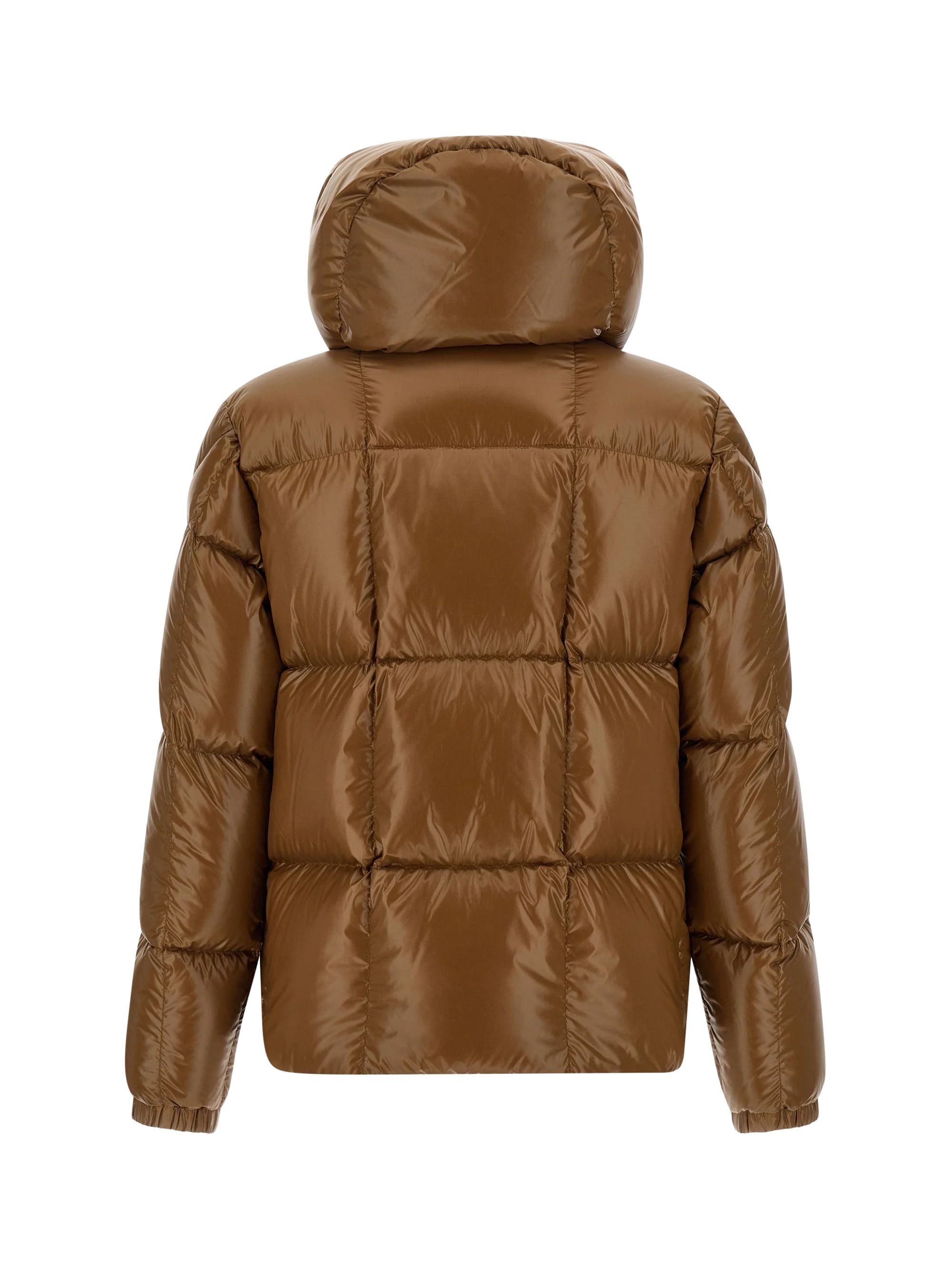 Piumino Parana di MONCLER marrone in nylon laqué imbottito in piuma d'oca, caratterizzato da cappuccio regolabile e removibile, collo in piedi, chiusura con zip e bottoni, polsino elastico, patch con logo e coulisse su fondo capo.