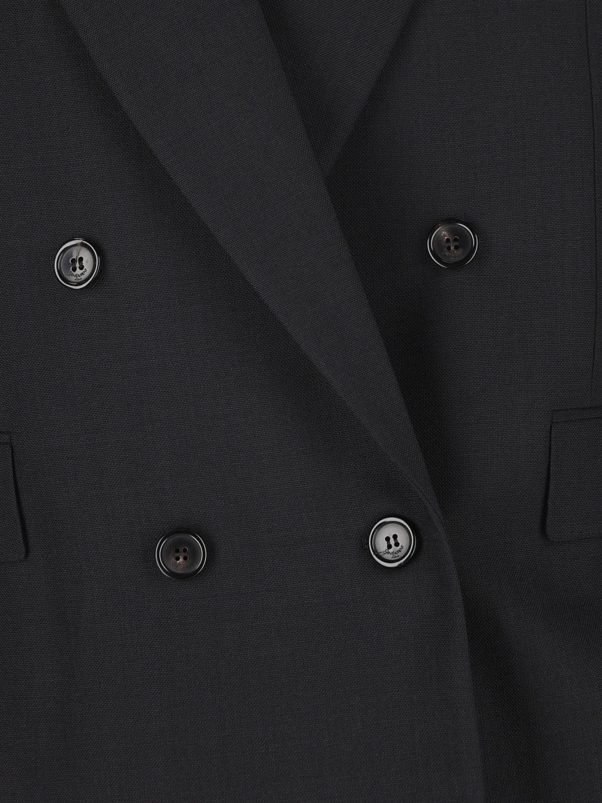 Giacca doppiopetto in lana di SAINT LAURENT nera, caratterizzata da chiusura a sei bottoni, revers a lancia, vestibilità allungata oversize, spalle imbottite, doppio spacco sul retro, due tasche con patta e taschino sul petto.
