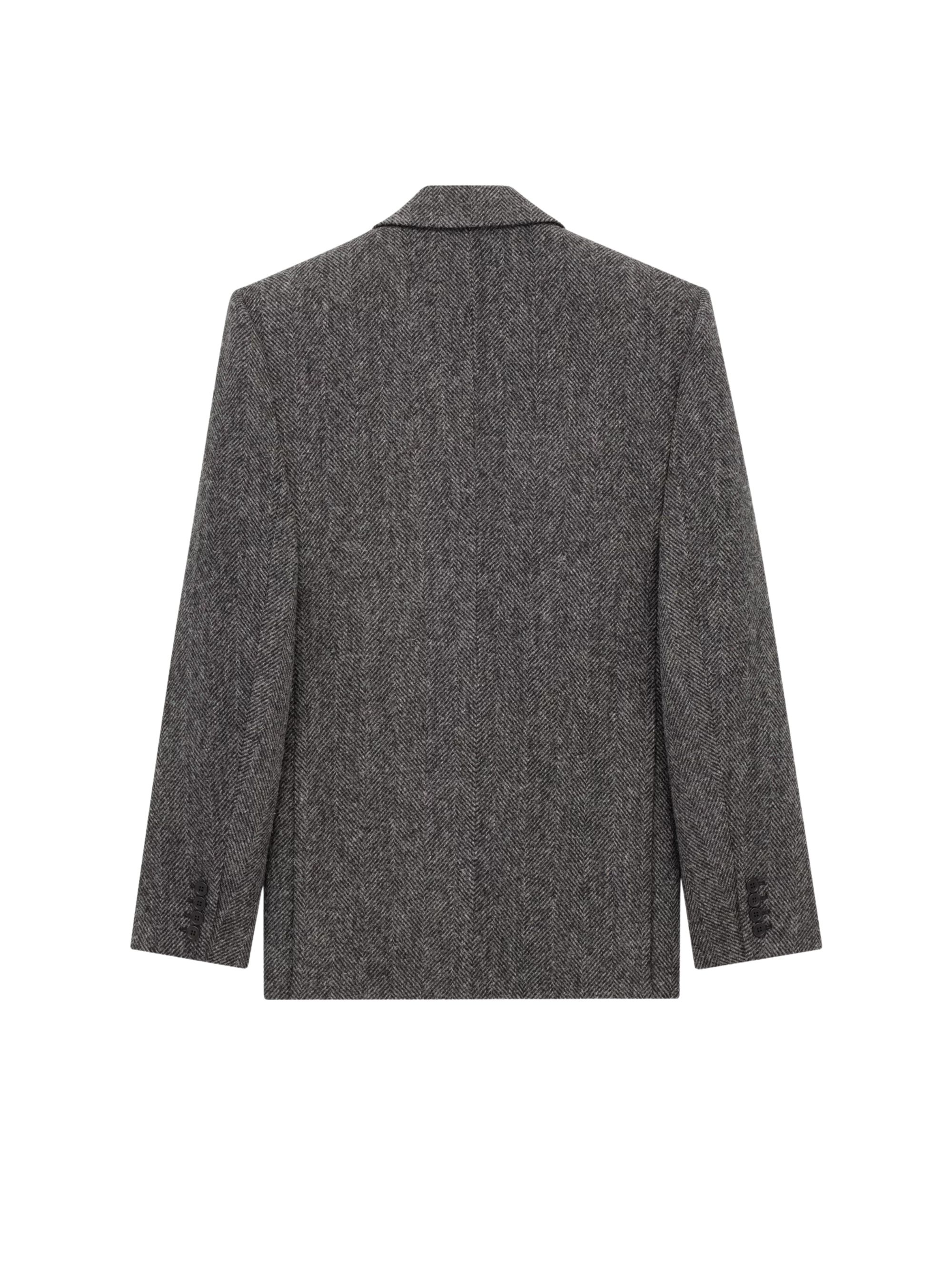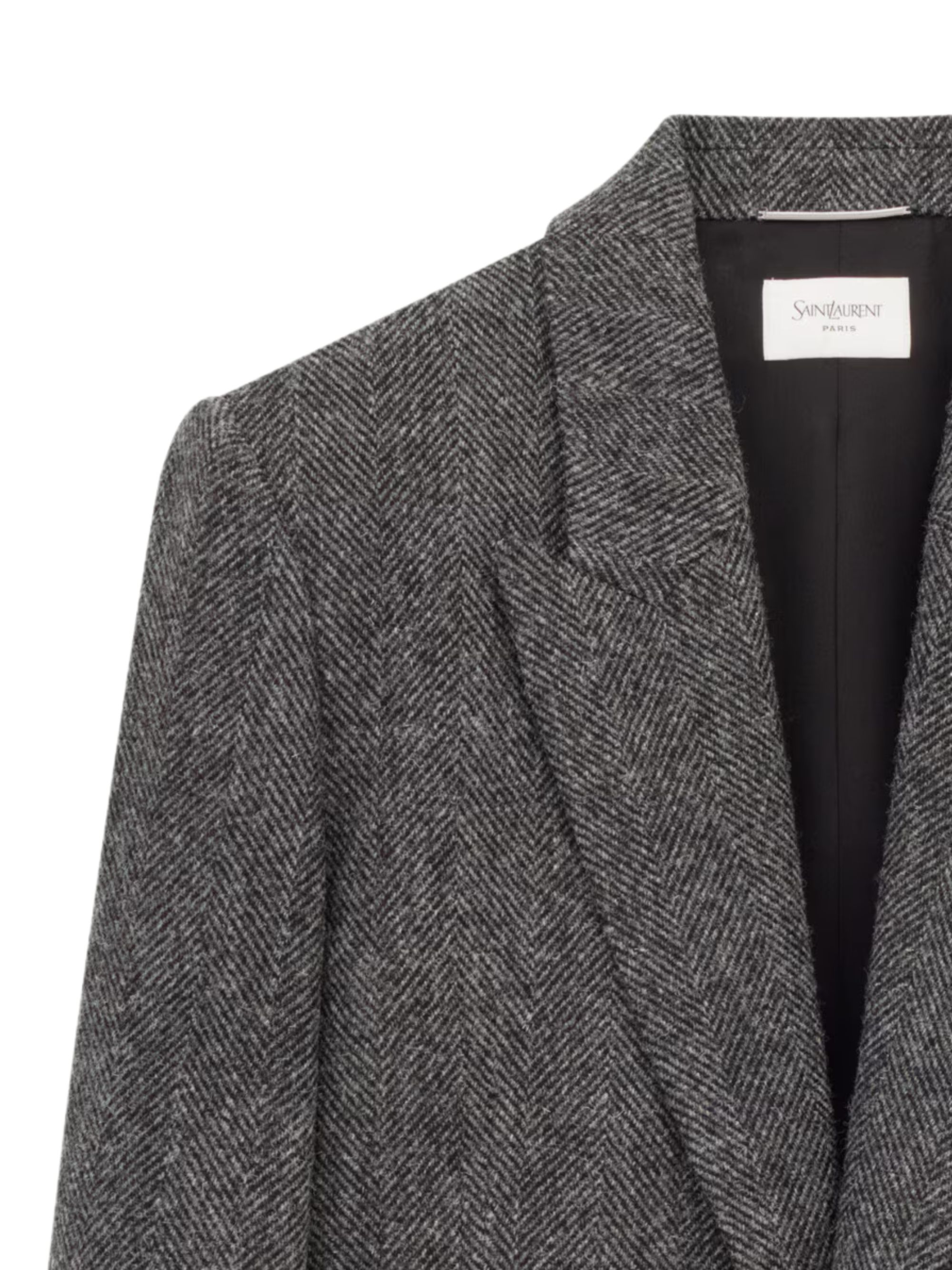 Giacca in lana a spina di pesce di SAINT LAURENT grigia, caratterizzata da chiusura a un bottone, revers a lancia, due tasche con patta sul davanti, fodera in seta, un taschino sul petto, spalle imbottite e spacco sul retro.