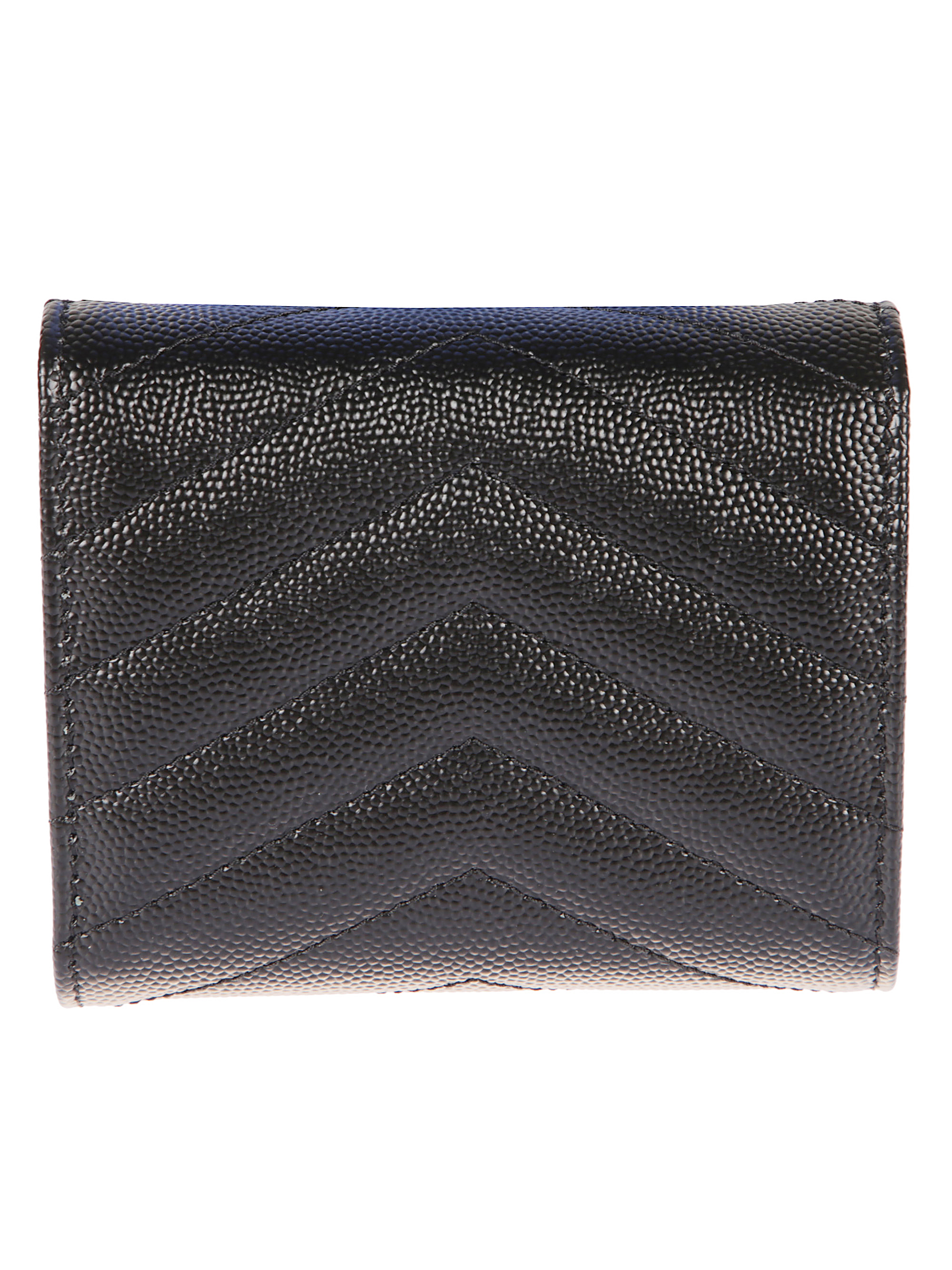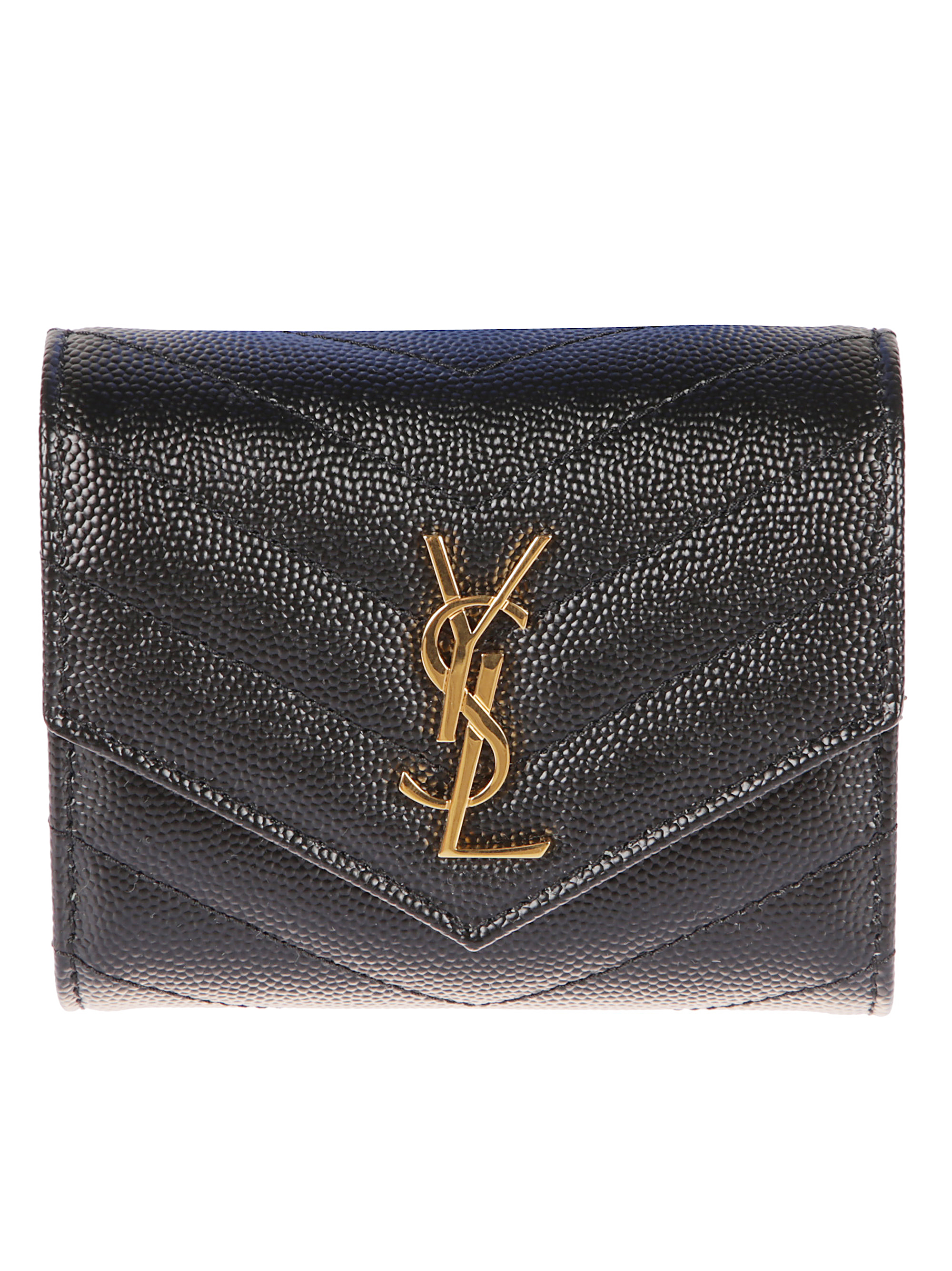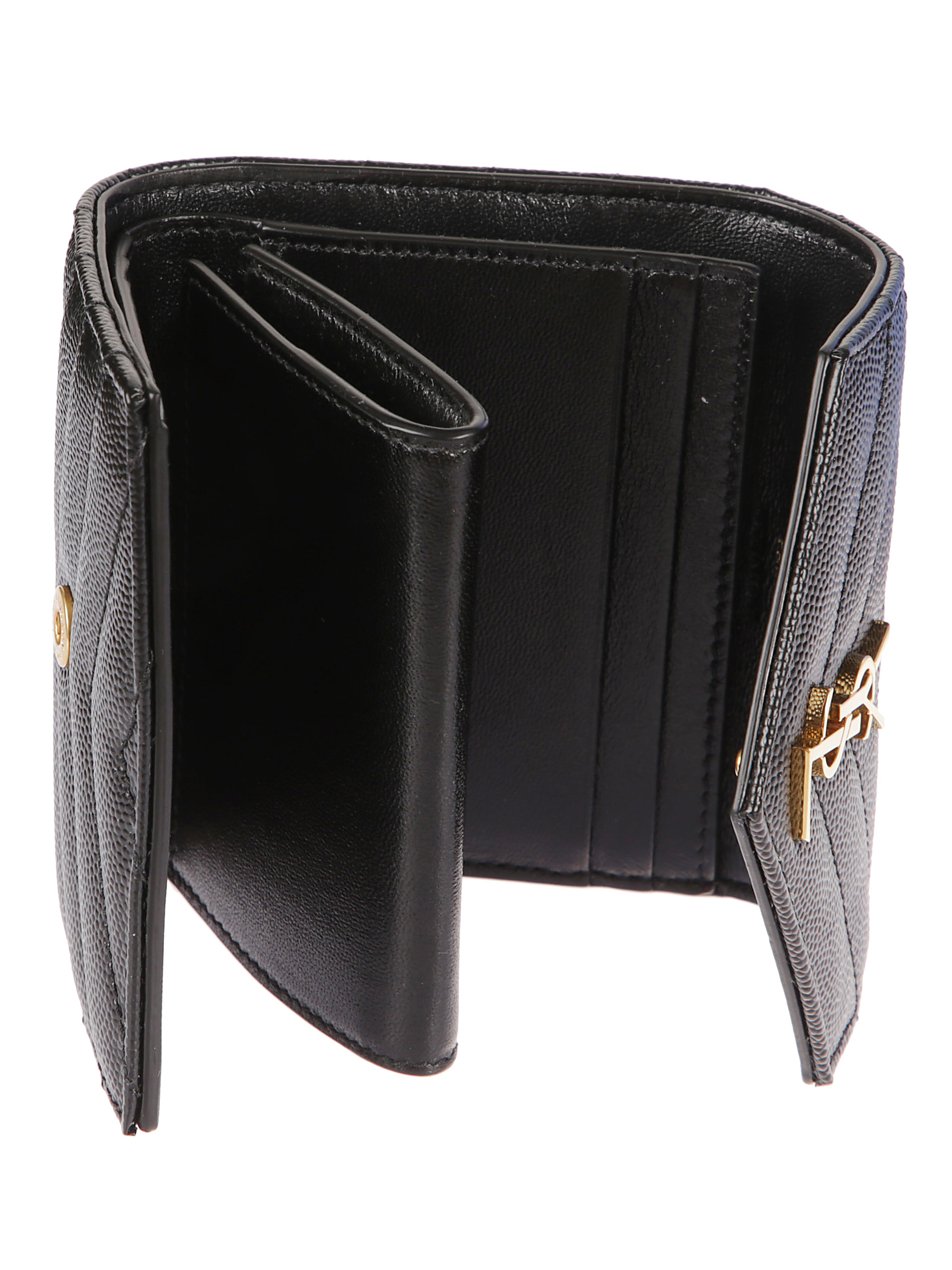 Porta carte Cassandre di SAINT LAURENT nero in pelle goffrata grain de poudre, caratterizzato da chiusura con bottone automatico, cinque fessure per carte, un portamonete e logo YSL color oro. Dimensioni: 10 x 9 x 3 CM.