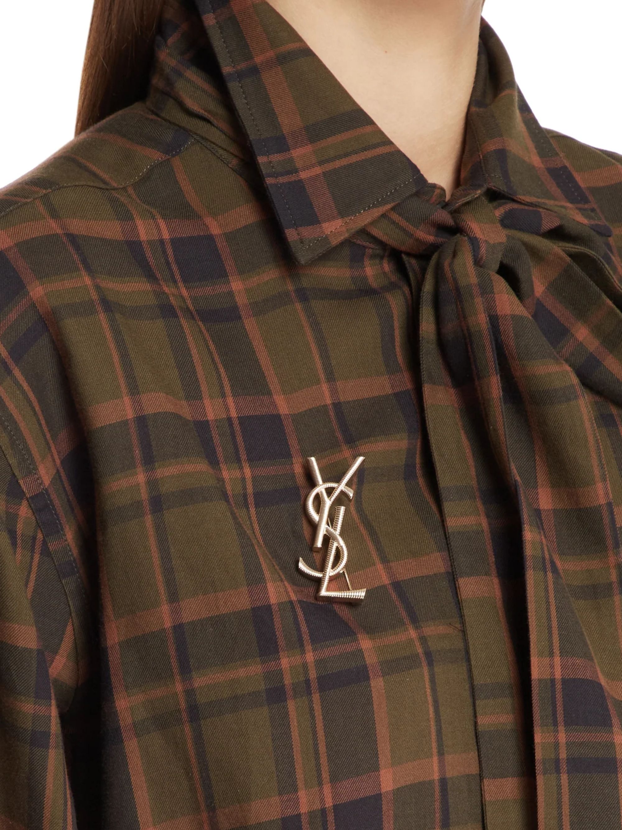 Spilla cassandre di SAINT LAURENT color oro in ottone, caratterizzata da texture di cordino rivestito, chiusura con gancio di sicurezza e incisione logo Saint Laurent Paris.