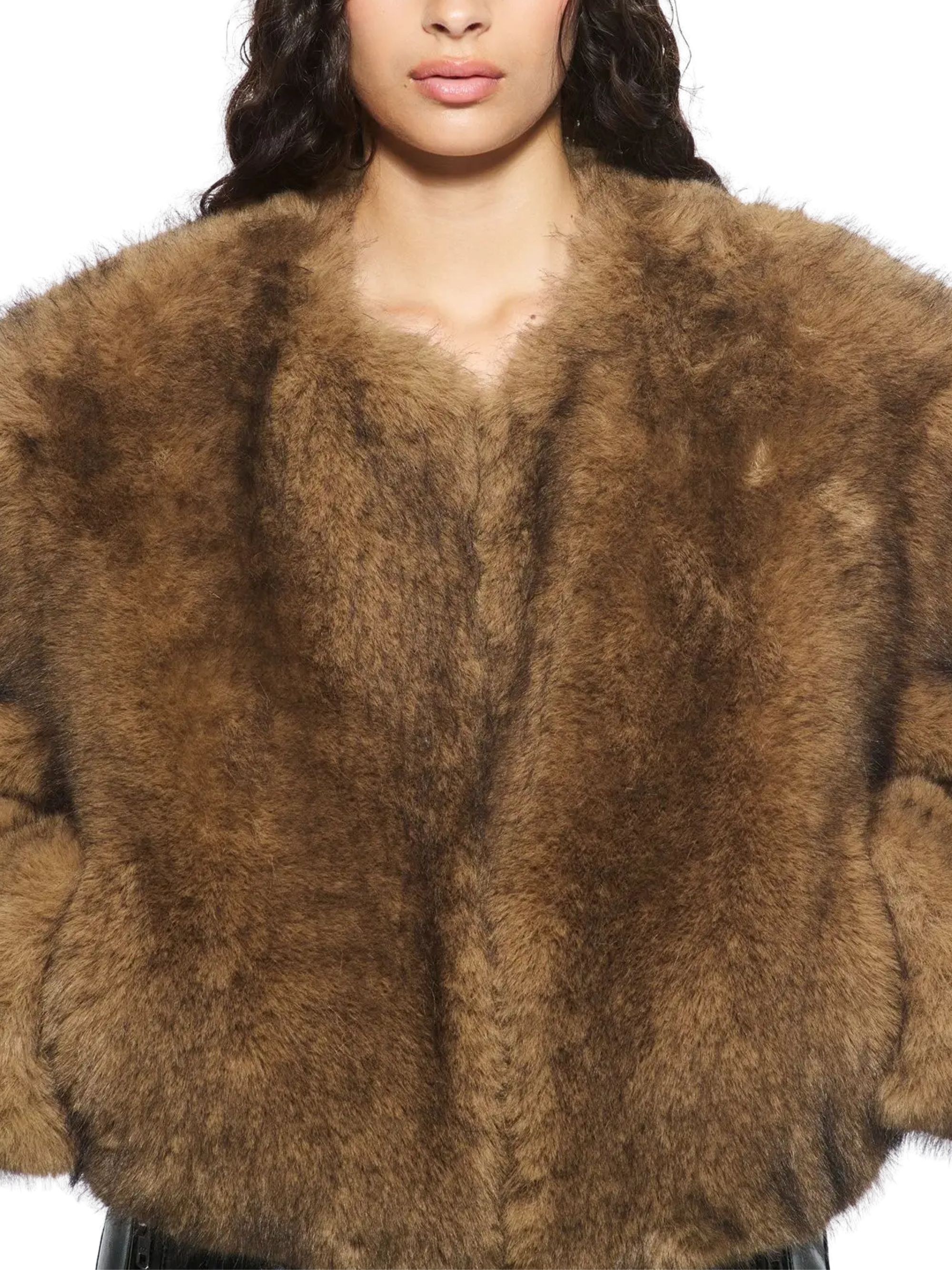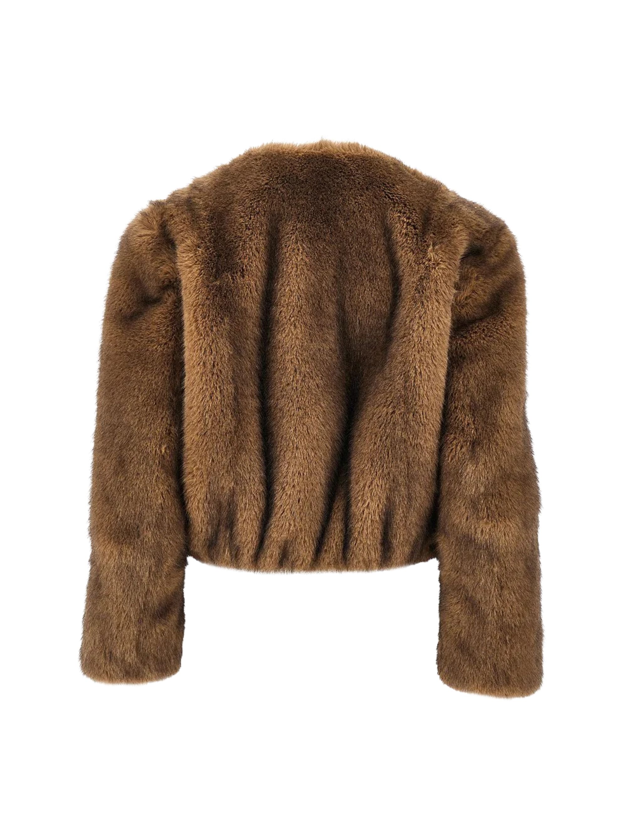 Giacca Karly di STAND STUDIO marrone in pelliccia sintetica, caratterizzata da spalle accentuate, maniche voluminose e chiusura con cerniera.