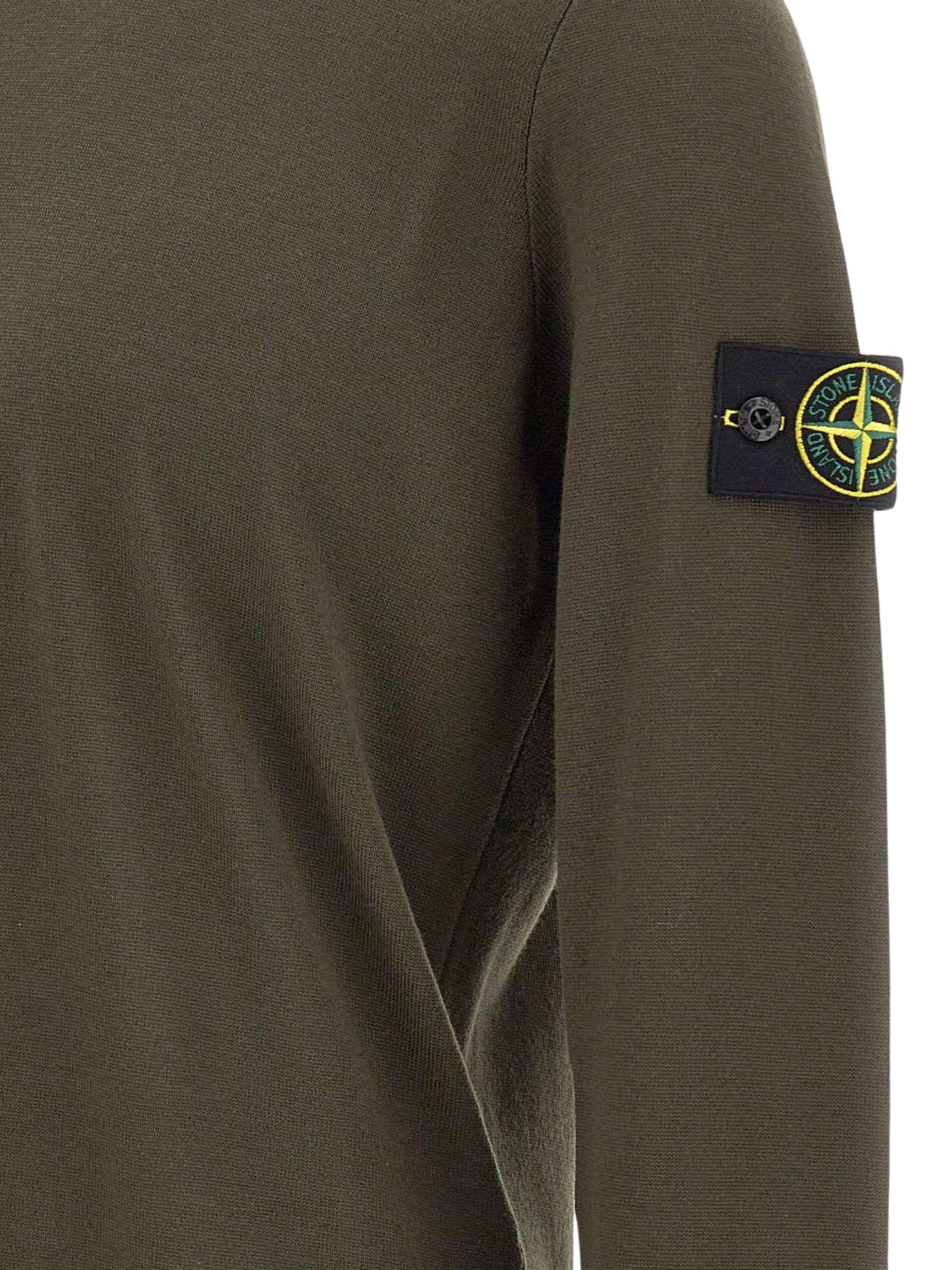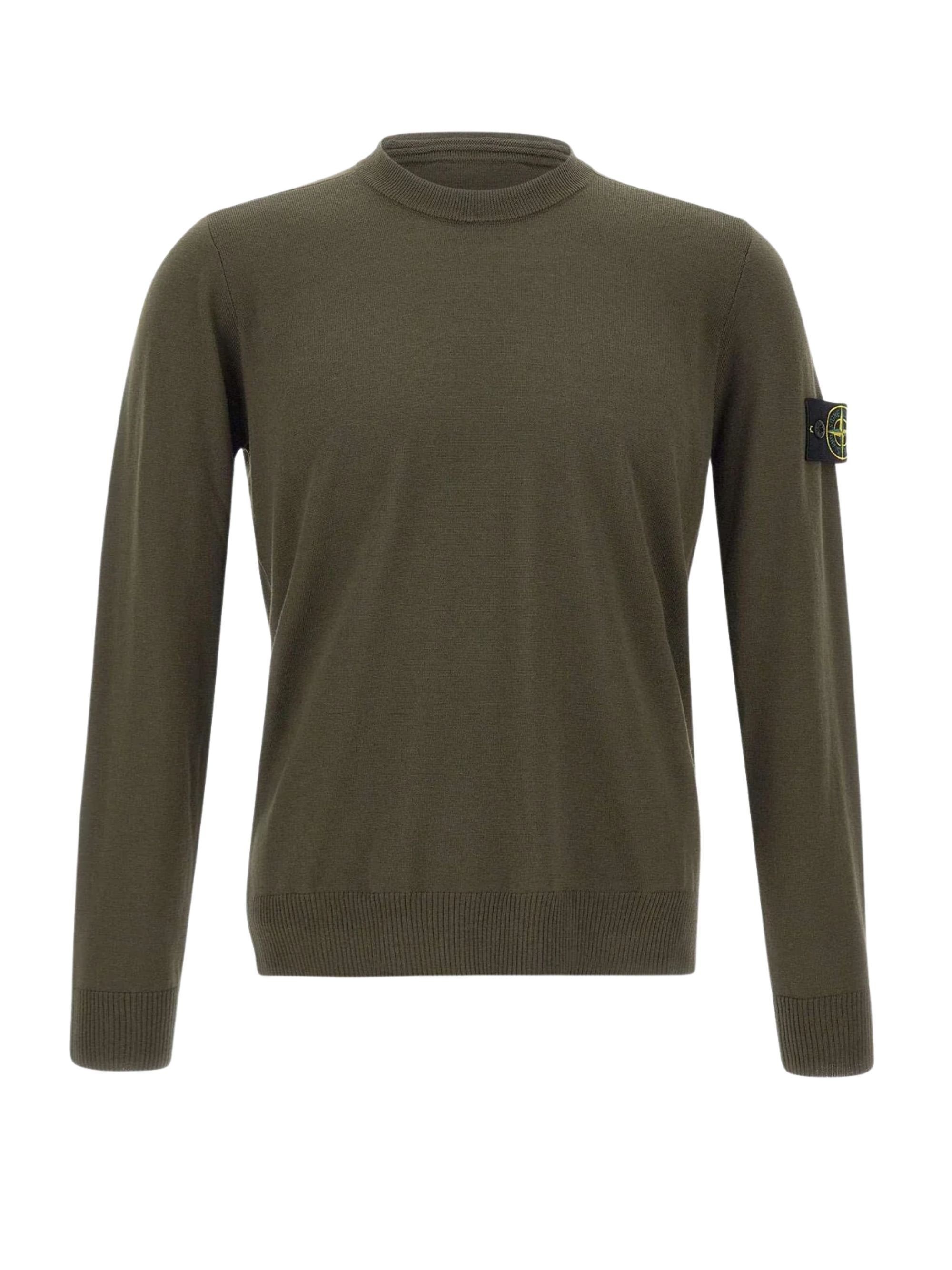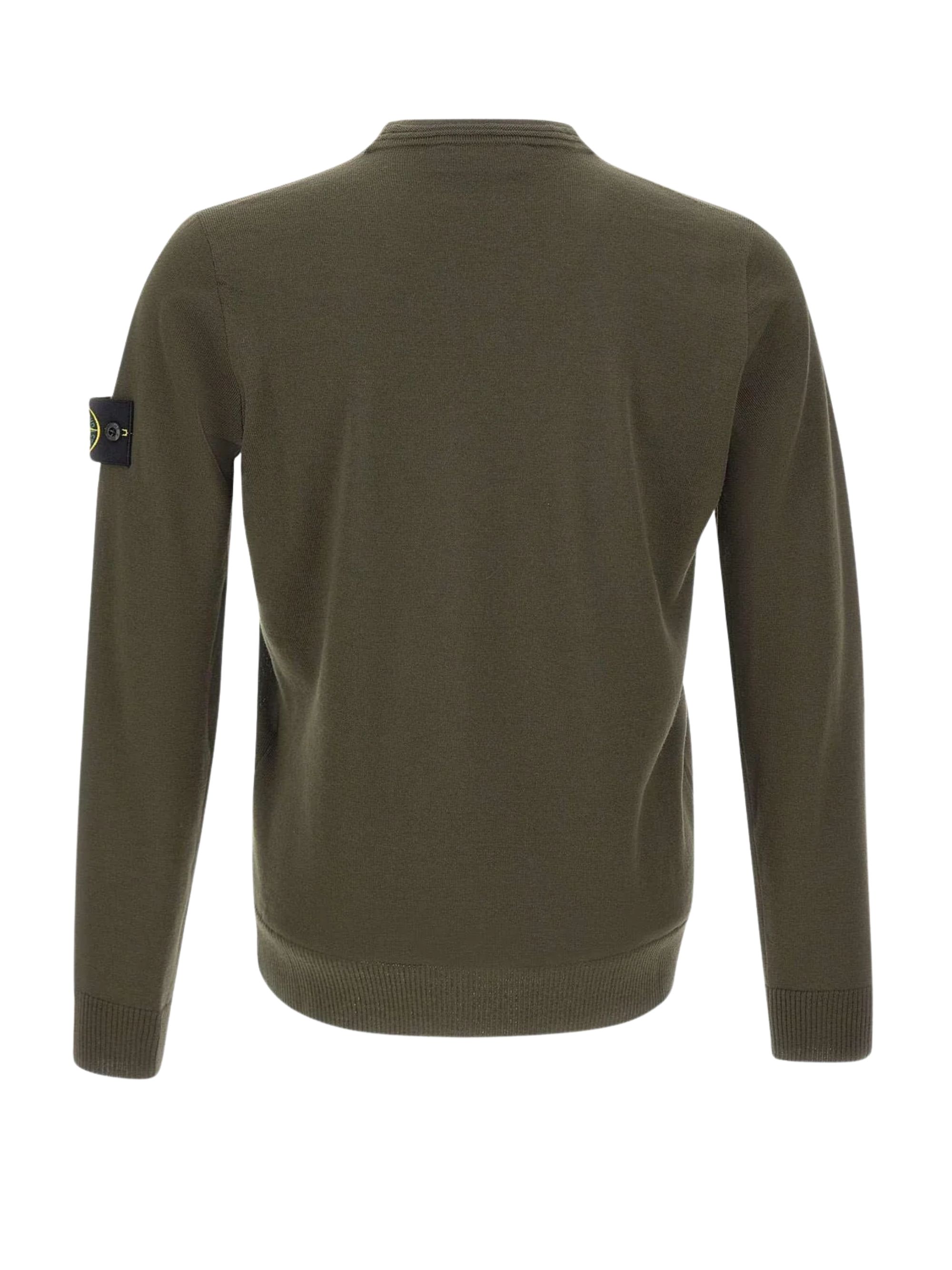 Pullover in lana di STONE ISLAND verde, caratterizzato da girocollo classico, orli a costine, impunture a rilievo e patch logo sulla manica sinistra.