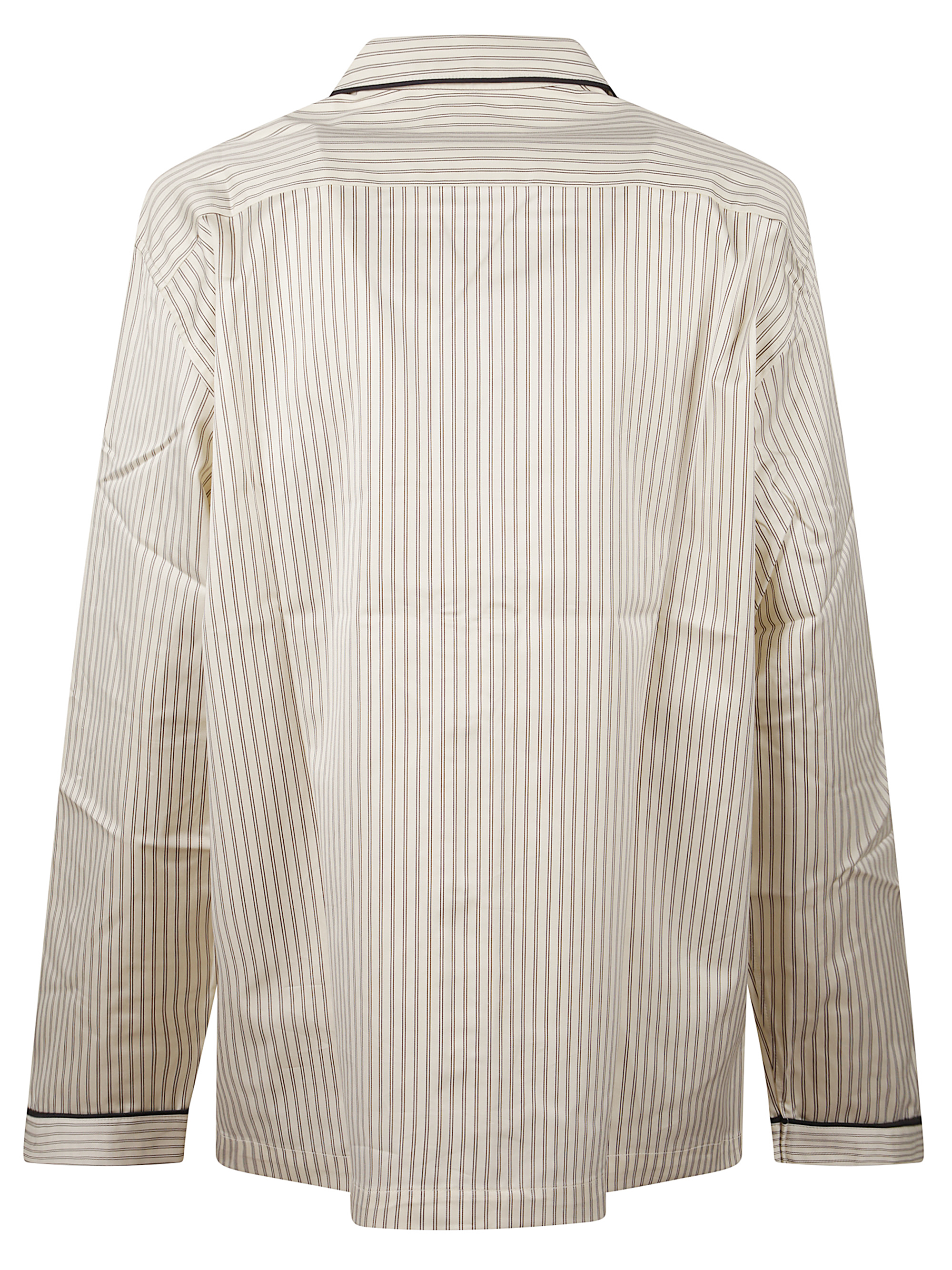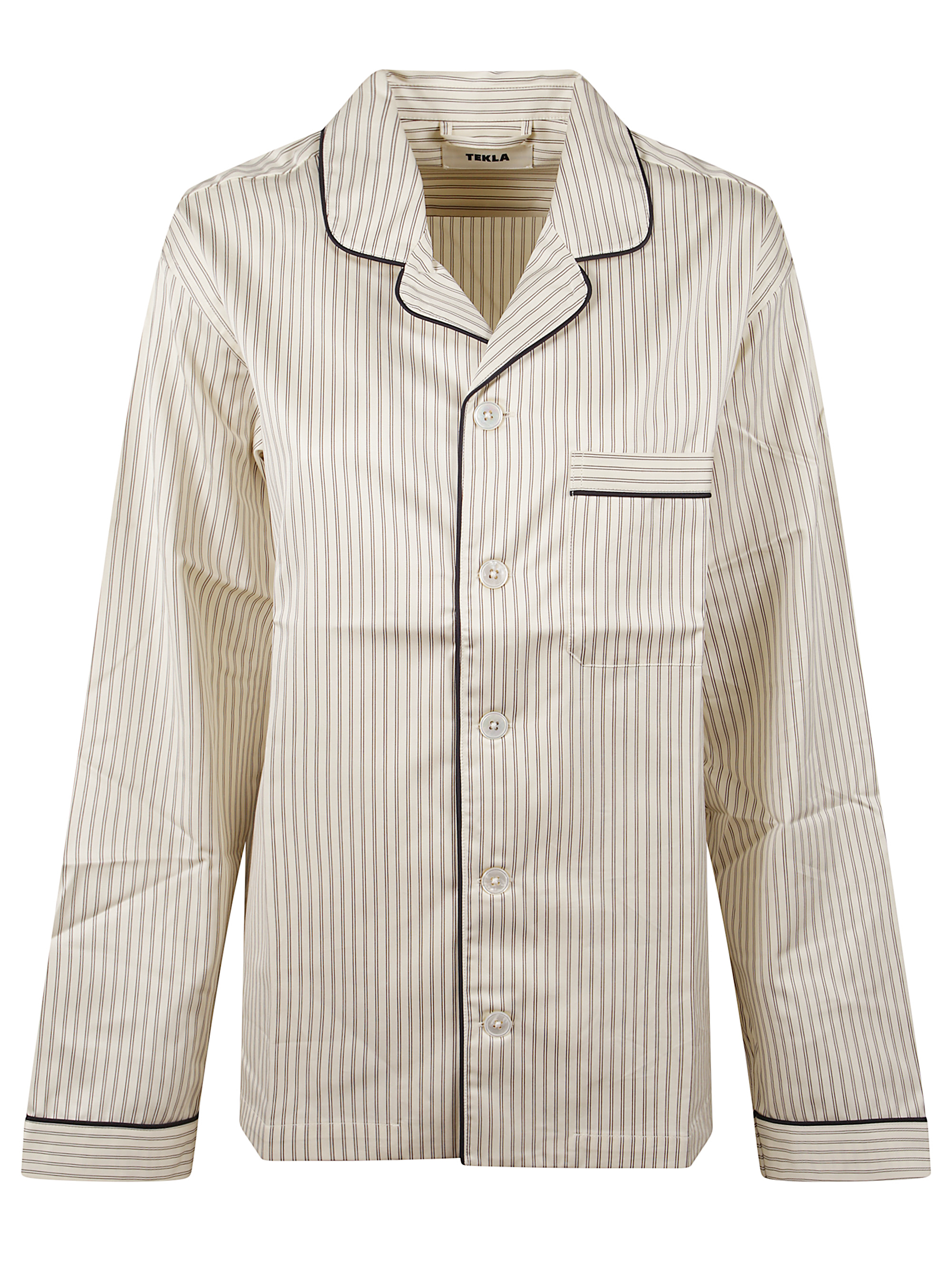 Camicia del pigiama a righe di TEKLA marrone in raso cotone biologico, caratterizzata da maniche lunghe, chiusura con bottoni, taschino sul petto e rifiniture nere.