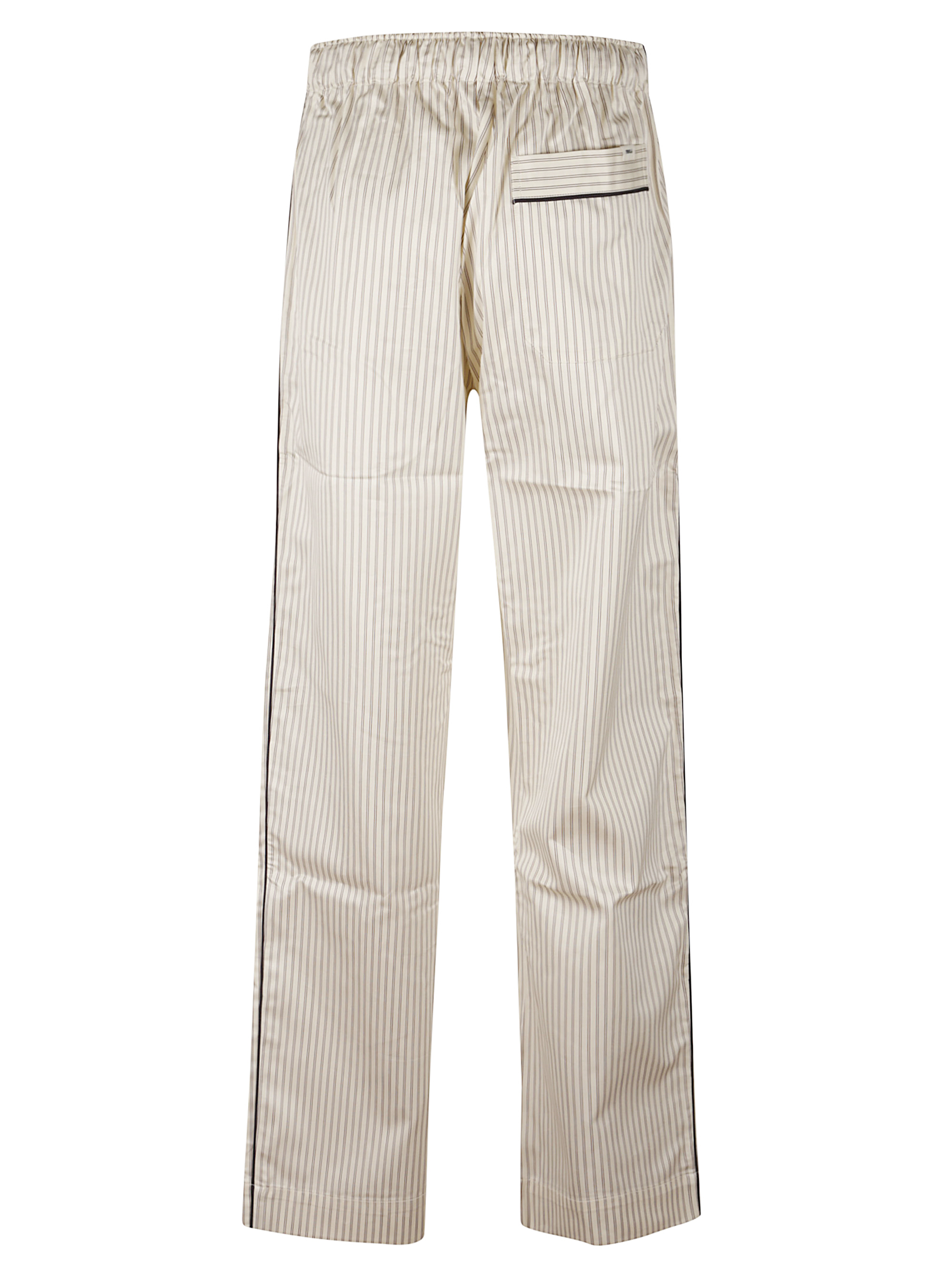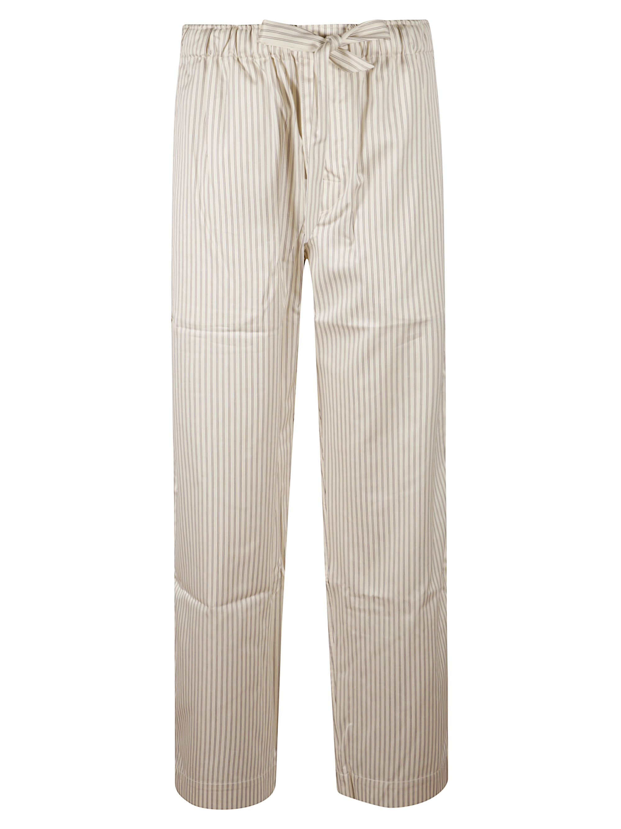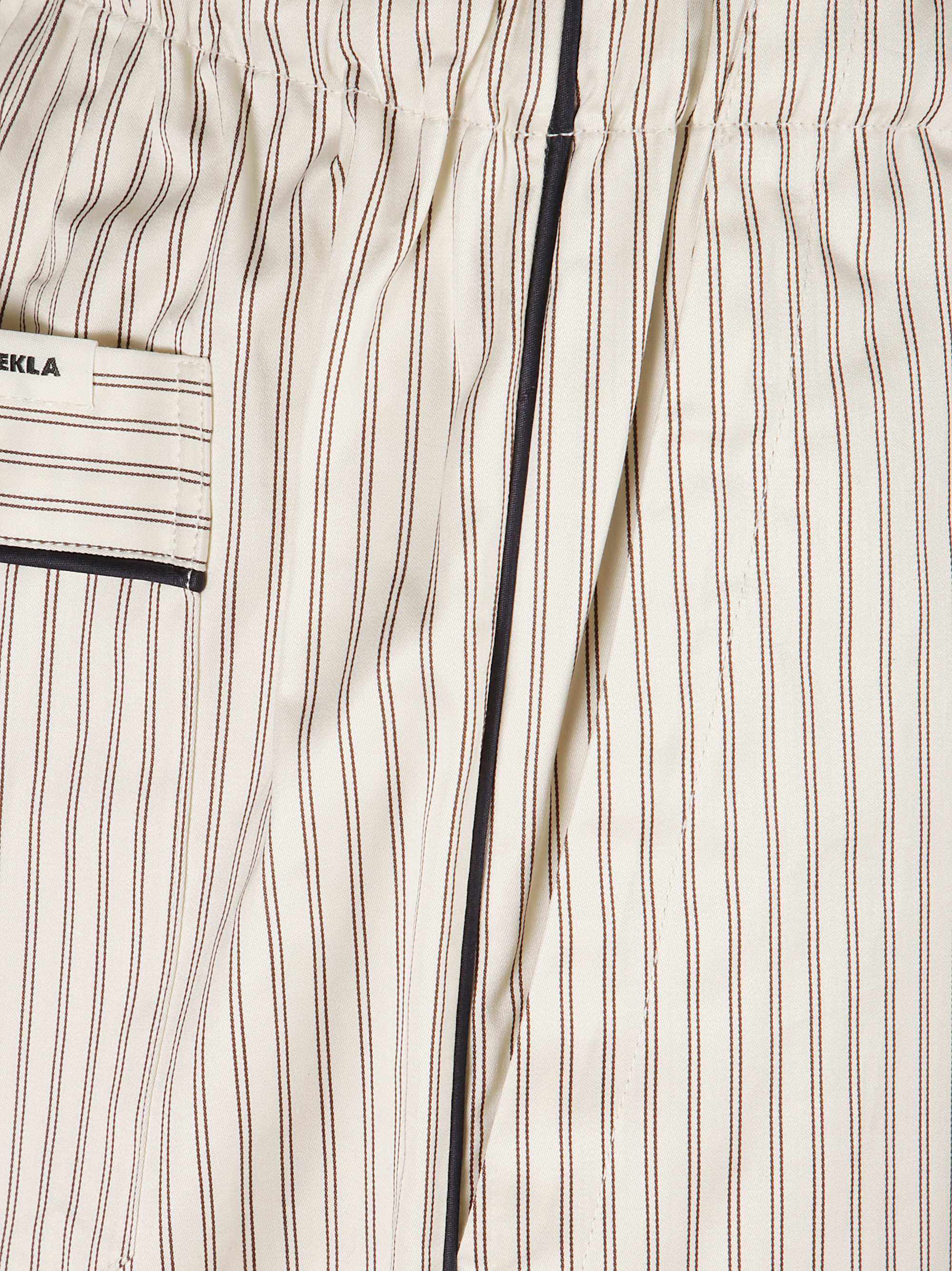 Pantaloni del pigiama a righe di TEKLA marrone in raso cotone biologico, caratterizzati da vita arricciata, fiocco a righe in vita, tasca singola sul retro e rifiniture nere ai lati.