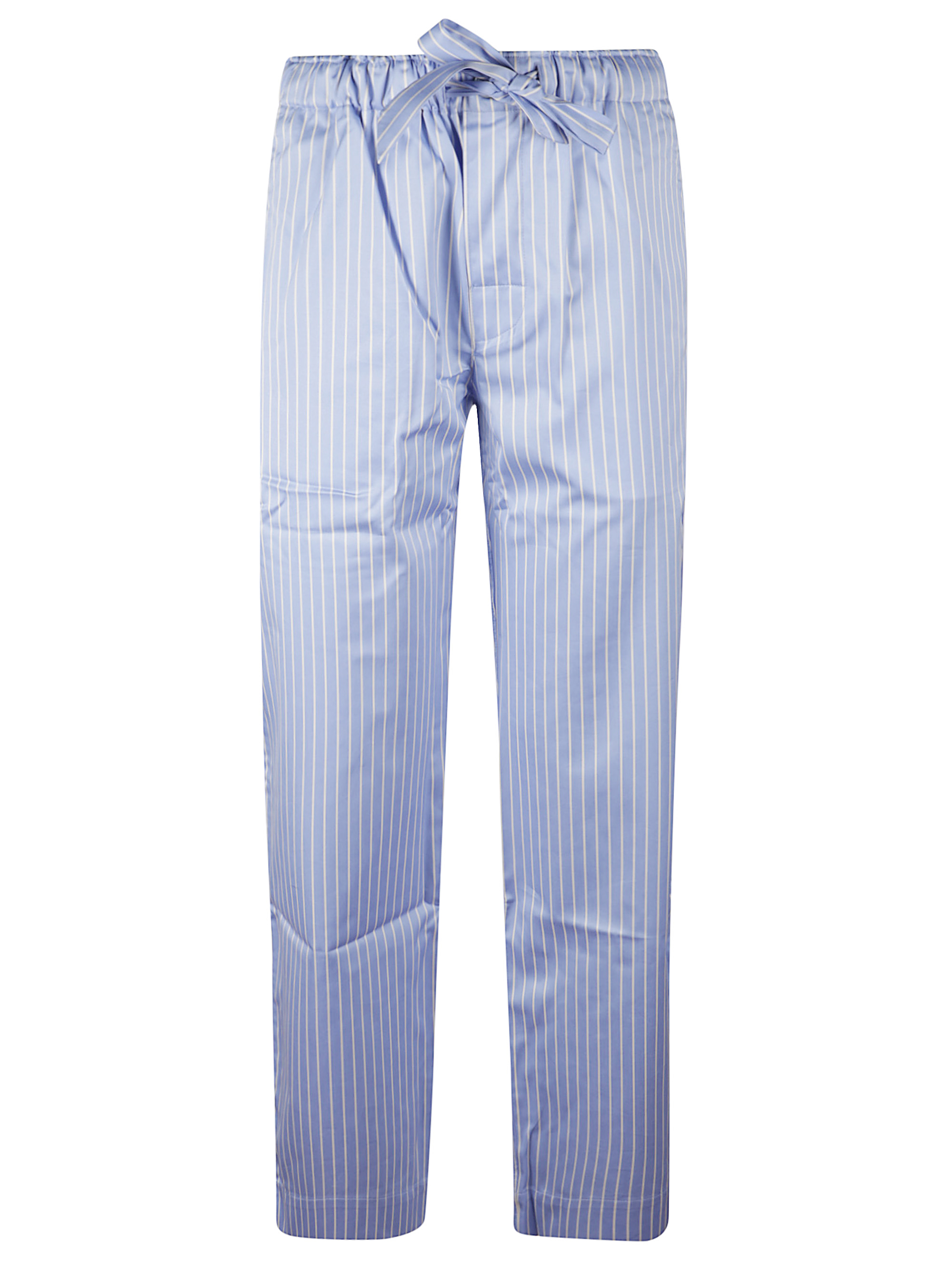 Pantaloni del pigiama a righe di TEKLA blu in raso cotone biologico, caratterizzati da vita arricciata, fiocco a righe in vita, tasca singola sul retro e rifiniture bianche ai lati.