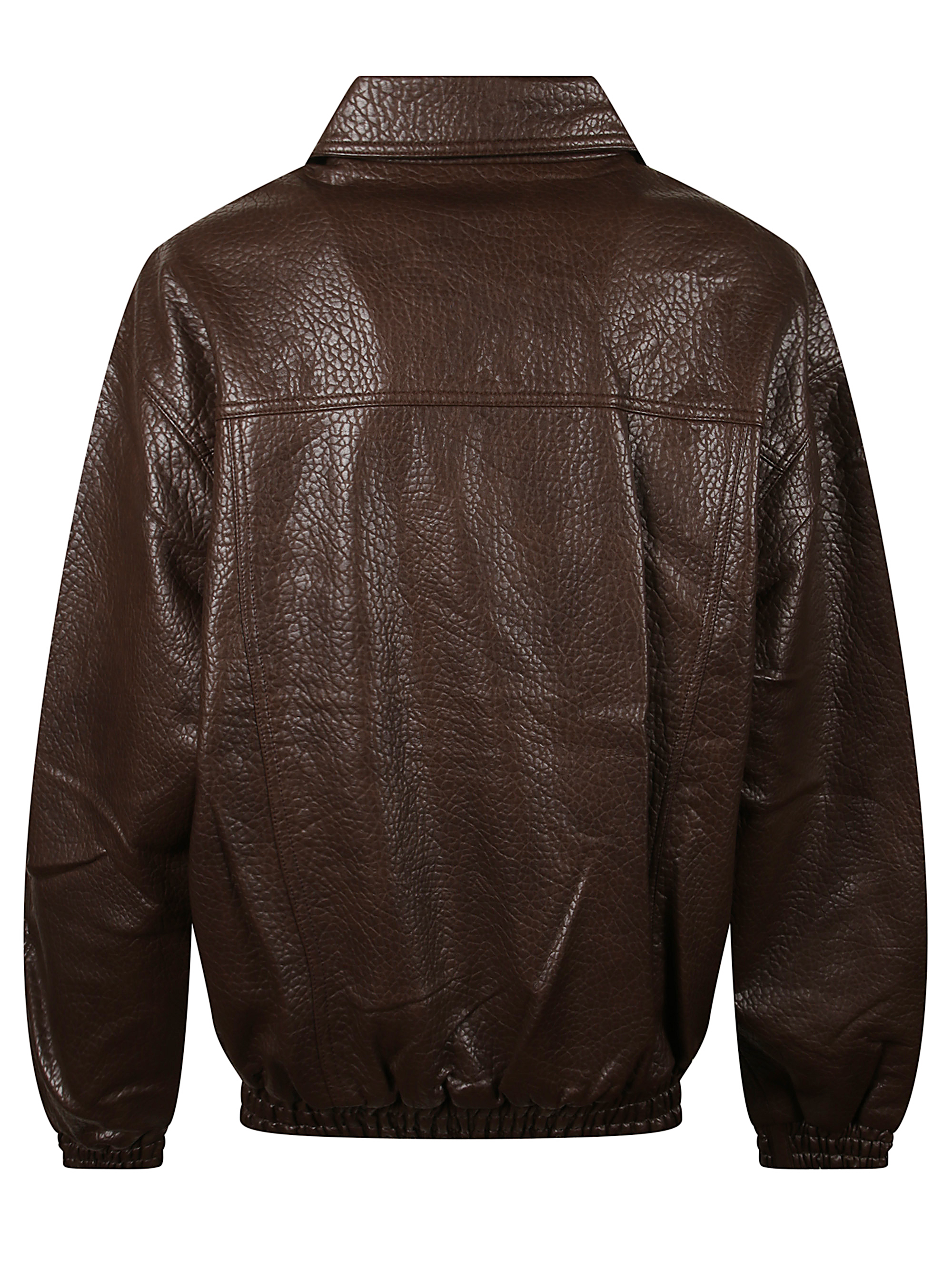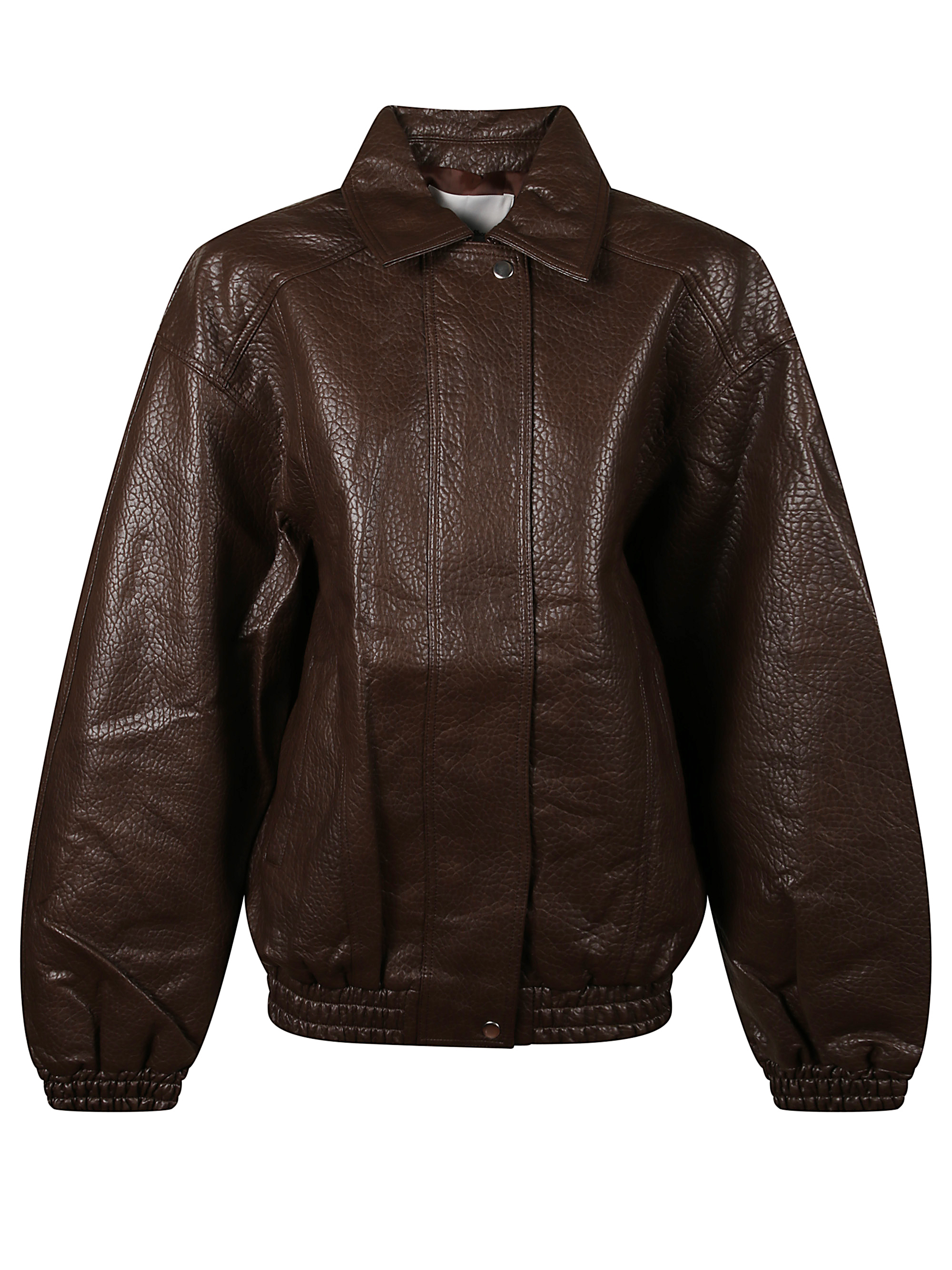 Giacca Prescott di THE FRANKIE SHOP marrone in similpelle, caratterizzata da vestibilità oversize, colletto a punta, spalle cadenti, tasche laterali, polsini arricciati, chiusura frontale con cerniera bidirezionale e bottone automatico.