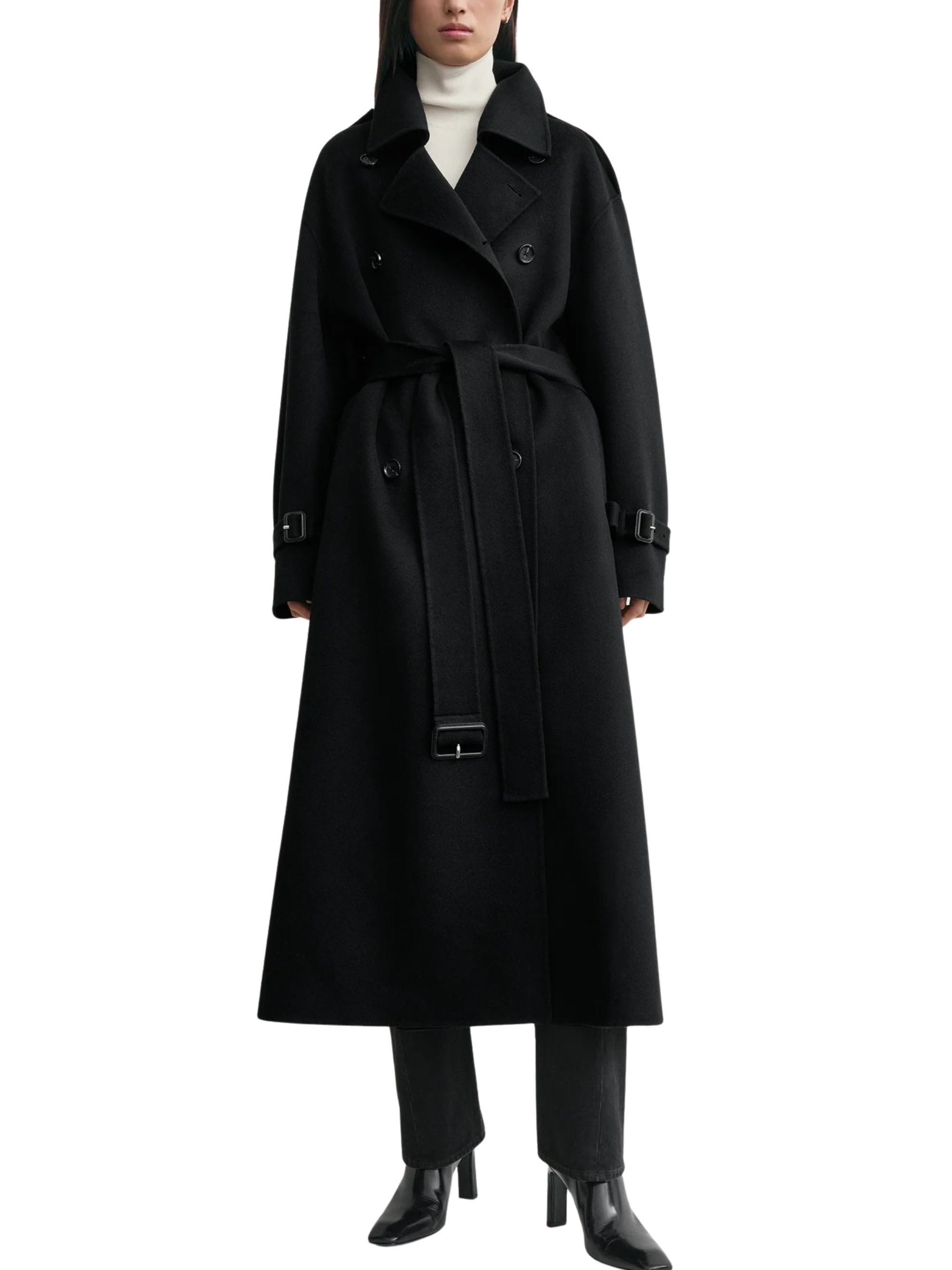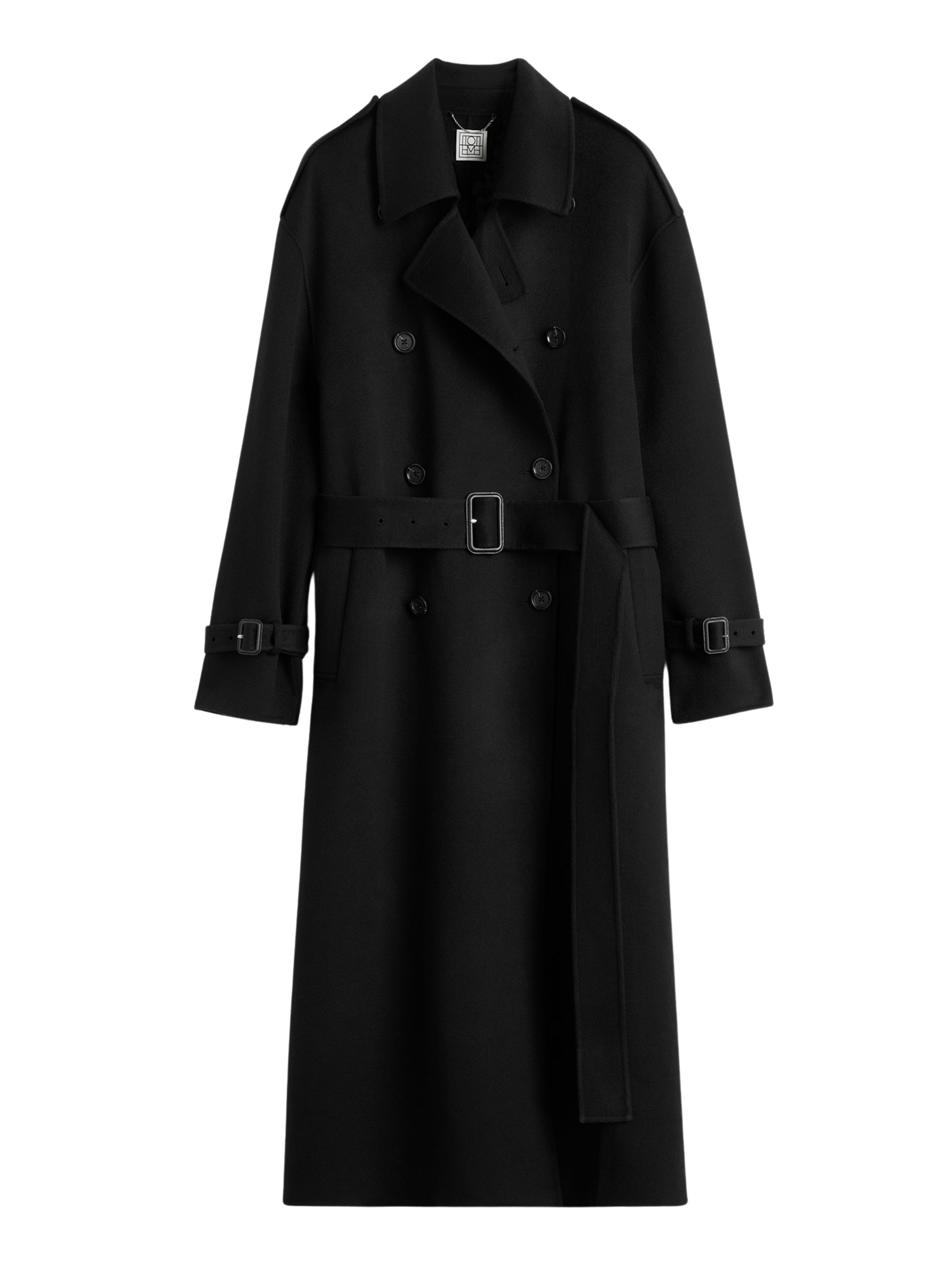 Trench invernale Doublé di TOTEME nero in lana, caratterizzato da chiusura a doppiopetto, tasche a filetto, cintura in vita con fibbia, cinturini regolabili con fibbie sui polsini e colletto revers.